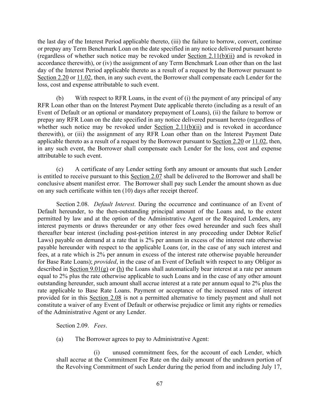 67 the last day of the Interest Period applicable thereto, (iii) the failure to borrow, convert, continue or prepay any Term Benchmark Loan on the date specified in any notice delivered pursuant hereto (regardless of whether such notice may be revoked under Section 2.11(b)(ii) and is revoked in accordance therewith), or (iv) the assignment of any Term Benchmark Loan other than on the last day of the Interest Period applicable thereto as a result of a request by the Borrower pursuant to Section 2.20 or 11.02, then, in any such event, the Borrower shall compensate each Lender for the loss, cost and expense attributable to such event. (b) With respect to RFR Loans, in the event of (i) the payment of any principal of any RFR Loan other than on the Interest Payment Date applicable thereto (including as a result of an Event of Default or an optional or mandatory prepayment of Loans), (ii) the failure to borrow or prepay any RFR Loan on the date specified in any notice delivered pursuant hereto (regardless of whether such notice may be revoked under Section 2.11(b)(ii) and is revoked in accordance therewith), or (iii) the assignment of any RFR Loan other than on the Interest Payment Date applicable thereto as a result of a request by the Borrower pursuant to Section 2.20 or 11.02, then, in any such event, the Borrower shall compensate each Lender for the loss, cost and expense attributable to such event. (c) A certificate of any Lender setting forth any amount or amounts that such Lender is entitled to receive pursuant to this Section 2.07 shall be delivered to the Borrower and shall be conclusive absent manifest error. The Borrower shall pay such Lender the amount shown as due on any such certificate within ten (10) days after receipt thereof. Section 2.08. Default Interest. During the occurrence and continuance of an Event of Default hereunder, to the then-outstanding principal amount of the Loans and, to the extent permitted by law and at the option of the Administrative Agent or the Required Lenders, any interest payments or draws thereunder or any other fees owed hereunder and such fees shall thereafter bear interest (including post-petition interest in any proceeding under Debtor Relief Laws) payable on demand at a rate that is 2% per annum in excess of the interest rate otherwise payable hereunder with respect to the applicable Loans (or, in the case of any such interest and fees, at a rate which is 2% per annum in excess of the interest rate otherwise payable hereunder for Base Rate Loans); provided, in the case of an Event of Default with respect to any Obligor as described in Section 9.01(g) or (h) the Loans shall automatically bear interest at a rate per annum equal to 2% plus the rate otherwise applicable to such Loans and in the case of any other amount outstanding hereunder, such amount shall accrue interest at a rate per annum equal to 2% plus the rate applicable to Base Rate Loans. Payment or acceptance of the increased rates of interest provided for in this Section 2.08 is not a permitted alternative to timely payment and shall not constitute a waiver of any Event of Default or otherwise prejudice or limit any rights or remedies of the Administrative Agent or any Lender. Section 2.09. Fees. (a) The Borrower agrees to pay to Administrative Agent: (i) unused commitment fees, for the account of each Lender, which shall accrue at the Commitment Fee Rate on the daily amount of the undrawn portion of the Revolving Commitment of such Lender during the period from and including July 17,