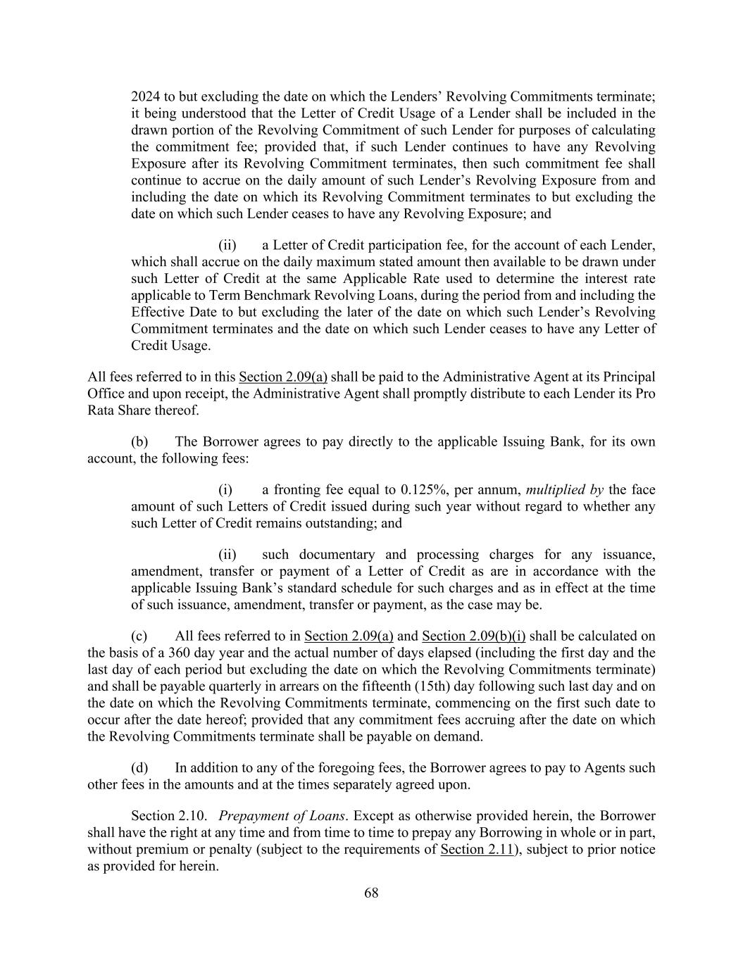68 2024 to but excluding the date on which the Lenders’ Revolving Commitments terminate; it being understood that the Letter of Credit Usage of a Lender shall be included in the drawn portion of the Revolving Commitment of such Lender for purposes of calculating the commitment fee; provided that, if such Lender continues to have any Revolving Exposure after its Revolving Commitment terminates, then such commitment fee shall continue to accrue on the daily amount of such Lender’s Revolving Exposure from and including the date on which its Revolving Commitment terminates to but excluding the date on which such Lender ceases to have any Revolving Exposure; and (ii) a Letter of Credit participation fee, for the account of each Lender, which shall accrue on the daily maximum stated amount then available to be drawn under such Letter of Credit at the same Applicable Rate used to determine the interest rate applicable to Term Benchmark Revolving Loans, during the period from and including the Effective Date to but excluding the later of the date on which such Lender’s Revolving Commitment terminates and the date on which such Lender ceases to have any Letter of Credit Usage. All fees referred to in this Section 2.09(a) shall be paid to the Administrative Agent at its Principal Office and upon receipt, the Administrative Agent shall promptly distribute to each Lender its Pro Rata Share thereof. (b) The Borrower agrees to pay directly to the applicable Issuing Bank, for its own account, the following fees: (i) a fronting fee equal to 0.125%, per annum, multiplied by the face amount of such Letters of Credit issued during such year without regard to whether any such Letter of Credit remains outstanding; and (ii) such documentary and processing charges for any issuance, amendment, transfer or payment of a Letter of Credit as are in accordance with the applicable Issuing Bank’s standard schedule for such charges and as in effect at the time of such issuance, amendment, transfer or payment, as the case may be. (c) All fees referred to in Section 2.09(a) and Section 2.09(b)(i) shall be calculated on the basis of a 360 day year and the actual number of days elapsed (including the first day and the last day of each period but excluding the date on which the Revolving Commitments terminate) and shall be payable quarterly in arrears on the fifteenth (15th) day following such last day and on the date on which the Revolving Commitments terminate, commencing on the first such date to occur after the date hereof; provided that any commitment fees accruing after the date on which the Revolving Commitments terminate shall be payable on demand. (d) In addition to any of the foregoing fees, the Borrower agrees to pay to Agents such other fees in the amounts and at the times separately agreed upon. Section 2.10. Prepayment of Loans. Except as otherwise provided herein, the Borrower shall have the right at any time and from time to time to prepay any Borrowing in whole or in part, without premium or penalty (subject to the requirements of Section 2.11), subject to prior notice as provided for herein.