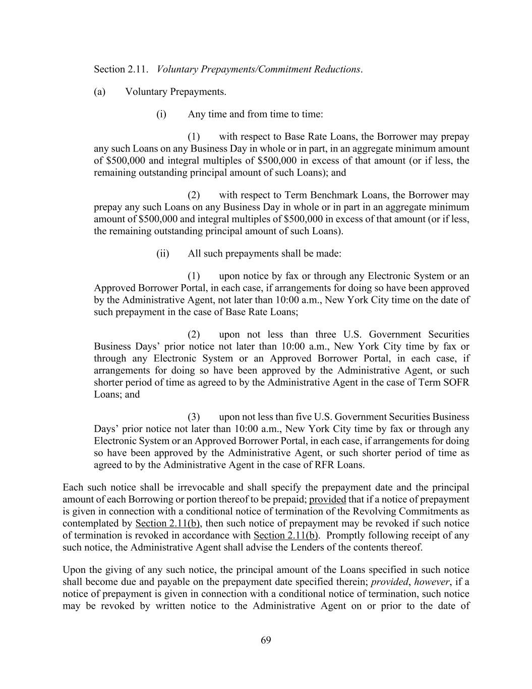 69 Section 2.11. Voluntary Prepayments/Commitment Reductions. (a) Voluntary Prepayments. (i) Any time and from time to time: (1) with respect to Base Rate Loans, the Borrower may prepay any such Loans on any Business Day in whole or in part, in an aggregate minimum amount of $500,000 and integral multiples of $500,000 in excess of that amount (or if less, the remaining outstanding principal amount of such Loans); and (2) with respect to Term Benchmark Loans, the Borrower may prepay any such Loans on any Business Day in whole or in part in an aggregate minimum amount of $500,000 and integral multiples of $500,000 in excess of that amount (or if less, the remaining outstanding principal amount of such Loans). (ii) All such prepayments shall be made: (1) upon notice by fax or through any Electronic System or an Approved Borrower Portal, in each case, if arrangements for doing so have been approved by the Administrative Agent, not later than 10:00 a.m., New York City time on the date of such prepayment in the case of Base Rate Loans; (2) upon not less than three U.S. Government Securities Business Days’ prior notice not later than 10:00 a.m., New York City time by fax or through any Electronic System or an Approved Borrower Portal, in each case, if arrangements for doing so have been approved by the Administrative Agent, or such shorter period of time as agreed to by the Administrative Agent in the case of Term SOFR Loans; and (3) upon not less than five U.S. Government Securities Business Days’ prior notice not later than 10:00 a.m., New York City time by fax or through any Electronic System or an Approved Borrower Portal, in each case, if arrangements for doing so have been approved by the Administrative Agent, or such shorter period of time as agreed to by the Administrative Agent in the case of RFR Loans. Each such notice shall be irrevocable and shall specify the prepayment date and the principal amount of each Borrowing or portion thereof to be prepaid; provided that if a notice of prepayment is given in connection with a conditional notice of termination of the Revolving Commitments as contemplated by Section 2.11(b), then such notice of prepayment may be revoked if such notice of termination is revoked in accordance with Section 2.11(b). Promptly following receipt of any such notice, the Administrative Agent shall advise the Lenders of the contents thereof. Upon the giving of any such notice, the principal amount of the Loans specified in such notice shall become due and payable on the prepayment date specified therein; provided, however, if a notice of prepayment is given in connection with a conditional notice of termination, such notice may be revoked by written notice to the Administrative Agent on or prior to the date of