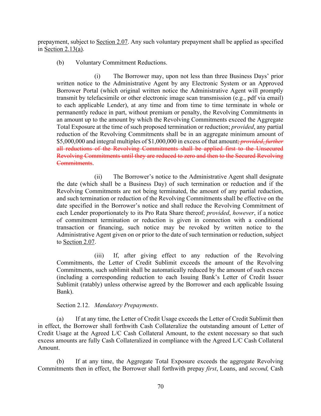 70 prepayment, subject to Section 2.07. Any such voluntary prepayment shall be applied as specified in Section 2.13(a). (b) Voluntary Commitment Reductions. (i) The Borrower may, upon not less than three Business Days’ prior written notice to the Administrative Agent by any Electronic System or an Approved Borrower Portal (which original written notice the Administrative Agent will promptly transmit by telefacsimile or other electronic image scan transmission (e.g., pdf via email) to each applicable Lender), at any time and from time to time terminate in whole or permanently reduce in part, without premium or penalty, the Revolving Commitments in an amount up to the amount by which the Revolving Commitments exceed the Aggregate Total Exposure at the time of such proposed termination or reduction; provided, any partial reduction of the Revolving Commitments shall be in an aggregate minimum amount of $5,000,000 and integral multiples of $1,000,000 in excess of that amount; provided, further all reductions of the Revolving Commitments shall be applied first to the Unsecured Revolving Commitments until they are reduced to zero and then to the Secured Revolving Commitments. (ii) The Borrower’s notice to the Administrative Agent shall designate the date (which shall be a Business Day) of such termination or reduction and if the Revolving Commitments are not being terminated, the amount of any partial reduction, and such termination or reduction of the Revolving Commitments shall be effective on the date specified in the Borrower’s notice and shall reduce the Revolving Commitment of each Lender proportionately to its Pro Rata Share thereof; provided, however, if a notice of commitment termination or reduction is given in connection with a conditional transaction or financing, such notice may be revoked by written notice to the Administrative Agent given on or prior to the date of such termination or reduction, subject to Section 2.07. (iii) If, after giving effect to any reduction of the Revolving Commitments, the Letter of Credit Sublimit exceeds the amount of the Revolving Commitments, such sublimit shall be automatically reduced by the amount of such excess (including a corresponding reduction to each Issuing Bank’s Letter of Credit Issuer Sublimit (ratably) unless otherwise agreed by the Borrower and each applicable Issuing Bank). Section 2.12. Mandatory Prepayments. (a) If at any time, the Letter of Credit Usage exceeds the Letter of Credit Sublimit then in effect, the Borrower shall forthwith Cash Collateralize the outstanding amount of Letter of Credit Usage at the Agreed L/C Cash Collateral Amount, to the extent necessary so that such excess amounts are fully Cash Collateralized in compliance with the Agreed L/C Cash Collateral Amount. (b) If at any time, the Aggregate Total Exposure exceeds the aggregate Revolving Commitments then in effect, the Borrower shall forthwith prepay first, Loans, and second, Cash