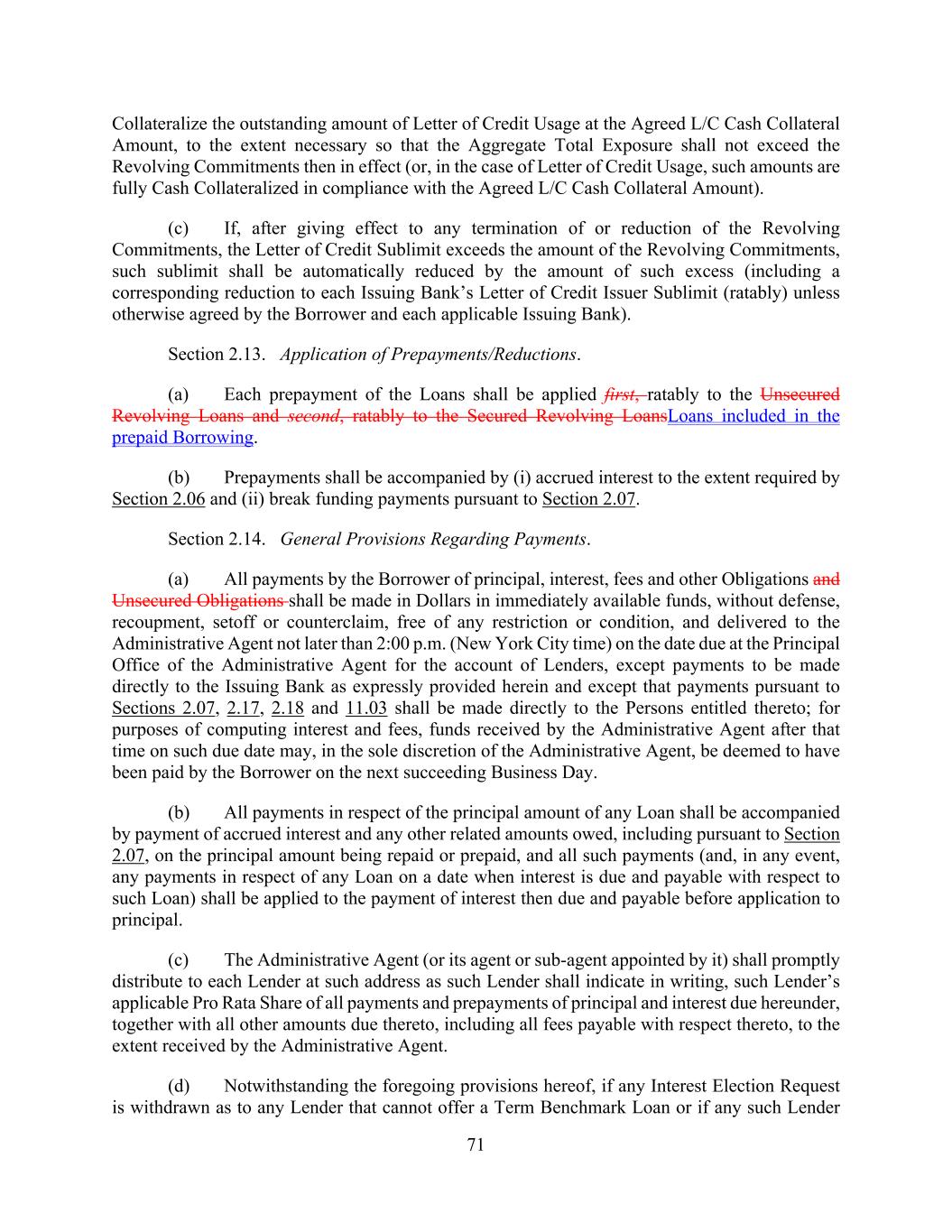71 Collateralize the outstanding amount of Letter of Credit Usage at the Agreed L/C Cash Collateral Amount, to the extent necessary so that the Aggregate Total Exposure shall not exceed the Revolving Commitments then in effect (or, in the case of Letter of Credit Usage, such amounts are fully Cash Collateralized in compliance with the Agreed L/C Cash Collateral Amount). (c) If, after giving effect to any termination of or reduction of the Revolving Commitments, the Letter of Credit Sublimit exceeds the amount of the Revolving Commitments, such sublimit shall be automatically reduced by the amount of such excess (including a corresponding reduction to each Issuing Bank’s Letter of Credit Issuer Sublimit (ratably) unless otherwise agreed by the Borrower and each applicable Issuing Bank). Section 2.13. Application of Prepayments/Reductions. (a) Each prepayment of the Loans shall be applied first, ratably to the Unsecured Revolving Loans and second, ratably to the Secured Revolving LoansLoans included in the prepaid Borrowing. (b) Prepayments shall be accompanied by (i) accrued interest to the extent required by Section 2.06 and (ii) break funding payments pursuant to Section 2.07. Section 2.14. General Provisions Regarding Payments. (a) All payments by the Borrower of principal, interest, fees and other Obligations and Unsecured Obligations shall be made in Dollars in immediately available funds, without defense, recoupment, setoff or counterclaim, free of any restriction or condition, and delivered to the Administrative Agent not later than 2:00 p.m. (New York City time) on the date due at the Principal Office of the Administrative Agent for the account of Lenders, except payments to be made directly to the Issuing Bank as expressly provided herein and except that payments pursuant to Sections 2.07, 2.17, 2.18 and 11.03 shall be made directly to the Persons entitled thereto; for purposes of computing interest and fees, funds received by the Administrative Agent after that time on such due date may, in the sole discretion of the Administrative Agent, be deemed to have been paid by the Borrower on the next succeeding Business Day. (b) All payments in respect of the principal amount of any Loan shall be accompanied by payment of accrued interest and any other related amounts owed, including pursuant to Section 2.07, on the principal amount being repaid or prepaid, and all such payments (and, in any event, any payments in respect of any Loan on a date when interest is due and payable with respect to such Loan) shall be applied to the payment of interest then due and payable before application to principal. (c) The Administrative Agent (or its agent or sub-agent appointed by it) shall promptly distribute to each Lender at such address as such Lender shall indicate in writing, such Lender’s applicable Pro Rata Share of all payments and prepayments of principal and interest due hereunder, together with all other amounts due thereto, including all fees payable with respect thereto, to the extent received by the Administrative Agent. (d) Notwithstanding the foregoing provisions hereof, if any Interest Election Request is withdrawn as to any Lender that cannot offer a Term Benchmark Loan or if any such Lender