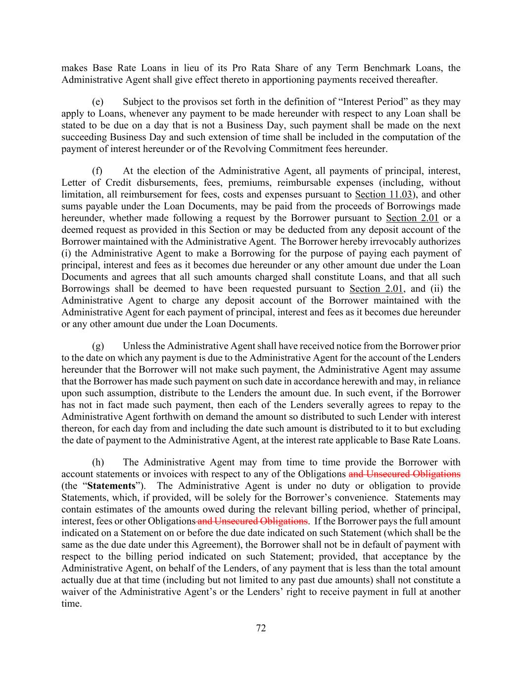 72 makes Base Rate Loans in lieu of its Pro Rata Share of any Term Benchmark Loans, the Administrative Agent shall give effect thereto in apportioning payments received thereafter. (e) Subject to the provisos set forth in the definition of “Interest Period” as they may apply to Loans, whenever any payment to be made hereunder with respect to any Loan shall be stated to be due on a day that is not a Business Day, such payment shall be made on the next succeeding Business Day and such extension of time shall be included in the computation of the payment of interest hereunder or of the Revolving Commitment fees hereunder. (f) At the election of the Administrative Agent, all payments of principal, interest, Letter of Credit disbursements, fees, premiums, reimbursable expenses (including, without limitation, all reimbursement for fees, costs and expenses pursuant to Section 11.03), and other sums payable under the Loan Documents, may be paid from the proceeds of Borrowings made hereunder, whether made following a request by the Borrower pursuant to Section 2.01 or a deemed request as provided in this Section or may be deducted from any deposit account of the Borrower maintained with the Administrative Agent. The Borrower hereby irrevocably authorizes (i) the Administrative Agent to make a Borrowing for the purpose of paying each payment of principal, interest and fees as it becomes due hereunder or any other amount due under the Loan Documents and agrees that all such amounts charged shall constitute Loans, and that all such Borrowings shall be deemed to have been requested pursuant to Section 2.01, and (ii) the Administrative Agent to charge any deposit account of the Borrower maintained with the Administrative Agent for each payment of principal, interest and fees as it becomes due hereunder or any other amount due under the Loan Documents. (g) Unless the Administrative Agent shall have received notice from the Borrower prior to the date on which any payment is due to the Administrative Agent for the account of the Lenders hereunder that the Borrower will not make such payment, the Administrative Agent may assume that the Borrower has made such payment on such date in accordance herewith and may, in reliance upon such assumption, distribute to the Lenders the amount due. In such event, if the Borrower has not in fact made such payment, then each of the Lenders severally agrees to repay to the Administrative Agent forthwith on demand the amount so distributed to such Lender with interest thereon, for each day from and including the date such amount is distributed to it to but excluding the date of payment to the Administrative Agent, at the interest rate applicable to Base Rate Loans. (h) The Administrative Agent may from time to time provide the Borrower with account statements or invoices with respect to any of the Obligations and Unsecured Obligations (the “Statements”). The Administrative Agent is under no duty or obligation to provide Statements, which, if provided, will be solely for the Borrower’s convenience. Statements may contain estimates of the amounts owed during the relevant billing period, whether of principal, interest, fees or other Obligations and Unsecured Obligations. If the Borrower pays the full amount indicated on a Statement on or before the due date indicated on such Statement (which shall be the same as the due date under this Agreement), the Borrower shall not be in default of payment with respect to the billing period indicated on such Statement; provided, that acceptance by the Administrative Agent, on behalf of the Lenders, of any payment that is less than the total amount actually due at that time (including but not limited to any past due amounts) shall not constitute a waiver of the Administrative Agent’s or the Lenders’ right to receive payment in full at another time.
