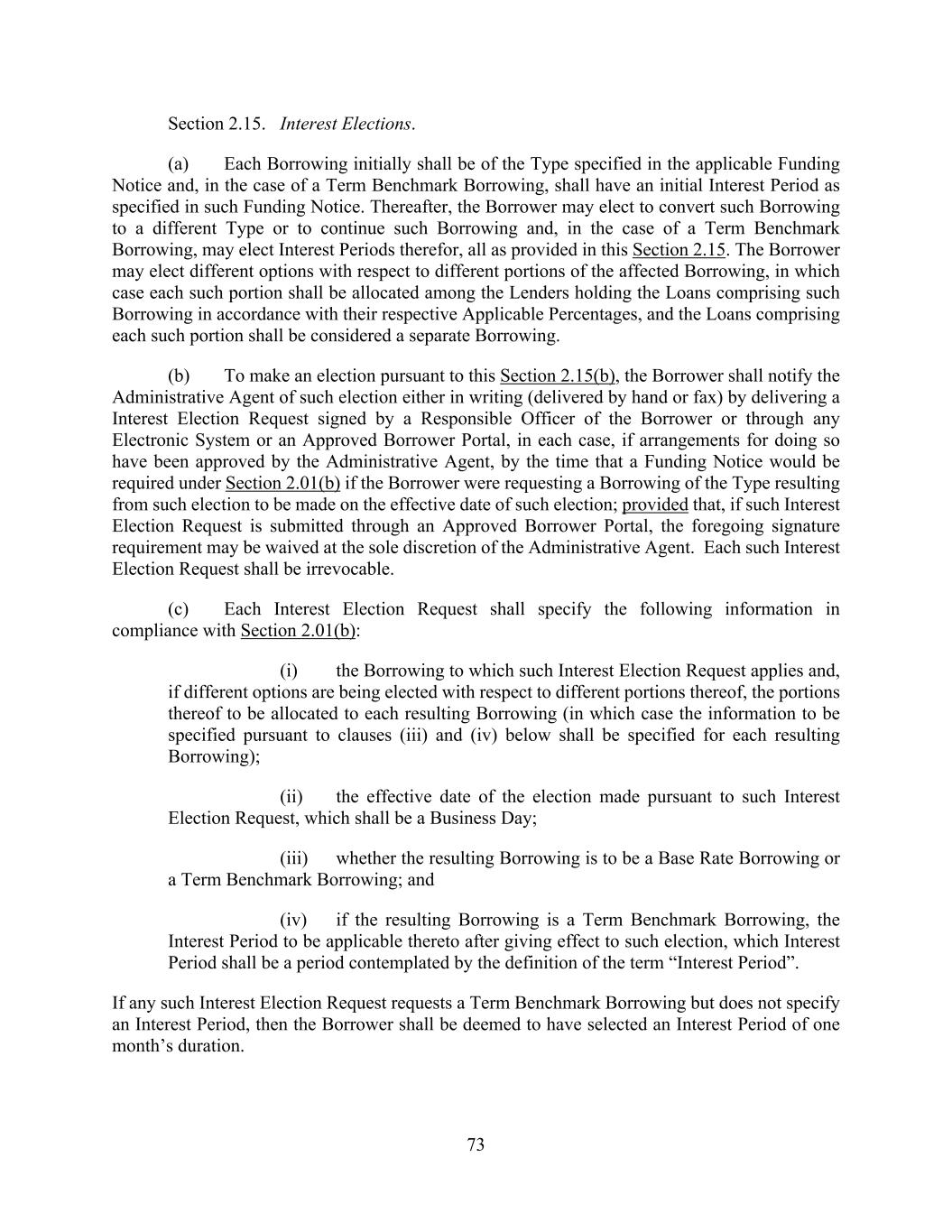73 Section 2.15. Interest Elections. (a) Each Borrowing initially shall be of the Type specified in the applicable Funding Notice and, in the case of a Term Benchmark Borrowing, shall have an initial Interest Period as specified in such Funding Notice. Thereafter, the Borrower may elect to convert such Borrowing to a different Type or to continue such Borrowing and, in the case of a Term Benchmark Borrowing, may elect Interest Periods therefor, all as provided in this Section 2.15. The Borrower may elect different options with respect to different portions of the affected Borrowing, in which case each such portion shall be allocated among the Lenders holding the Loans comprising such Borrowing in accordance with their respective Applicable Percentages, and the Loans comprising each such portion shall be considered a separate Borrowing. (b) To make an election pursuant to this Section 2.15(b), the Borrower shall notify the Administrative Agent of such election either in writing (delivered by hand or fax) by delivering a Interest Election Request signed by a Responsible Officer of the Borrower or through any Electronic System or an Approved Borrower Portal, in each case, if arrangements for doing so have been approved by the Administrative Agent, by the time that a Funding Notice would be required under Section 2.01(b) if the Borrower were requesting a Borrowing of the Type resulting from such election to be made on the effective date of such election; provided that, if such Interest Election Request is submitted through an Approved Borrower Portal, the foregoing signature requirement may be waived at the sole discretion of the Administrative Agent. Each such Interest Election Request shall be irrevocable. (c) Each Interest Election Request shall specify the following information in compliance with Section 2.01(b): (i) the Borrowing to which such Interest Election Request applies and, if different options are being elected with respect to different portions thereof, the portions thereof to be allocated to each resulting Borrowing (in which case the information to be specified pursuant to clauses (iii) and (iv) below shall be specified for each resulting Borrowing); (ii) the effective date of the election made pursuant to such Interest Election Request, which shall be a Business Day; (iii) whether the resulting Borrowing is to be a Base Rate Borrowing or a Term Benchmark Borrowing; and (iv) if the resulting Borrowing is a Term Benchmark Borrowing, the Interest Period to be applicable thereto after giving effect to such election, which Interest Period shall be a period contemplated by the definition of the term “Interest Period”. If any such Interest Election Request requests a Term Benchmark Borrowing but does not specify an Interest Period, then the Borrower shall be deemed to have selected an Interest Period of one month’s duration.