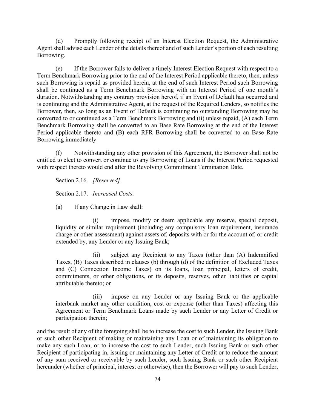 74 (d) Promptly following receipt of an Interest Election Request, the Administrative Agent shall advise each Lender of the details thereof and of such Lender’s portion of each resulting Borrowing. (e) If the Borrower fails to deliver a timely Interest Election Request with respect to a Term Benchmark Borrowing prior to the end of the Interest Period applicable thereto, then, unless such Borrowing is repaid as provided herein, at the end of such Interest Period such Borrowing shall be continued as a Term Benchmark Borrowing with an Interest Period of one month’s duration. Notwithstanding any contrary provision hereof, if an Event of Default has occurred and is continuing and the Administrative Agent, at the request of the Required Lenders, so notifies the Borrower, then, so long as an Event of Default is continuing no outstanding Borrowing may be converted to or continued as a Term Benchmark Borrowing and (ii) unless repaid, (A) each Term Benchmark Borrowing shall be converted to an Base Rate Borrowing at the end of the Interest Period applicable thereto and (B) each RFR Borrowing shall be converted to an Base Rate Borrowing immediately. (f) Notwithstanding any other provision of this Agreement, the Borrower shall not be entitled to elect to convert or continue to any Borrowing of Loans if the Interest Period requested with respect thereto would end after the Revolving Commitment Termination Date. Section 2.16. [Reserved]. Section 2.17. Increased Costs. (a) If any Change in Law shall: (i) impose, modify or deem applicable any reserve, special deposit, liquidity or similar requirement (including any compulsory loan requirement, insurance charge or other assessment) against assets of, deposits with or for the account of, or credit extended by, any Lender or any Issuing Bank; (ii) subject any Recipient to any Taxes (other than (A) Indemnified Taxes, (B) Taxes described in clauses (b) through (d) of the definition of Excluded Taxes and (C) Connection Income Taxes) on its loans, loan principal, letters of credit, commitments, or other obligations, or its deposits, reserves, other liabilities or capital attributable thereto; or (iii) impose on any Lender or any Issuing Bank or the applicable interbank market any other condition, cost or expense (other than Taxes) affecting this Agreement or Term Benchmark Loans made by such Lender or any Letter of Credit or participation therein; and the result of any of the foregoing shall be to increase the cost to such Lender, the Issuing Bank or such other Recipient of making or maintaining any Loan or of maintaining its obligation to make any such Loan, or to increase the cost to such Lender, such Issuing Bank or such other Recipient of participating in, issuing or maintaining any Letter of Credit or to reduce the amount of any sum received or receivable by such Lender, such Issuing Bank or such other Recipient hereunder (whether of principal, interest or otherwise), then the Borrower will pay to such Lender,