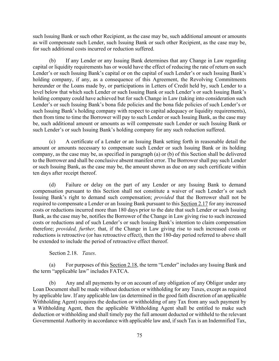 75 such Issuing Bank or such other Recipient, as the case may be, such additional amount or amounts as will compensate such Lender, such Issuing Bank or such other Recipient, as the case may be, for such additional costs incurred or reduction suffered. (b) If any Lender or any Issuing Bank determines that any Change in Law regarding capital or liquidity requirements has or would have the effect of reducing the rate of return on such Lender’s or such Issuing Bank’s capital or on the capital of such Lender’s or such Issuing Bank’s holding company, if any, as a consequence of this Agreement, the Revolving Commitments hereunder or the Loans made by, or participations in Letters of Credit held by, such Lender to a level below that which such Lender or such Issuing Bank or such Lender’s or such Issuing Bank’s holding company could have achieved but for such Change in Law (taking into consideration such Lender’s or such Issuing Bank’s bona fide policies and the bona fide policies of such Lender’s or such Issuing Bank’s holding company with respect to capital adequacy or liquidity requirements), then from time to time the Borrower will pay to such Lender or such Issuing Bank, as the case may be, such additional amount or amounts as will compensate such Lender or such Issuing Bank or such Lender’s or such Issuing Bank’s holding company for any such reduction suffered. (c) A certificate of a Lender or an Issuing Bank setting forth in reasonable detail the amount or amounts necessary to compensate such Lender or such Issuing Bank or its holding company, as the case may be, as specified in paragraph (a) or (b) of this Section shall be delivered to the Borrower and shall be conclusive absent manifest error. The Borrower shall pay such Lender or such Issuing Bank, as the case may be, the amount shown as due on any such certificate within ten days after receipt thereof. (d) Failure or delay on the part of any Lender or any Issuing Bank to demand compensation pursuant to this Section shall not constitute a waiver of such Lender’s or such Issuing Bank’s right to demand such compensation; provided that the Borrower shall not be required to compensate a Lender or an Issuing Bank pursuant to this Section 2.17 for any increased costs or reductions incurred more than 180 days prior to the date that such Lender or such Issuing Bank, as the case may be, notifies the Borrower of the Change in Law giving rise to such increased costs or reductions and of such Lender’s or such Issuing Bank’s intention to claim compensation therefore; provided, further, that, if the Change in Law giving rise to such increased costs or reductions is retroactive (or has retroactive effect), then the 180-day period referred to above shall be extended to include the period of retroactive effect thereof. Section 2.18. Taxes. (a) For purposes of this Section 2.18, the term “Lender” includes any Issuing Bank and the term “applicable law” includes FATCA. (b) Any and all payments by or on account of any obligation of any Obligor under any Loan Document shall be made without deduction or withholding for any Taxes, except as required by applicable law. If any applicable law (as determined in the good faith discretion of an applicable Withholding Agent) requires the deduction or withholding of any Tax from any such payment by a Withholding Agent, then the applicable Withholding Agent shall be entitled to make such deduction or withholding and shall timely pay the full amount deducted or withheld to the relevant Governmental Authority in accordance with applicable law and, if such Tax is an Indemnified Tax,