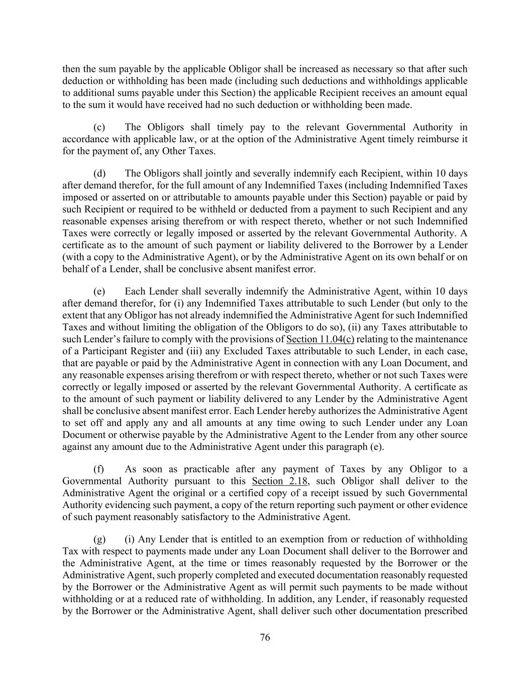 76 then the sum payable by the applicable Obligor shall be increased as necessary so that after such deduction or withholding has been made (including such deductions and withholdings applicable to additional sums payable under this Section) the applicable Recipient receives an amount equal to the sum it would have received had no such deduction or withholding been made. (c) The Obligors shall timely pay to the relevant Governmental Authority in accordance with applicable law, or at the option of the Administrative Agent timely reimburse it for the payment of, any Other Taxes. (d) The Obligors shall jointly and severally indemnify each Recipient, within 10 days after demand therefor, for the full amount of any Indemnified Taxes (including Indemnified Taxes imposed or asserted on or attributable to amounts payable under this Section) payable or paid by such Recipient or required to be withheld or deducted from a payment to such Recipient and any reasonable expenses arising therefrom or with respect thereto, whether or not such Indemnified Taxes were correctly or legally imposed or asserted by the relevant Governmental Authority. A certificate as to the amount of such payment or liability delivered to the Borrower by a Lender (with a copy to the Administrative Agent), or by the Administrative Agent on its own behalf or on behalf of a Lender, shall be conclusive absent manifest error. (e) Each Lender shall severally indemnify the Administrative Agent, within 10 days after demand therefor, for (i) any Indemnified Taxes attributable to such Lender (but only to the extent that any Obligor has not already indemnified the Administrative Agent for such Indemnified Taxes and without limiting the obligation of the Obligors to do so), (ii) any Taxes attributable to such Lender’s failure to comply with the provisions of Section 11.04(c) relating to the maintenance of a Participant Register and (iii) any Excluded Taxes attributable to such Lender, in each case, that are payable or paid by the Administrative Agent in connection with any Loan Document, and any reasonable expenses arising therefrom or with respect thereto, whether or not such Taxes were correctly or legally imposed or asserted by the relevant Governmental Authority. A certificate as to the amount of such payment or liability delivered to any Lender by the Administrative Agent shall be conclusive absent manifest error. Each Lender hereby authorizes the Administrative Agent to set off and apply any and all amounts at any time owing to such Lender under any Loan Document or otherwise payable by the Administrative Agent to the Lender from any other source against any amount due to the Administrative Agent under this paragraph (e). (f) As soon as practicable after any payment of Taxes by any Obligor to a Governmental Authority pursuant to this Section 2.18, such Obligor shall deliver to the Administrative Agent the original or a certified copy of a receipt issued by such Governmental Authority evidencing such payment, a copy of the return reporting such payment or other evidence of such payment reasonably satisfactory to the Administrative Agent. (g) (i) Any Lender that is entitled to an exemption from or reduction of withholding Tax with respect to payments made under any Loan Document shall deliver to the Borrower and the Administrative Agent, at the time or times reasonably requested by the Borrower or the Administrative Agent, such properly completed and executed documentation reasonably requested by the Borrower or the Administrative Agent as will permit such payments to be made without withholding or at a reduced rate of withholding. In addition, any Lender, if reasonably requested by the Borrower or the Administrative Agent, shall deliver such other documentation prescribed