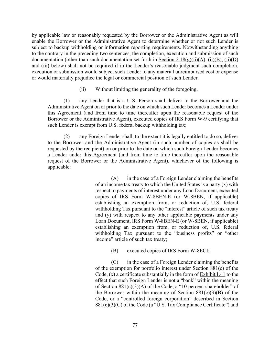 77 by applicable law or reasonably requested by the Borrower or the Administrative Agent as will enable the Borrower or the Administrative Agent to determine whether or not such Lender is subject to backup withholding or information reporting requirements. Notwithstanding anything to the contrary in the preceding two sentences, the completion, execution and submission of such documentation (other than such documentation set forth in Section 2.18(g)(ii)(A), (ii)(B), (ii)(D) and (iii) below) shall not be required if in the Lender’s reasonable judgment such completion, execution or submission would subject such Lender to any material unreimbursed cost or expense or would materially prejudice the legal or commercial position of such Lender. (ii) Without limiting the generality of the foregoing, (1) any Lender that is a U.S. Person shall deliver to the Borrower and the Administrative Agent on or prior to the date on which such Lender becomes a Lender under this Agreement (and from time to time thereafter upon the reasonable request of the Borrower or the Administrative Agent), executed copies of IRS Form W-9 certifying that such Lender is exempt from U.S. federal backup withholding tax; (2) any Foreign Lender shall, to the extent it is legally entitled to do so, deliver to the Borrower and the Administrative Agent (in such number of copies as shall be requested by the recipient) on or prior to the date on which such Foreign Lender becomes a Lender under this Agreement (and from time to time thereafter upon the reasonable request of the Borrower or the Administrative Agent), whichever of the following is applicable: (A) in the case of a Foreign Lender claiming the benefits of an income tax treaty to which the United States is a party (x) with respect to payments of interest under any Loan Document, executed copies of IRS Form W-8BEN-E (or W-8BEN, if applicable) establishing an exemption from, or reduction of, U.S. federal withholding Tax pursuant to the “interest” article of such tax treaty and (y) with respect to any other applicable payments under any Loan Document, IRS Form W-8BEN-E (or W-8BEN, if applicable) establishing an exemption from, or reduction of, U.S. federal withholding Tax pursuant to the “business profits” or “other income” article of such tax treaty; (B) executed copies of IRS Form W-8ECI; (C) in the case of a Foreign Lender claiming the benefits of the exemption for portfolio interest under Section 881(c) of the Code, (x) a certificate substantially in the form of Exhibit L- 1 to the effect that such Foreign Lender is not a “bank” within the meaning of Section 881(c)(3)(A) of the Code, a “10 percent shareholder” of the Borrower within the meaning of Section 881(c)(3)(B) of the Code, or a “controlled foreign corporation” described in Section 881(c)(3)(C) of the Code (a “U.S. Tax Compliance Certificate”) and