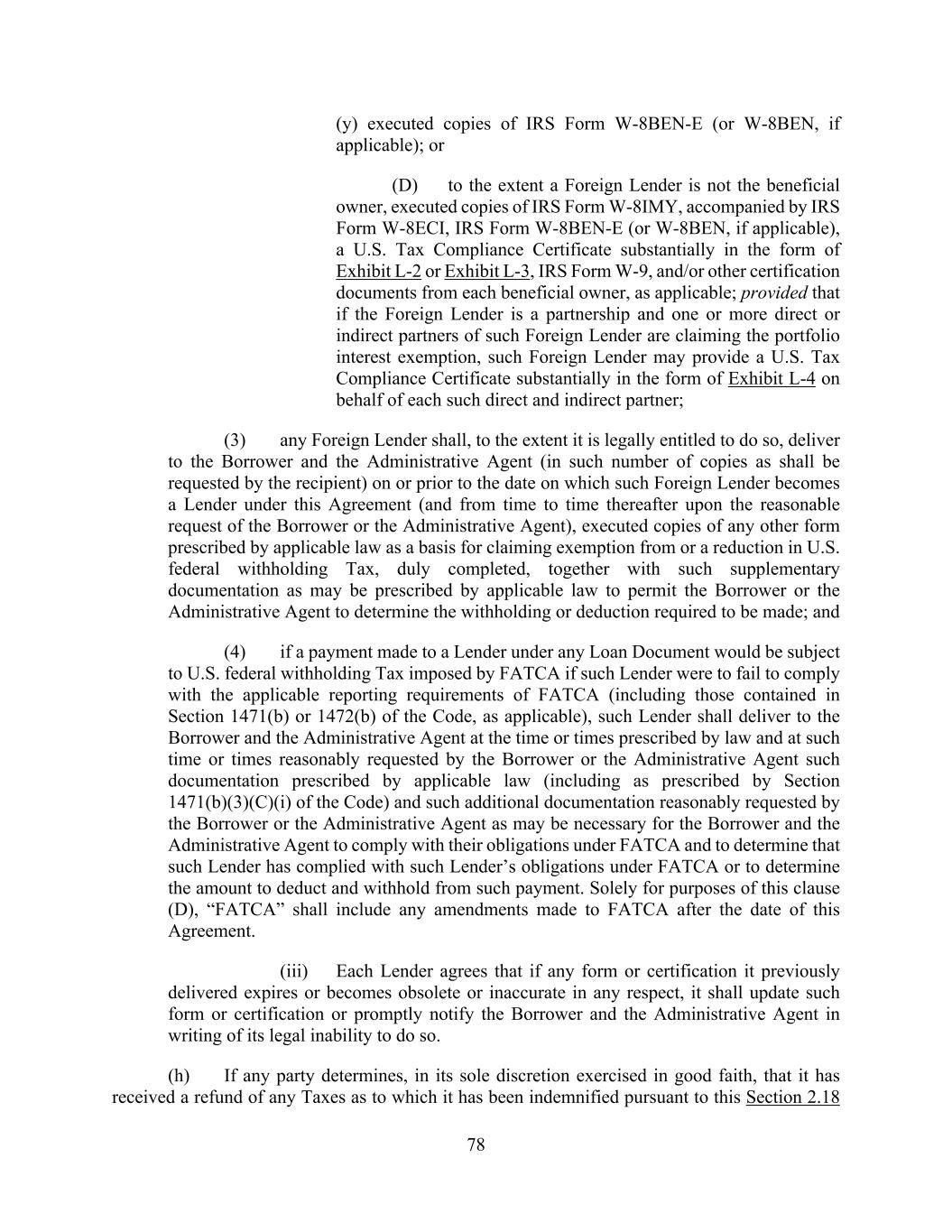 78 (y) executed copies of IRS Form W-8BEN-E (or W-8BEN, if applicable); or (D) to the extent a Foreign Lender is not the beneficial owner, executed copies of IRS Form W-8IMY, accompanied by IRS Form W-8ECI, IRS Form W-8BEN-E (or W-8BEN, if applicable), a U.S. Tax Compliance Certificate substantially in the form of Exhibit L-2 or Exhibit L-3, IRS Form W-9, and/or other certification documents from each beneficial owner, as applicable; provided that if the Foreign Lender is a partnership and one or more direct or indirect partners of such Foreign Lender are claiming the portfolio interest exemption, such Foreign Lender may provide a U.S. Tax Compliance Certificate substantially in the form of Exhibit L-4 on behalf of each such direct and indirect partner; (3) any Foreign Lender shall, to the extent it is legally entitled to do so, deliver to the Borrower and the Administrative Agent (in such number of copies as shall be requested by the recipient) on or prior to the date on which such Foreign Lender becomes a Lender under this Agreement (and from time to time thereafter upon the reasonable request of the Borrower or the Administrative Agent), executed copies of any other form prescribed by applicable law as a basis for claiming exemption from or a reduction in U.S. federal withholding Tax, duly completed, together with such supplementary documentation as may be prescribed by applicable law to permit the Borrower or the Administrative Agent to determine the withholding or deduction required to be made; and (4) if a payment made to a Lender under any Loan Document would be subject to U.S. federal withholding Tax imposed by FATCA if such Lender were to fail to comply with the applicable reporting requirements of FATCA (including those contained in Section 1471(b) or 1472(b) of the Code, as applicable), such Lender shall deliver to the Borrower and the Administrative Agent at the time or times prescribed by law and at such time or times reasonably requested by the Borrower or the Administrative Agent such documentation prescribed by applicable law (including as prescribed by Section 1471(b)(3)(C)(i) of the Code) and such additional documentation reasonably requested by the Borrower or the Administrative Agent as may be necessary for the Borrower and the Administrative Agent to comply with their obligations under FATCA and to determine that such Lender has complied with such Lender’s obligations under FATCA or to determine the amount to deduct and withhold from such payment. Solely for purposes of this clause (D), “FATCA” shall include any amendments made to FATCA after the date of this Agreement. (iii) Each Lender agrees that if any form or certification it previously delivered expires or becomes obsolete or inaccurate in any respect, it shall update such form or certification or promptly notify the Borrower and the Administrative Agent in writing of its legal inability to do so. (h) If any party determines, in its sole discretion exercised in good faith, that it has received a refund of any Taxes as to which it has been indemnified pursuant to this Section 2.18