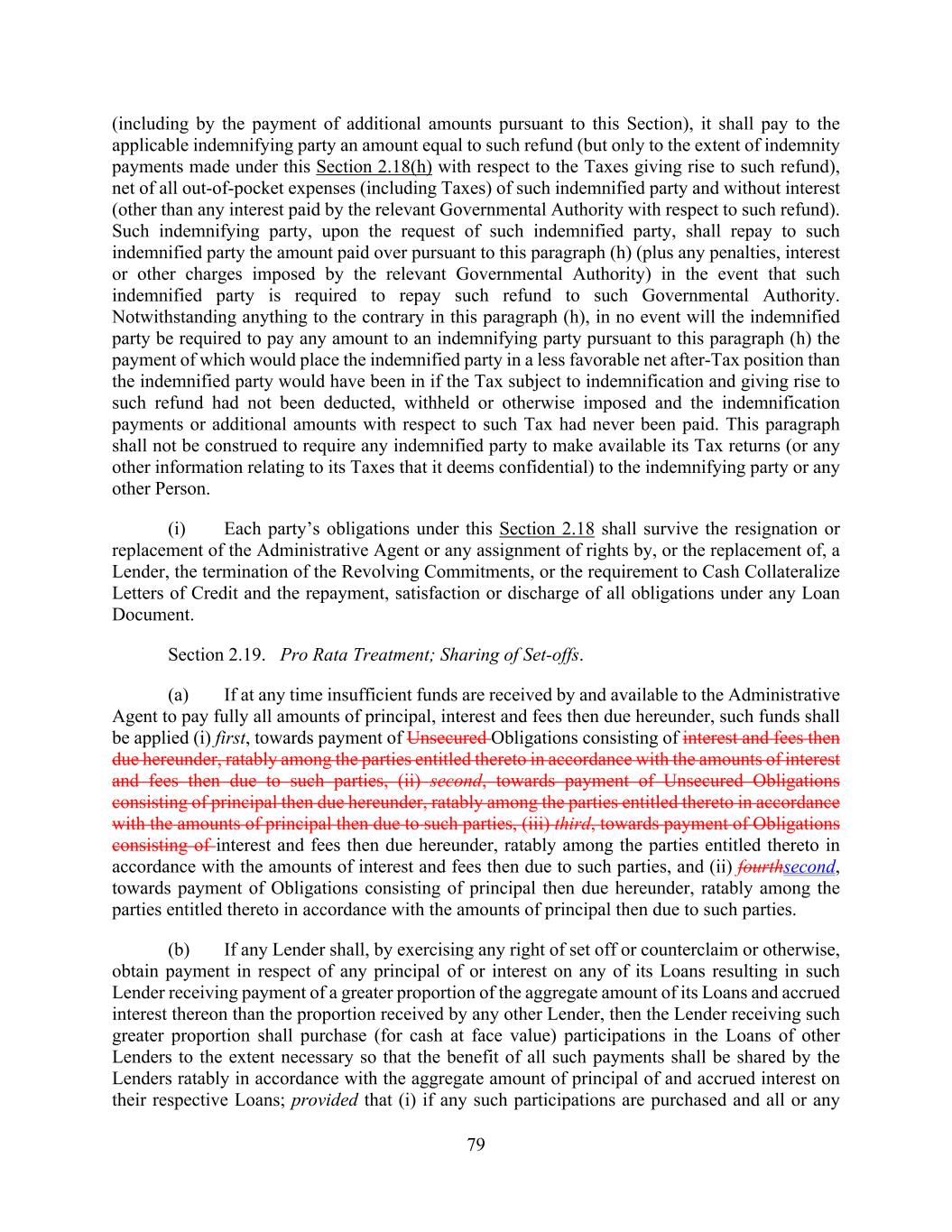 79 (including by the payment of additional amounts pursuant to this Section), it shall pay to the applicable indemnifying party an amount equal to such refund (but only to the extent of indemnity payments made under this Section 2.18(h) with respect to the Taxes giving rise to such refund), net of all out-of-pocket expenses (including Taxes) of such indemnified party and without interest (other than any interest paid by the relevant Governmental Authority with respect to such refund). Such indemnifying party, upon the request of such indemnified party, shall repay to such indemnified party the amount paid over pursuant to this paragraph (h) (plus any penalties, interest or other charges imposed by the relevant Governmental Authority) in the event that such indemnified party is required to repay such refund to such Governmental Authority. Notwithstanding anything to the contrary in this paragraph (h), in no event will the indemnified party be required to pay any amount to an indemnifying party pursuant to this paragraph (h) the payment of which would place the indemnified party in a less favorable net after-Tax position than the indemnified party would have been in if the Tax subject to indemnification and giving rise to such refund had not been deducted, withheld or otherwise imposed and the indemnification payments or additional amounts with respect to such Tax had never been paid. This paragraph shall not be construed to require any indemnified party to make available its Tax returns (or any other information relating to its Taxes that it deems confidential) to the indemnifying party or any other Person. (i) Each party’s obligations under this Section 2.18 shall survive the resignation or replacement of the Administrative Agent or any assignment of rights by, or the replacement of, a Lender, the termination of the Revolving Commitments, or the requirement to Cash Collateralize Letters of Credit and the repayment, satisfaction or discharge of all obligations under any Loan Document. Section 2.19. Pro Rata Treatment; Sharing of Set-offs. (a) If at any time insufficient funds are received by and available to the Administrative Agent to pay fully all amounts of principal, interest and fees then due hereunder, such funds shall be applied (i) first, towards payment of Unsecured Obligations consisting of interest and fees then due hereunder, ratably among the parties entitled thereto in accordance with the amounts of interest and fees then due to such parties, (ii) second, towards payment of Unsecured Obligations consisting of principal then due hereunder, ratably among the parties entitled thereto in accordance with the amounts of principal then due to such parties, (iii) third, towards payment of Obligations consisting of interest and fees then due hereunder, ratably among the parties entitled thereto in accordance with the amounts of interest and fees then due to such parties, and (ii) fourthsecond, towards payment of Obligations consisting of principal then due hereunder, ratably among the parties entitled thereto in accordance with the amounts of principal then due to such parties. (b) If any Lender shall, by exercising any right of set off or counterclaim or otherwise, obtain payment in respect of any principal of or interest on any of its Loans resulting in such Lender receiving payment of a greater proportion of the aggregate amount of its Loans and accrued interest thereon than the proportion received by any other Lender, then the Lender receiving such greater proportion shall purchase (for cash at face value) participations in the Loans of other Lenders to the extent necessary so that the benefit of all such payments shall be shared by the Lenders ratably in accordance with the aggregate amount of principal of and accrued interest on their respective Loans; provided that (i) if any such participations are purchased and all or any