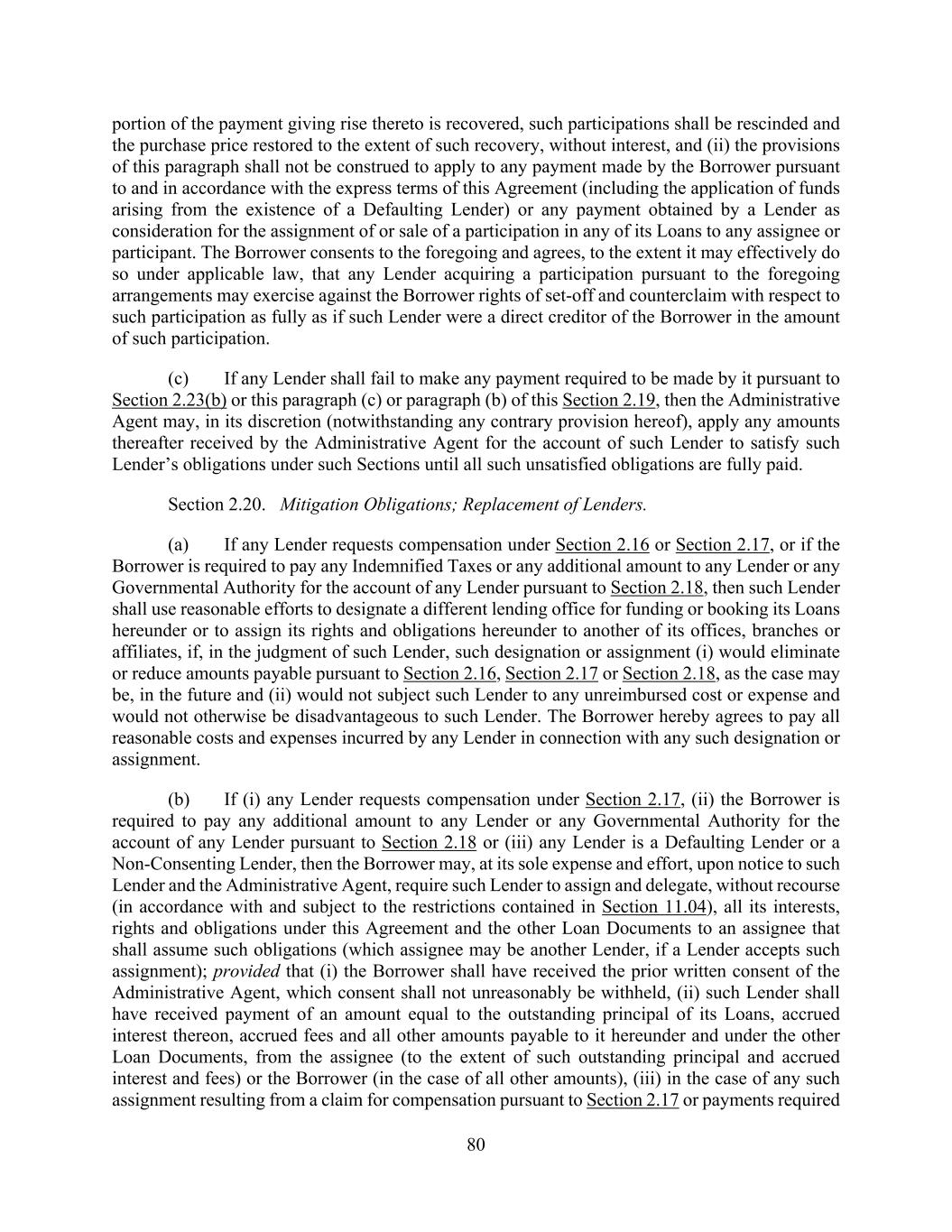80 portion of the payment giving rise thereto is recovered, such participations shall be rescinded and the purchase price restored to the extent of such recovery, without interest, and (ii) the provisions of this paragraph shall not be construed to apply to any payment made by the Borrower pursuant to and in accordance with the express terms of this Agreement (including the application of funds arising from the existence of a Defaulting Lender) or any payment obtained by a Lender as consideration for the assignment of or sale of a participation in any of its Loans to any assignee or participant. The Borrower consents to the foregoing and agrees, to the extent it may effectively do so under applicable law, that any Lender acquiring a participation pursuant to the foregoing arrangements may exercise against the Borrower rights of set-off and counterclaim with respect to such participation as fully as if such Lender were a direct creditor of the Borrower in the amount of such participation. (c) If any Lender shall fail to make any payment required to be made by it pursuant to Section 2.23(b) or this paragraph (c) or paragraph (b) of this Section 2.19, then the Administrative Agent may, in its discretion (notwithstanding any contrary provision hereof), apply any amounts thereafter received by the Administrative Agent for the account of such Lender to satisfy such Lender’s obligations under such Sections until all such unsatisfied obligations are fully paid. Section 2.20. Mitigation Obligations; Replacement of Lenders. (a) If any Lender requests compensation under Section 2.16 or Section 2.17, or if the Borrower is required to pay any Indemnified Taxes or any additional amount to any Lender or any Governmental Authority for the account of any Lender pursuant to Section 2.18, then such Lender shall use reasonable efforts to designate a different lending office for funding or booking its Loans hereunder or to assign its rights and obligations hereunder to another of its offices, branches or affiliates, if, in the judgment of such Lender, such designation or assignment (i) would eliminate or reduce amounts payable pursuant to Section 2.16, Section 2.17 or Section 2.18, as the case may be, in the future and (ii) would not subject such Lender to any unreimbursed cost or expense and would not otherwise be disadvantageous to such Lender. The Borrower hereby agrees to pay all reasonable costs and expenses incurred by any Lender in connection with any such designation or assignment. (b) If (i) any Lender requests compensation under Section 2.17, (ii) the Borrower is required to pay any additional amount to any Lender or any Governmental Authority for the account of any Lender pursuant to Section 2.18 or (iii) any Lender is a Defaulting Lender or a Non-Consenting Lender, then the Borrower may, at its sole expense and effort, upon notice to such Lender and the Administrative Agent, require such Lender to assign and delegate, without recourse (in accordance with and subject to the restrictions contained in Section 11.04), all its interests, rights and obligations under this Agreement and the other Loan Documents to an assignee that shall assume such obligations (which assignee may be another Lender, if a Lender accepts such assignment); provided that (i) the Borrower shall have received the prior written consent of the Administrative Agent, which consent shall not unreasonably be withheld, (ii) such Lender shall have received payment of an amount equal to the outstanding principal of its Loans, accrued interest thereon, accrued fees and all other amounts payable to it hereunder and under the other Loan Documents, from the assignee (to the extent of such outstanding principal and accrued interest and fees) or the Borrower (in the case of all other amounts), (iii) in the case of any such assignment resulting from a claim for compensation pursuant to Section 2.17 or payments required