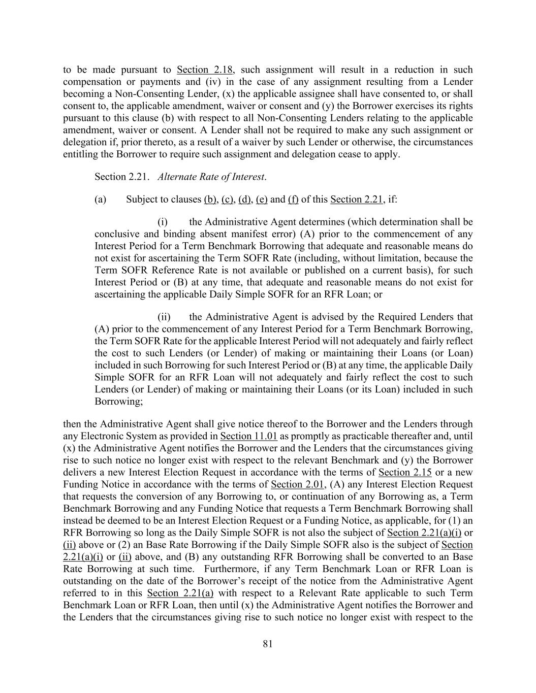 81 to be made pursuant to Section 2.18, such assignment will result in a reduction in such compensation or payments and (iv) in the case of any assignment resulting from a Lender becoming a Non-Consenting Lender, (x) the applicable assignee shall have consented to, or shall consent to, the applicable amendment, waiver or consent and (y) the Borrower exercises its rights pursuant to this clause (b) with respect to all Non-Consenting Lenders relating to the applicable amendment, waiver or consent. A Lender shall not be required to make any such assignment or delegation if, prior thereto, as a result of a waiver by such Lender or otherwise, the circumstances entitling the Borrower to require such assignment and delegation cease to apply. Section 2.21. Alternate Rate of Interest. (a) Subject to clauses (b), (c), (d), (e) and (f) of this Section 2.21, if: (i) the Administrative Agent determines (which determination shall be conclusive and binding absent manifest error) (A) prior to the commencement of any Interest Period for a Term Benchmark Borrowing that adequate and reasonable means do not exist for ascertaining the Term SOFR Rate (including, without limitation, because the Term SOFR Reference Rate is not available or published on a current basis), for such Interest Period or (B) at any time, that adequate and reasonable means do not exist for ascertaining the applicable Daily Simple SOFR for an RFR Loan; or (ii) the Administrative Agent is advised by the Required Lenders that (A) prior to the commencement of any Interest Period for a Term Benchmark Borrowing, the Term SOFR Rate for the applicable Interest Period will not adequately and fairly reflect the cost to such Lenders (or Lender) of making or maintaining their Loans (or Loan) included in such Borrowing for such Interest Period or (B) at any time, the applicable Daily Simple SOFR for an RFR Loan will not adequately and fairly reflect the cost to such Lenders (or Lender) of making or maintaining their Loans (or its Loan) included in such Borrowing; then the Administrative Agent shall give notice thereof to the Borrower and the Lenders through any Electronic System as provided in Section 11.01 as promptly as practicable thereafter and, until (x) the Administrative Agent notifies the Borrower and the Lenders that the circumstances giving rise to such notice no longer exist with respect to the relevant Benchmark and (y) the Borrower delivers a new Interest Election Request in accordance with the terms of Section 2.15 or a new Funding Notice in accordance with the terms of Section 2.01, (A) any Interest Election Request that requests the conversion of any Borrowing to, or continuation of any Borrowing as, a Term Benchmark Borrowing and any Funding Notice that requests a Term Benchmark Borrowing shall instead be deemed to be an Interest Election Request or a Funding Notice, as applicable, for (1) an RFR Borrowing so long as the Daily Simple SOFR is not also the subject of Section 2.21(a)(i) or (ii) above or (2) an Base Rate Borrowing if the Daily Simple SOFR also is the subject of Section 2.21(a)(i) or (ii) above, and (B) any outstanding RFR Borrowing shall be converted to an Base Rate Borrowing at such time. Furthermore, if any Term Benchmark Loan or RFR Loan is outstanding on the date of the Borrower’s receipt of the notice from the Administrative Agent referred to in this Section 2.21(a) with respect to a Relevant Rate applicable to such Term Benchmark Loan or RFR Loan, then until (x) the Administrative Agent notifies the Borrower and the Lenders that the circumstances giving rise to such notice no longer exist with respect to the
