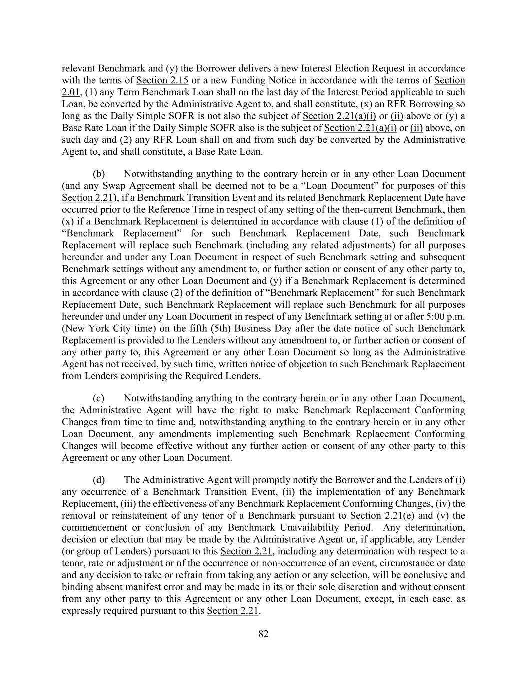 82 relevant Benchmark and (y) the Borrower delivers a new Interest Election Request in accordance with the terms of Section 2.15 or a new Funding Notice in accordance with the terms of Section 2.01, (1) any Term Benchmark Loan shall on the last day of the Interest Period applicable to such Loan, be converted by the Administrative Agent to, and shall constitute, (x) an RFR Borrowing so long as the Daily Simple SOFR is not also the subject of Section 2.21(a)(i) or (ii) above or (y) a Base Rate Loan if the Daily Simple SOFR also is the subject of Section 2.21(a)(i) or (ii) above, on such day and (2) any RFR Loan shall on and from such day be converted by the Administrative Agent to, and shall constitute, a Base Rate Loan. (b) Notwithstanding anything to the contrary herein or in any other Loan Document (and any Swap Agreement shall be deemed not to be a “Loan Document” for purposes of this Section 2.21), if a Benchmark Transition Event and its related Benchmark Replacement Date have occurred prior to the Reference Time in respect of any setting of the then-current Benchmark, then (x) if a Benchmark Replacement is determined in accordance with clause (1) of the definition of “Benchmark Replacement” for such Benchmark Replacement Date, such Benchmark Replacement will replace such Benchmark (including any related adjustments) for all purposes hereunder and under any Loan Document in respect of such Benchmark setting and subsequent Benchmark settings without any amendment to, or further action or consent of any other party to, this Agreement or any other Loan Document and (y) if a Benchmark Replacement is determined in accordance with clause (2) of the definition of “Benchmark Replacement” for such Benchmark Replacement Date, such Benchmark Replacement will replace such Benchmark for all purposes hereunder and under any Loan Document in respect of any Benchmark setting at or after 5:00 p.m. (New York City time) on the fifth (5th) Business Day after the date notice of such Benchmark Replacement is provided to the Lenders without any amendment to, or further action or consent of any other party to, this Agreement or any other Loan Document so long as the Administrative Agent has not received, by such time, written notice of objection to such Benchmark Replacement from Lenders comprising the Required Lenders. (c) Notwithstanding anything to the contrary herein or in any other Loan Document, the Administrative Agent will have the right to make Benchmark Replacement Conforming Changes from time to time and, notwithstanding anything to the contrary herein or in any other Loan Document, any amendments implementing such Benchmark Replacement Conforming Changes will become effective without any further action or consent of any other party to this Agreement or any other Loan Document. (d) The Administrative Agent will promptly notify the Borrower and the Lenders of (i) any occurrence of a Benchmark Transition Event, (ii) the implementation of any Benchmark Replacement, (iii) the effectiveness of any Benchmark Replacement Conforming Changes, (iv) the removal or reinstatement of any tenor of a Benchmark pursuant to Section 2.21(e) and (v) the commencement or conclusion of any Benchmark Unavailability Period. Any determination, decision or election that may be made by the Administrative Agent or, if applicable, any Lender (or group of Lenders) pursuant to this Section 2.21, including any determination with respect to a tenor, rate or adjustment or of the occurrence or non-occurrence of an event, circumstance or date and any decision to take or refrain from taking any action or any selection, will be conclusive and binding absent manifest error and may be made in its or their sole discretion and without consent from any other party to this Agreement or any other Loan Document, except, in each case, as expressly required pursuant to this Section 2.21.