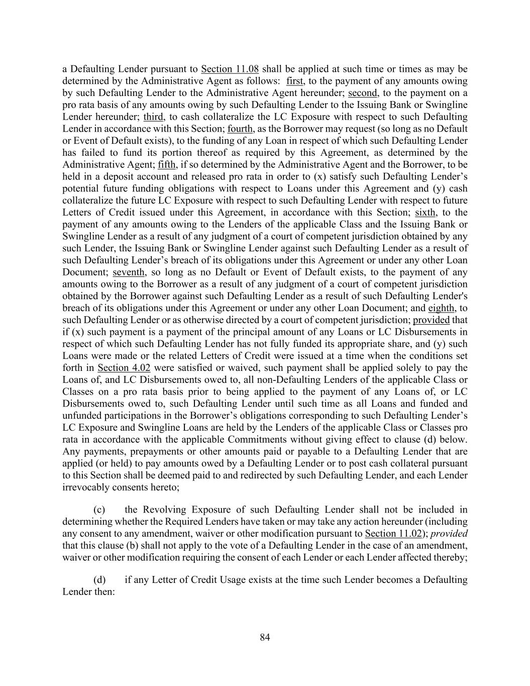 84 a Defaulting Lender pursuant to Section 11.08 shall be applied at such time or times as may be determined by the Administrative Agent as follows: first, to the payment of any amounts owing by such Defaulting Lender to the Administrative Agent hereunder; second, to the payment on a pro rata basis of any amounts owing by such Defaulting Lender to the Issuing Bank or Swingline Lender hereunder; third, to cash collateralize the LC Exposure with respect to such Defaulting Lender in accordance with this Section; fourth, as the Borrower may request (so long as no Default or Event of Default exists), to the funding of any Loan in respect of which such Defaulting Lender has failed to fund its portion thereof as required by this Agreement, as determined by the Administrative Agent; fifth, if so determined by the Administrative Agent and the Borrower, to be held in a deposit account and released pro rata in order to (x) satisfy such Defaulting Lender’s potential future funding obligations with respect to Loans under this Agreement and (y) cash collateralize the future LC Exposure with respect to such Defaulting Lender with respect to future Letters of Credit issued under this Agreement, in accordance with this Section; sixth, to the payment of any amounts owing to the Lenders of the applicable Class and the Issuing Bank or Swingline Lender as a result of any judgment of a court of competent jurisdiction obtained by any such Lender, the Issuing Bank or Swingline Lender against such Defaulting Lender as a result of such Defaulting Lender’s breach of its obligations under this Agreement or under any other Loan Document; seventh, so long as no Default or Event of Default exists, to the payment of any amounts owing to the Borrower as a result of any judgment of a court of competent jurisdiction obtained by the Borrower against such Defaulting Lender as a result of such Defaulting Lender's breach of its obligations under this Agreement or under any other Loan Document; and eighth, to such Defaulting Lender or as otherwise directed by a court of competent jurisdiction; provided that if (x) such payment is a payment of the principal amount of any Loans or LC Disbursements in respect of which such Defaulting Lender has not fully funded its appropriate share, and (y) such Loans were made or the related Letters of Credit were issued at a time when the conditions set forth in Section 4.02 were satisfied or waived, such payment shall be applied solely to pay the Loans of, and LC Disbursements owed to, all non-Defaulting Lenders of the applicable Class or Classes on a pro rata basis prior to being applied to the payment of any Loans of, or LC Disbursements owed to, such Defaulting Lender until such time as all Loans and funded and unfunded participations in the Borrower’s obligations corresponding to such Defaulting Lender’s LC Exposure and Swingline Loans are held by the Lenders of the applicable Class or Classes pro rata in accordance with the applicable Commitments without giving effect to clause (d) below. Any payments, prepayments or other amounts paid or payable to a Defaulting Lender that are applied (or held) to pay amounts owed by a Defaulting Lender or to post cash collateral pursuant to this Section shall be deemed paid to and redirected by such Defaulting Lender, and each Lender irrevocably consents hereto; (c) the Revolving Exposure of such Defaulting Lender shall not be included in determining whether the Required Lenders have taken or may take any action hereunder (including any consent to any amendment, waiver or other modification pursuant to Section 11.02); provided that this clause (b) shall not apply to the vote of a Defaulting Lender in the case of an amendment, waiver or other modification requiring the consent of each Lender or each Lender affected thereby; (d) if any Letter of Credit Usage exists at the time such Lender becomes a Defaulting Lender then: