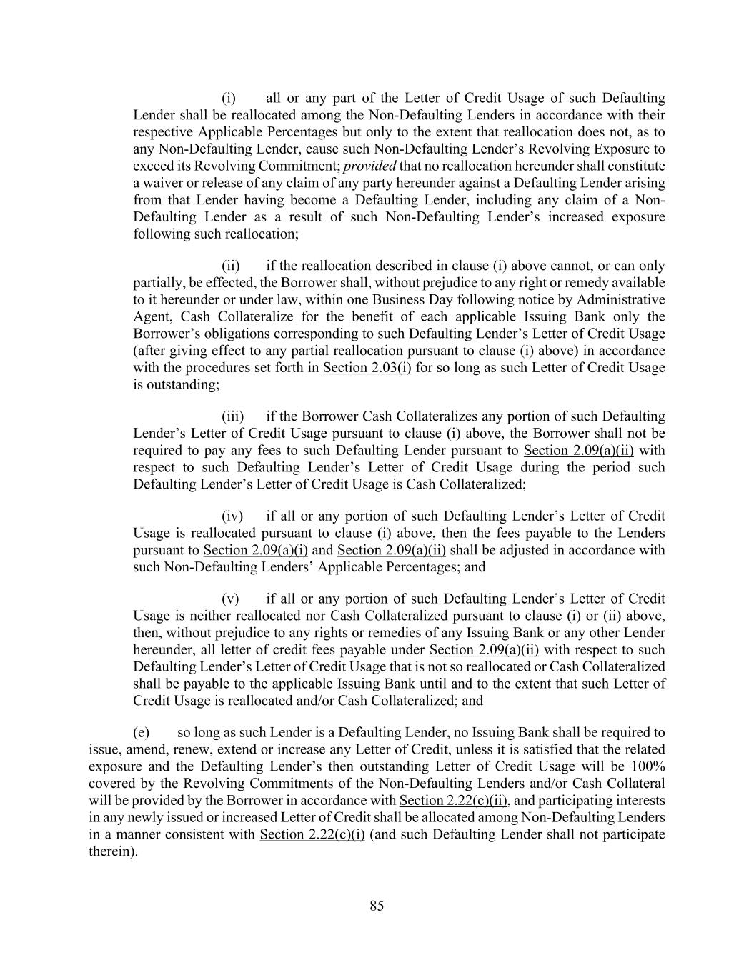 85 (i) all or any part of the Letter of Credit Usage of such Defaulting Lender shall be reallocated among the Non-Defaulting Lenders in accordance with their respective Applicable Percentages but only to the extent that reallocation does not, as to any Non-Defaulting Lender, cause such Non-Defaulting Lender’s Revolving Exposure to exceed its Revolving Commitment; provided that no reallocation hereunder shall constitute a waiver or release of any claim of any party hereunder against a Defaulting Lender arising from that Lender having become a Defaulting Lender, including any claim of a Non- Defaulting Lender as a result of such Non-Defaulting Lender’s increased exposure following such reallocation; (ii) if the reallocation described in clause (i) above cannot, or can only partially, be effected, the Borrower shall, without prejudice to any right or remedy available to it hereunder or under law, within one Business Day following notice by Administrative Agent, Cash Collateralize for the benefit of each applicable Issuing Bank only the Borrower’s obligations corresponding to such Defaulting Lender’s Letter of Credit Usage (after giving effect to any partial reallocation pursuant to clause (i) above) in accordance with the procedures set forth in Section 2.03(i) for so long as such Letter of Credit Usage is outstanding; (iii) if the Borrower Cash Collateralizes any portion of such Defaulting Lender’s Letter of Credit Usage pursuant to clause (i) above, the Borrower shall not be required to pay any fees to such Defaulting Lender pursuant to Section 2.09(a)(ii) with respect to such Defaulting Lender’s Letter of Credit Usage during the period such Defaulting Lender’s Letter of Credit Usage is Cash Collateralized; (iv) if all or any portion of such Defaulting Lender’s Letter of Credit Usage is reallocated pursuant to clause (i) above, then the fees payable to the Lenders pursuant to Section 2.09(a)(i) and Section 2.09(a)(ii) shall be adjusted in accordance with such Non-Defaulting Lenders’ Applicable Percentages; and (v) if all or any portion of such Defaulting Lender’s Letter of Credit Usage is neither reallocated nor Cash Collateralized pursuant to clause (i) or (ii) above, then, without prejudice to any rights or remedies of any Issuing Bank or any other Lender hereunder, all letter of credit fees payable under Section 2.09(a)(ii) with respect to such Defaulting Lender’s Letter of Credit Usage that is not so reallocated or Cash Collateralized shall be payable to the applicable Issuing Bank until and to the extent that such Letter of Credit Usage is reallocated and/or Cash Collateralized; and (e) so long as such Lender is a Defaulting Lender, no Issuing Bank shall be required to issue, amend, renew, extend or increase any Letter of Credit, unless it is satisfied that the related exposure and the Defaulting Lender’s then outstanding Letter of Credit Usage will be 100% covered by the Revolving Commitments of the Non-Defaulting Lenders and/or Cash Collateral will be provided by the Borrower in accordance with Section 2.22(c)(ii), and participating interests in any newly issued or increased Letter of Credit shall be allocated among Non-Defaulting Lenders in a manner consistent with Section 2.22(c)(i) (and such Defaulting Lender shall not participate therein).
