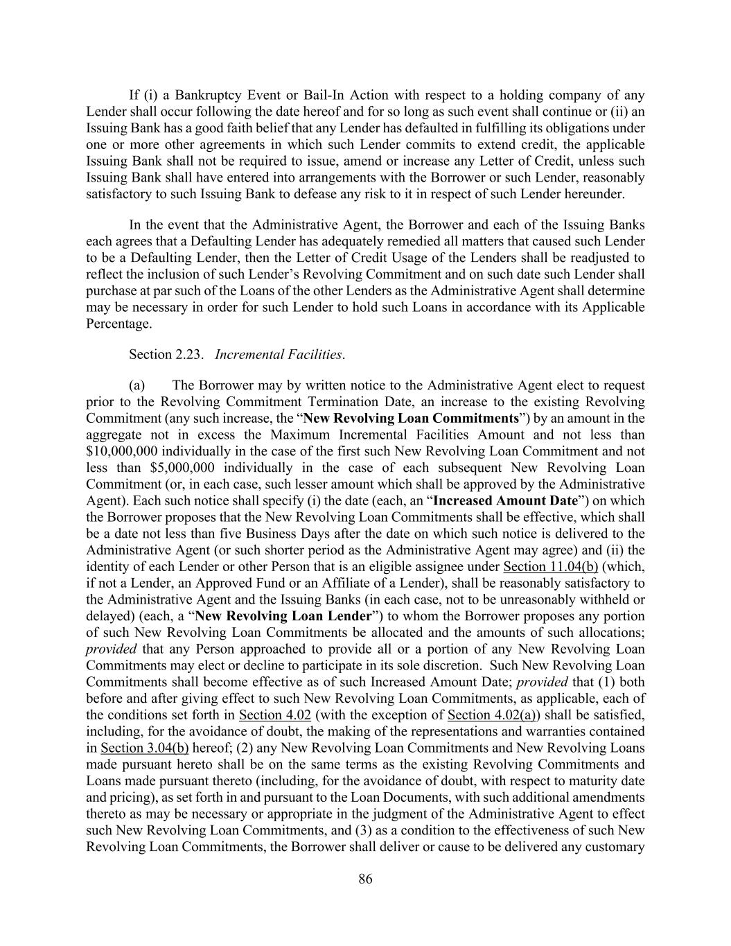 86 If (i) a Bankruptcy Event or Bail-In Action with respect to a holding company of any Lender shall occur following the date hereof and for so long as such event shall continue or (ii) an Issuing Bank has a good faith belief that any Lender has defaulted in fulfilling its obligations under one or more other agreements in which such Lender commits to extend credit, the applicable Issuing Bank shall not be required to issue, amend or increase any Letter of Credit, unless such Issuing Bank shall have entered into arrangements with the Borrower or such Lender, reasonably satisfactory to such Issuing Bank to defease any risk to it in respect of such Lender hereunder. In the event that the Administrative Agent, the Borrower and each of the Issuing Banks each agrees that a Defaulting Lender has adequately remedied all matters that caused such Lender to be a Defaulting Lender, then the Letter of Credit Usage of the Lenders shall be readjusted to reflect the inclusion of such Lender’s Revolving Commitment and on such date such Lender shall purchase at par such of the Loans of the other Lenders as the Administrative Agent shall determine may be necessary in order for such Lender to hold such Loans in accordance with its Applicable Percentage. Section 2.23. Incremental Facilities. (a) The Borrower may by written notice to the Administrative Agent elect to request prior to the Revolving Commitment Termination Date, an increase to the existing Revolving Commitment (any such increase, the “New Revolving Loan Commitments”) by an amount in the aggregate not in excess the Maximum Incremental Facilities Amount and not less than $10,000,000 individually in the case of the first such New Revolving Loan Commitment and not less than $5,000,000 individually in the case of each subsequent New Revolving Loan Commitment (or, in each case, such lesser amount which shall be approved by the Administrative Agent). Each such notice shall specify (i) the date (each, an “Increased Amount Date”) on which the Borrower proposes that the New Revolving Loan Commitments shall be effective, which shall be a date not less than five Business Days after the date on which such notice is delivered to the Administrative Agent (or such shorter period as the Administrative Agent may agree) and (ii) the identity of each Lender or other Person that is an eligible assignee under Section 11.04(b) (which, if not a Lender, an Approved Fund or an Affiliate of a Lender), shall be reasonably satisfactory to the Administrative Agent and the Issuing Banks (in each case, not to be unreasonably withheld or delayed) (each, a “New Revolving Loan Lender”) to whom the Borrower proposes any portion of such New Revolving Loan Commitments be allocated and the amounts of such allocations; provided that any Person approached to provide all or a portion of any New Revolving Loan Commitments may elect or decline to participate in its sole discretion. Such New Revolving Loan Commitments shall become effective as of such Increased Amount Date; provided that (1) both before and after giving effect to such New Revolving Loan Commitments, as applicable, each of the conditions set forth in Section 4.02 (with the exception of Section 4.02(a)) shall be satisfied, including, for the avoidance of doubt, the making of the representations and warranties contained in Section 3.04(b) hereof; (2) any New Revolving Loan Commitments and New Revolving Loans made pursuant hereto shall be on the same terms as the existing Revolving Commitments and Loans made pursuant thereto (including, for the avoidance of doubt, with respect to maturity date and pricing), as set forth in and pursuant to the Loan Documents, with such additional amendments thereto as may be necessary or appropriate in the judgment of the Administrative Agent to effect such New Revolving Loan Commitments, and (3) as a condition to the effectiveness of such New Revolving Loan Commitments, the Borrower shall deliver or cause to be delivered any customary