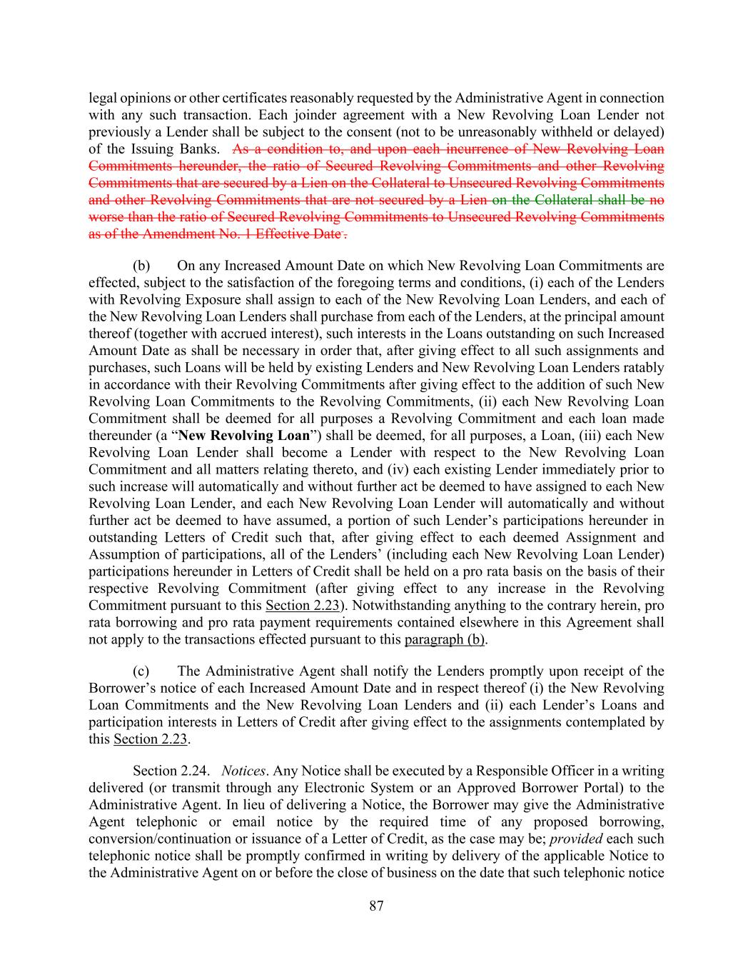 87 legal opinions or other certificates reasonably requested by the Administrative Agent in connection with any such transaction. Each joinder agreement with a New Revolving Loan Lender not previously a Lender shall be subject to the consent (not to be unreasonably withheld or delayed) of the Issuing Banks. As a condition to, and upon each incurrence of New Revolving Loan Commitments hereunder, the ratio of Secured Revolving Commitments and other Revolving Commitments that are secured by a Lien on the Collateral to Unsecured Revolving Commitments and other Revolving Commitments that are not secured by a Lien on the Collateral shall be no worse than the ratio of Secured Revolving Commitments to Unsecured Revolving Commitments as of the Amendment No. 1 Effective Date . (b) On any Increased Amount Date on which New Revolving Loan Commitments are effected, subject to the satisfaction of the foregoing terms and conditions, (i) each of the Lenders with Revolving Exposure shall assign to each of the New Revolving Loan Lenders, and each of the New Revolving Loan Lenders shall purchase from each of the Lenders, at the principal amount thereof (together with accrued interest), such interests in the Loans outstanding on such Increased Amount Date as shall be necessary in order that, after giving effect to all such assignments and purchases, such Loans will be held by existing Lenders and New Revolving Loan Lenders ratably in accordance with their Revolving Commitments after giving effect to the addition of such New Revolving Loan Commitments to the Revolving Commitments, (ii) each New Revolving Loan Commitment shall be deemed for all purposes a Revolving Commitment and each loan made thereunder (a “New Revolving Loan”) shall be deemed, for all purposes, a Loan, (iii) each New Revolving Loan Lender shall become a Lender with respect to the New Revolving Loan Commitment and all matters relating thereto, and (iv) each existing Lender immediately prior to such increase will automatically and without further act be deemed to have assigned to each New Revolving Loan Lender, and each New Revolving Loan Lender will automatically and without further act be deemed to have assumed, a portion of such Lender’s participations hereunder in outstanding Letters of Credit such that, after giving effect to each deemed Assignment and Assumption of participations, all of the Lenders’ (including each New Revolving Loan Lender) participations hereunder in Letters of Credit shall be held on a pro rata basis on the basis of their respective Revolving Commitment (after giving effect to any increase in the Revolving Commitment pursuant to this Section 2.23). Notwithstanding anything to the contrary herein, pro rata borrowing and pro rata payment requirements contained elsewhere in this Agreement shall not apply to the transactions effected pursuant to this paragraph (b). (c) The Administrative Agent shall notify the Lenders promptly upon receipt of the Borrower’s notice of each Increased Amount Date and in respect thereof (i) the New Revolving Loan Commitments and the New Revolving Loan Lenders and (ii) each Lender’s Loans and participation interests in Letters of Credit after giving effect to the assignments contemplated by this Section 2.23. Section 2.24. Notices. Any Notice shall be executed by a Responsible Officer in a writing delivered (or transmit through any Electronic System or an Approved Borrower Portal) to the Administrative Agent. In lieu of delivering a Notice, the Borrower may give the Administrative Agent telephonic or email notice by the required time of any proposed borrowing, conversion/continuation or issuance of a Letter of Credit, as the case may be; provided each such telephonic notice shall be promptly confirmed in writing by delivery of the applicable Notice to the Administrative Agent on or before the close of business on the date that such telephonic notice