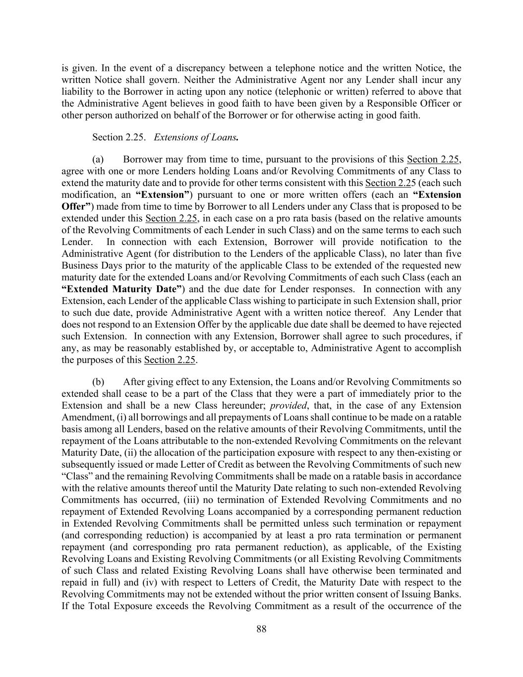 88 is given. In the event of a discrepancy between a telephone notice and the written Notice, the written Notice shall govern. Neither the Administrative Agent nor any Lender shall incur any liability to the Borrower in acting upon any notice (telephonic or written) referred to above that the Administrative Agent believes in good faith to have been given by a Responsible Officer or other person authorized on behalf of the Borrower or for otherwise acting in good faith. Section 2.25. Extensions of Loans. (a) Borrower may from time to time, pursuant to the provisions of this Section 2.25, agree with one or more Lenders holding Loans and/or Revolving Commitments of any Class to extend the maturity date and to provide for other terms consistent with this Section 2.25 (each such modification, an “Extension”) pursuant to one or more written offers (each an “Extension Offer”) made from time to time by Borrower to all Lenders under any Class that is proposed to be extended under this Section 2.25, in each case on a pro rata basis (based on the relative amounts of the Revolving Commitments of each Lender in such Class) and on the same terms to each such Lender. In connection with each Extension, Borrower will provide notification to the Administrative Agent (for distribution to the Lenders of the applicable Class), no later than five Business Days prior to the maturity of the applicable Class to be extended of the requested new maturity date for the extended Loans and/or Revolving Commitments of each such Class (each an “Extended Maturity Date”) and the due date for Lender responses. In connection with any Extension, each Lender of the applicable Class wishing to participate in such Extension shall, prior to such due date, provide Administrative Agent with a written notice thereof. Any Lender that does not respond to an Extension Offer by the applicable due date shall be deemed to have rejected such Extension. In connection with any Extension, Borrower shall agree to such procedures, if any, as may be reasonably established by, or acceptable to, Administrative Agent to accomplish the purposes of this Section 2.25. (b) After giving effect to any Extension, the Loans and/or Revolving Commitments so extended shall cease to be a part of the Class that they were a part of immediately prior to the Extension and shall be a new Class hereunder; provided, that, in the case of any Extension Amendment, (i) all borrowings and all prepayments of Loans shall continue to be made on a ratable basis among all Lenders, based on the relative amounts of their Revolving Commitments, until the repayment of the Loans attributable to the non-extended Revolving Commitments on the relevant Maturity Date, (ii) the allocation of the participation exposure with respect to any then-existing or subsequently issued or made Letter of Credit as between the Revolving Commitments of such new “Class” and the remaining Revolving Commitments shall be made on a ratable basis in accordance with the relative amounts thereof until the Maturity Date relating to such non-extended Revolving Commitments has occurred, (iii) no termination of Extended Revolving Commitments and no repayment of Extended Revolving Loans accompanied by a corresponding permanent reduction in Extended Revolving Commitments shall be permitted unless such termination or repayment (and corresponding reduction) is accompanied by at least a pro rata termination or permanent repayment (and corresponding pro rata permanent reduction), as applicable, of the Existing Revolving Loans and Existing Revolving Commitments (or all Existing Revolving Commitments of such Class and related Existing Revolving Loans shall have otherwise been terminated and repaid in full) and (iv) with respect to Letters of Credit, the Maturity Date with respect to the Revolving Commitments may not be extended without the prior written consent of Issuing Banks. If the Total Exposure exceeds the Revolving Commitment as a result of the occurrence of the