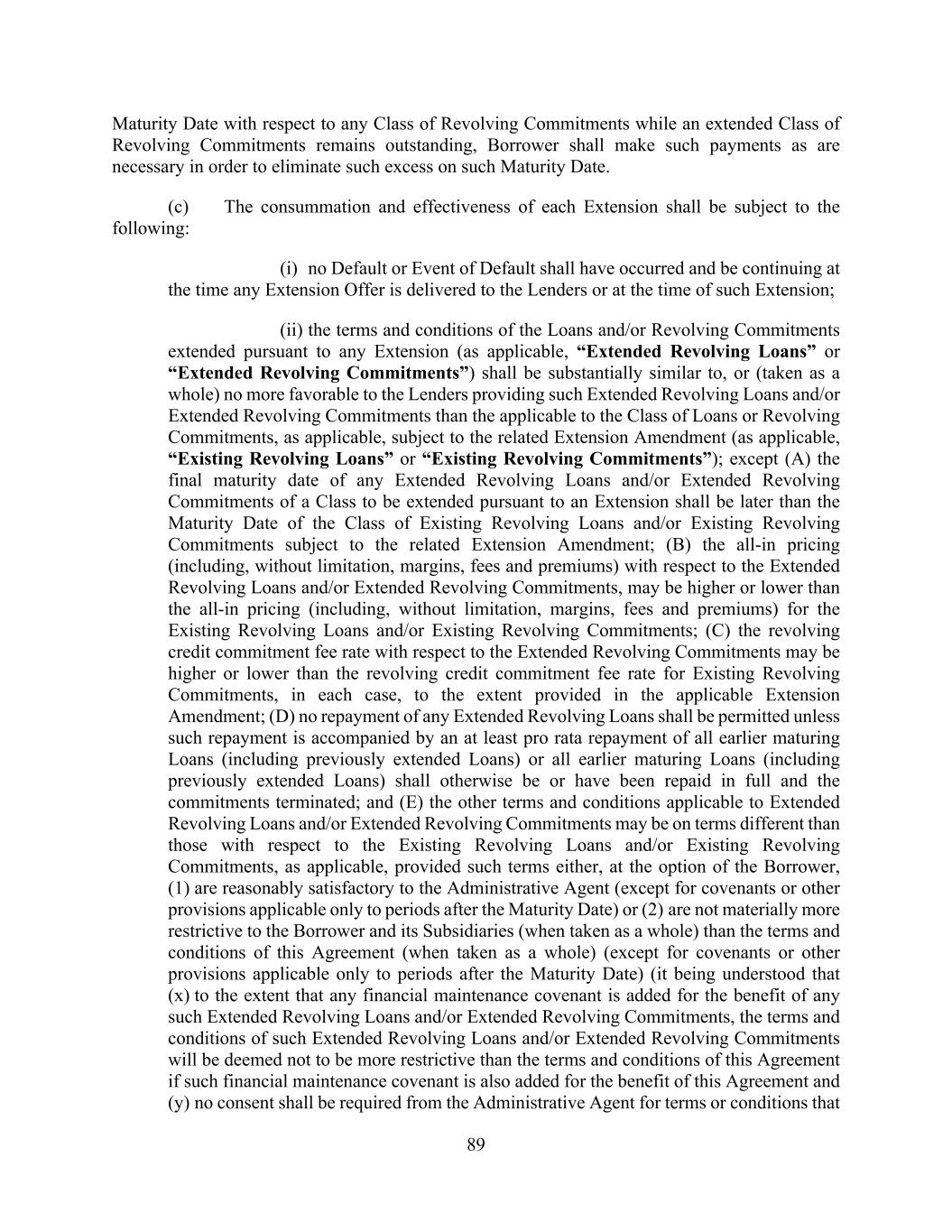 89 Maturity Date with respect to any Class of Revolving Commitments while an extended Class of Revolving Commitments remains outstanding, Borrower shall make such payments as are necessary in order to eliminate such excess on such Maturity Date. (c) The consummation and effectiveness of each Extension shall be subject to the following: (i) no Default or Event of Default shall have occurred and be continuing at the time any Extension Offer is delivered to the Lenders or at the time of such Extension; (ii) the terms and conditions of the Loans and/or Revolving Commitments extended pursuant to any Extension (as applicable, “Extended Revolving Loans” or “Extended Revolving Commitments”) shall be substantially similar to, or (taken as a whole) no more favorable to the Lenders providing such Extended Revolving Loans and/or Extended Revolving Commitments than the applicable to the Class of Loans or Revolving Commitments, as applicable, subject to the related Extension Amendment (as applicable, “Existing Revolving Loans” or “Existing Revolving Commitments”); except (A) the final maturity date of any Extended Revolving Loans and/or Extended Revolving Commitments of a Class to be extended pursuant to an Extension shall be later than the Maturity Date of the Class of Existing Revolving Loans and/or Existing Revolving Commitments subject to the related Extension Amendment; (B) the all-in pricing (including, without limitation, margins, fees and premiums) with respect to the Extended Revolving Loans and/or Extended Revolving Commitments, may be higher or lower than the all-in pricing (including, without limitation, margins, fees and premiums) for the Existing Revolving Loans and/or Existing Revolving Commitments; (C) the revolving credit commitment fee rate with respect to the Extended Revolving Commitments may be higher or lower than the revolving credit commitment fee rate for Existing Revolving Commitments, in each case, to the extent provided in the applicable Extension Amendment; (D) no repayment of any Extended Revolving Loans shall be permitted unless such repayment is accompanied by an at least pro rata repayment of all earlier maturing Loans (including previously extended Loans) or all earlier maturing Loans (including previously extended Loans) shall otherwise be or have been repaid in full and the commitments terminated; and (E) the other terms and conditions applicable to Extended Revolving Loans and/or Extended Revolving Commitments may be on terms different than those with respect to the Existing Revolving Loans and/or Existing Revolving Commitments, as applicable, provided such terms either, at the option of the Borrower, (1) are reasonably satisfactory to the Administrative Agent (except for covenants or other provisions applicable only to periods after the Maturity Date) or (2) are not materially more restrictive to the Borrower and its Subsidiaries (when taken as a whole) than the terms and conditions of this Agreement (when taken as a whole) (except for covenants or other provisions applicable only to periods after the Maturity Date) (it being understood that (x) to the extent that any financial maintenance covenant is added for the benefit of any such Extended Revolving Loans and/or Extended Revolving Commitments, the terms and conditions of such Extended Revolving Loans and/or Extended Revolving Commitments will be deemed not to be more restrictive than the terms and conditions of this Agreement if such financial maintenance covenant is also added for the benefit of this Agreement and (y) no consent shall be required from the Administrative Agent for terms or conditions that