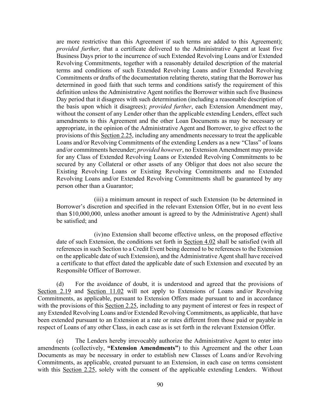 90 are more restrictive than this Agreement if such terms are added to this Agreement); provided further, that a certificate delivered to the Administrative Agent at least five Business Days prior to the incurrence of such Extended Revolving Loans and/or Extended Revolving Commitments, together with a reasonably detailed description of the material terms and conditions of such Extended Revolving Loans and/or Extended Revolving Commitments or drafts of the documentation relating thereto, stating that the Borrower has determined in good faith that such terms and conditions satisfy the requirement of this definition unless the Administrative Agent notifies the Borrower within such five Business Day period that it disagrees with such determination (including a reasonable description of the basis upon which it disagrees); provided further, each Extension Amendment may, without the consent of any Lender other than the applicable extending Lenders, effect such amendments to this Agreement and the other Loan Documents as may be necessary or appropriate, in the opinion of the Administrative Agent and Borrower, to give effect to the provisions of this Section 2.25, including any amendments necessary to treat the applicable Loans and/or Revolving Commitments of the extending Lenders as a new “Class” of loans and/or commitments hereunder; provided however, no Extension Amendment may provide for any Class of Extended Revolving Loans or Extended Revolving Commitments to be secured by any Collateral or other assets of any Obligor that does not also secure the Existing Revolving Loans or Existing Revolving Commitments and no Extended Revolving Loans and/or Extended Revolving Commitments shall be guaranteed by any person other than a Guarantor; (iii) a minimum amount in respect of such Extension (to be determined in Borrower’s discretion and specified in the relevant Extension Offer, but in no event less than $10,000,000, unless another amount is agreed to by the Administrative Agent) shall be satisfied; and (iv)no Extension shall become effective unless, on the proposed effective date of such Extension, the conditions set forth in Section 4.02 shall be satisfied (with all references in such Section to a Credit Event being deemed to be references to the Extension on the applicable date of such Extension), and the Administrative Agent shall have received a certificate to that effect dated the applicable date of such Extension and executed by an Responsible Officer of Borrower. (d) For the avoidance of doubt, it is understood and agreed that the provisions of Section 2.19 and Section 11.02 will not apply to Extensions of Loans and/or Revolving Commitments, as applicable, pursuant to Extension Offers made pursuant to and in accordance with the provisions of this Section 2.25, including to any payment of interest or fees in respect of any Extended Revolving Loans and/or Extended Revolving Commitments, as applicable, that have been extended pursuant to an Extension at a rate or rates different from those paid or payable in respect of Loans of any other Class, in each case as is set forth in the relevant Extension Offer. (e) The Lenders hereby irrevocably authorize the Administrative Agent to enter into amendments (collectively, “Extension Amendments”) to this Agreement and the other Loan Documents as may be necessary in order to establish new Classes of Loans and/or Revolving Commitments, as applicable, created pursuant to an Extension, in each case on terms consistent with this Section 2.25, solely with the consent of the applicable extending Lenders. Without