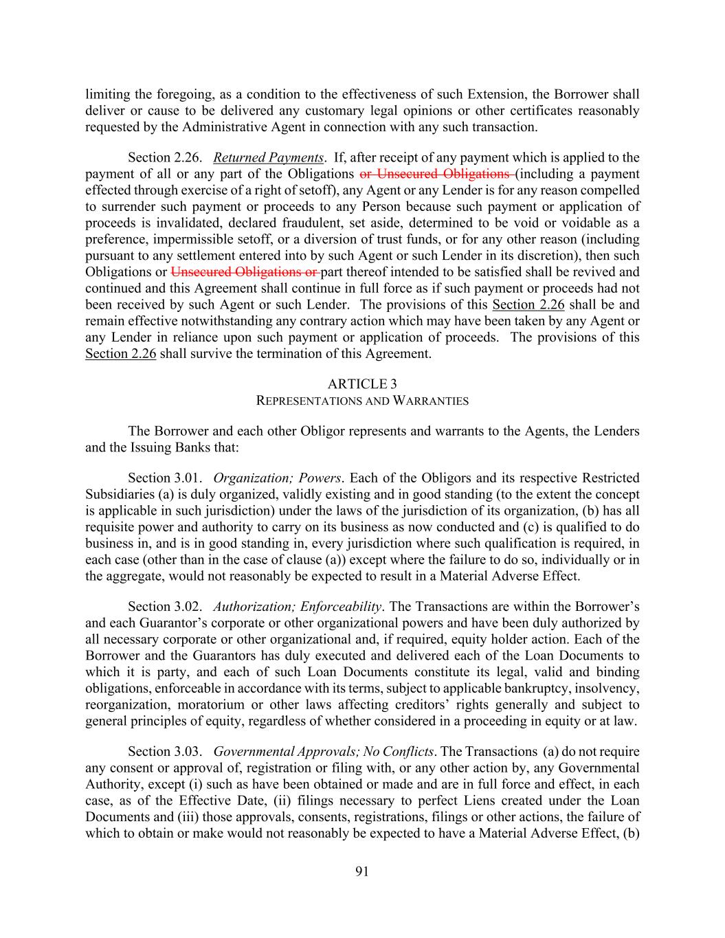 91 limiting the foregoing, as a condition to the effectiveness of such Extension, the Borrower shall deliver or cause to be delivered any customary legal opinions or other certificates reasonably requested by the Administrative Agent in connection with any such transaction. Section 2.26. Returned Payments. If, after receipt of any payment which is applied to the payment of all or any part of the Obligations or Unsecured Obligations (including a payment effected through exercise of a right of setoff), any Agent or any Lender is for any reason compelled to surrender such payment or proceeds to any Person because such payment or application of proceeds is invalidated, declared fraudulent, set aside, determined to be void or voidable as a preference, impermissible setoff, or a diversion of trust funds, or for any other reason (including pursuant to any settlement entered into by such Agent or such Lender in its discretion), then such Obligations or Unsecured Obligations or part thereof intended to be satisfied shall be revived and continued and this Agreement shall continue in full force as if such payment or proceeds had not been received by such Agent or such Lender. The provisions of this Section 2.26 shall be and remain effective notwithstanding any contrary action which may have been taken by any Agent or any Lender in reliance upon such payment or application of proceeds. The provisions of this Section 2.26 shall survive the termination of this Agreement. ARTICLE 3 REPRESENTATIONS AND WARRANTIES The Borrower and each other Obligor represents and warrants to the Agents, the Lenders and the Issuing Banks that: Section 3.01. Organization; Powers. Each of the Obligors and its respective Restricted Subsidiaries (a) is duly organized, validly existing and in good standing (to the extent the concept is applicable in such jurisdiction) under the laws of the jurisdiction of its organization, (b) has all requisite power and authority to carry on its business as now conducted and (c) is qualified to do business in, and is in good standing in, every jurisdiction where such qualification is required, in each case (other than in the case of clause (a)) except where the failure to do so, individually or in the aggregate, would not reasonably be expected to result in a Material Adverse Effect. Section 3.02. Authorization; Enforceability. The Transactions are within the Borrower’s and each Guarantor’s corporate or other organizational powers and have been duly authorized by all necessary corporate or other organizational and, if required, equity holder action. Each of the Borrower and the Guarantors has duly executed and delivered each of the Loan Documents to which it is party, and each of such Loan Documents constitute its legal, valid and binding obligations, enforceable in accordance with its terms, subject to applicable bankruptcy, insolvency, reorganization, moratorium or other laws affecting creditors’ rights generally and subject to general principles of equity, regardless of whether considered in a proceeding in equity or at law. Section 3.03. Governmental Approvals; No Conflicts. The Transactions (a) do not require any consent or approval of, registration or filing with, or any other action by, any Governmental Authority, except (i) such as have been obtained or made and are in full force and effect, in each case, as of the Effective Date, (ii) filings necessary to perfect Liens created under the Loan Documents and (iii) those approvals, consents, registrations, filings or other actions, the failure of which to obtain or make would not reasonably be expected to have a Material Adverse Effect, (b)