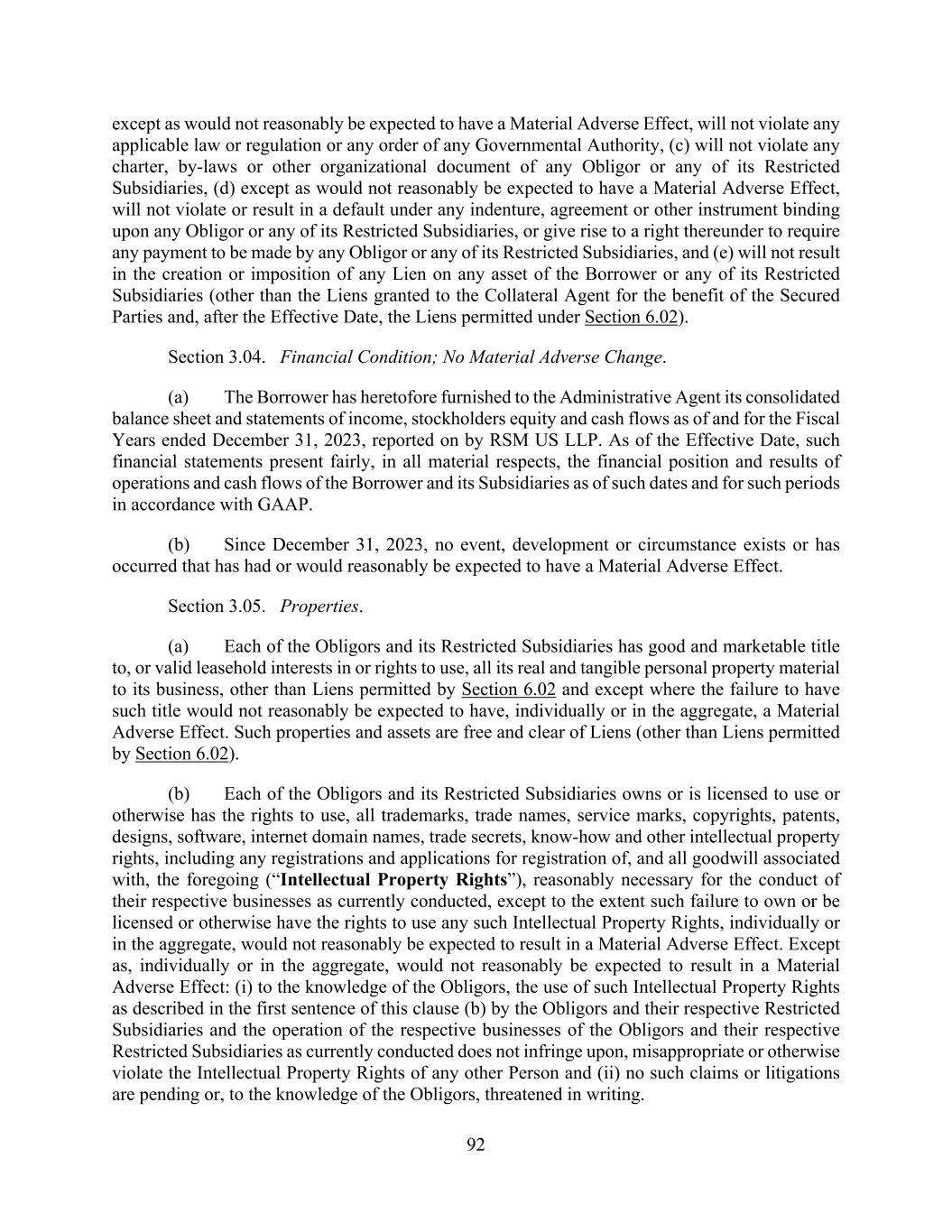 92 except as would not reasonably be expected to have a Material Adverse Effect, will not violate any applicable law or regulation or any order of any Governmental Authority, (c) will not violate any charter, by-laws or other organizational document of any Obligor or any of its Restricted Subsidiaries, (d) except as would not reasonably be expected to have a Material Adverse Effect, will not violate or result in a default under any indenture, agreement or other instrument binding upon any Obligor or any of its Restricted Subsidiaries, or give rise to a right thereunder to require any payment to be made by any Obligor or any of its Restricted Subsidiaries, and (e) will not result in the creation or imposition of any Lien on any asset of the Borrower or any of its Restricted Subsidiaries (other than the Liens granted to the Collateral Agent for the benefit of the Secured Parties and, after the Effective Date, the Liens permitted under Section 6.02). Section 3.04. Financial Condition; No Material Adverse Change. (a) The Borrower has heretofore furnished to the Administrative Agent its consolidated balance sheet and statements of income, stockholders equity and cash flows as of and for the Fiscal Years ended December 31, 2023, reported on by RSM US LLP. As of the Effective Date, such financial statements present fairly, in all material respects, the financial position and results of operations and cash flows of the Borrower and its Subsidiaries as of such dates and for such periods in accordance with GAAP. (b) Since December 31, 2023, no event, development or circumstance exists or has occurred that has had or would reasonably be expected to have a Material Adverse Effect. Section 3.05. Properties. (a) Each of the Obligors and its Restricted Subsidiaries has good and marketable title to, or valid leasehold interests in or rights to use, all its real and tangible personal property material to its business, other than Liens permitted by Section 6.02 and except where the failure to have such title would not reasonably be expected to have, individually or in the aggregate, a Material Adverse Effect. Such properties and assets are free and clear of Liens (other than Liens permitted by Section 6.02). (b) Each of the Obligors and its Restricted Subsidiaries owns or is licensed to use or otherwise has the rights to use, all trademarks, trade names, service marks, copyrights, patents, designs, software, internet domain names, trade secrets, know-how and other intellectual property rights, including any registrations and applications for registration of, and all goodwill associated with, the foregoing (“Intellectual Property Rights”), reasonably necessary for the conduct of their respective businesses as currently conducted, except to the extent such failure to own or be licensed or otherwise have the rights to use any such Intellectual Property Rights, individually or in the aggregate, would not reasonably be expected to result in a Material Adverse Effect. Except as, individually or in the aggregate, would not reasonably be expected to result in a Material Adverse Effect: (i) to the knowledge of the Obligors, the use of such Intellectual Property Rights as described in the first sentence of this clause (b) by the Obligors and their respective Restricted Subsidiaries and the operation of the respective businesses of the Obligors and their respective Restricted Subsidiaries as currently conducted does not infringe upon, misappropriate or otherwise violate the Intellectual Property Rights of any other Person and (ii) no such claims or litigations are pending or, to the knowledge of the Obligors, threatened in writing.