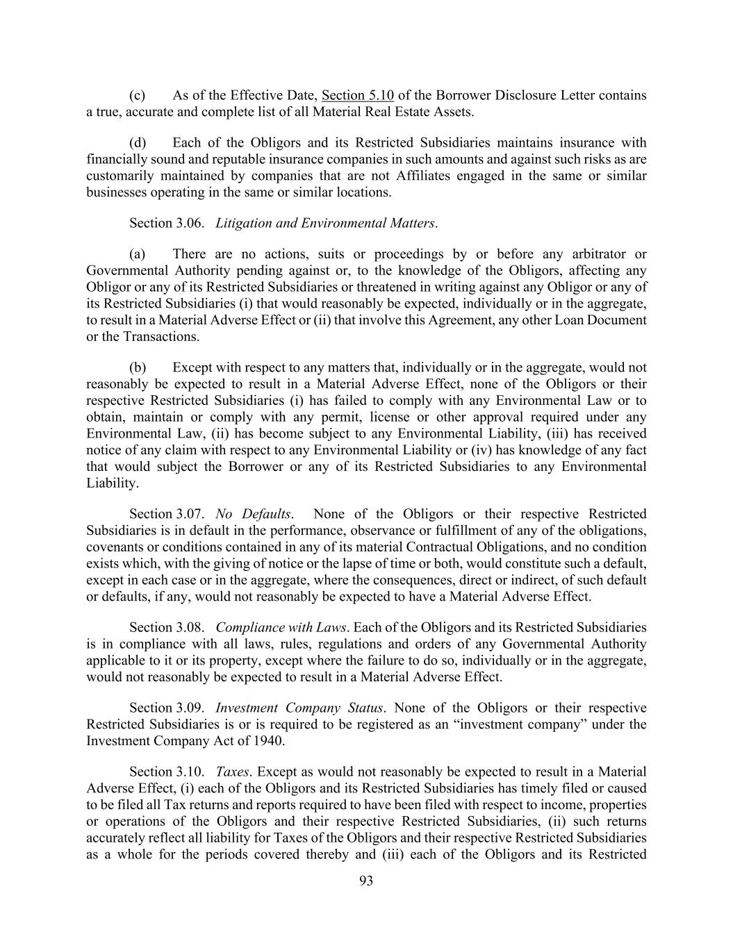 93 (c) As of the Effective Date, Section 5.10 of the Borrower Disclosure Letter contains a true, accurate and complete list of all Material Real Estate Assets. (d) Each of the Obligors and its Restricted Subsidiaries maintains insurance with financially sound and reputable insurance companies in such amounts and against such risks as are customarily maintained by companies that are not Affiliates engaged in the same or similar businesses operating in the same or similar locations. Section 3.06. Litigation and Environmental Matters. (a) There are no actions, suits or proceedings by or before any arbitrator or Governmental Authority pending against or, to the knowledge of the Obligors, affecting any Obligor or any of its Restricted Subsidiaries or threatened in writing against any Obligor or any of its Restricted Subsidiaries (i) that would reasonably be expected, individually or in the aggregate, to result in a Material Adverse Effect or (ii) that involve this Agreement, any other Loan Document or the Transactions. (b) Except with respect to any matters that, individually or in the aggregate, would not reasonably be expected to result in a Material Adverse Effect, none of the Obligors or their respective Restricted Subsidiaries (i) has failed to comply with any Environmental Law or to obtain, maintain or comply with any permit, license or other approval required under any Environmental Law, (ii) has become subject to any Environmental Liability, (iii) has received notice of any claim with respect to any Environmental Liability or (iv) has knowledge of any fact that would subject the Borrower or any of its Restricted Subsidiaries to any Environmental Liability. Section 3.07. No Defaults. None of the Obligors or their respective Restricted Subsidiaries is in default in the performance, observance or fulfillment of any of the obligations, covenants or conditions contained in any of its material Contractual Obligations, and no condition exists which, with the giving of notice or the lapse of time or both, would constitute such a default, except in each case or in the aggregate, where the consequences, direct or indirect, of such default or defaults, if any, would not reasonably be expected to have a Material Adverse Effect. Section 3.08. Compliance with Laws. Each of the Obligors and its Restricted Subsidiaries is in compliance with all laws, rules, regulations and orders of any Governmental Authority applicable to it or its property, except where the failure to do so, individually or in the aggregate, would not reasonably be expected to result in a Material Adverse Effect. Section 3.09. Investment Company Status. None of the Obligors or their respective Restricted Subsidiaries is or is required to be registered as an “investment company” under the Investment Company Act of 1940. Section 3.10. Taxes. Except as would not reasonably be expected to result in a Material Adverse Effect, (i) each of the Obligors and its Restricted Subsidiaries has timely filed or caused to be filed all Tax returns and reports required to have been filed with respect to income, properties or operations of the Obligors and their respective Restricted Subsidiaries, (ii) such returns accurately reflect all liability for Taxes of the Obligors and their respective Restricted Subsidiaries as a whole for the periods covered thereby and (iii) each of the Obligors and its Restricted