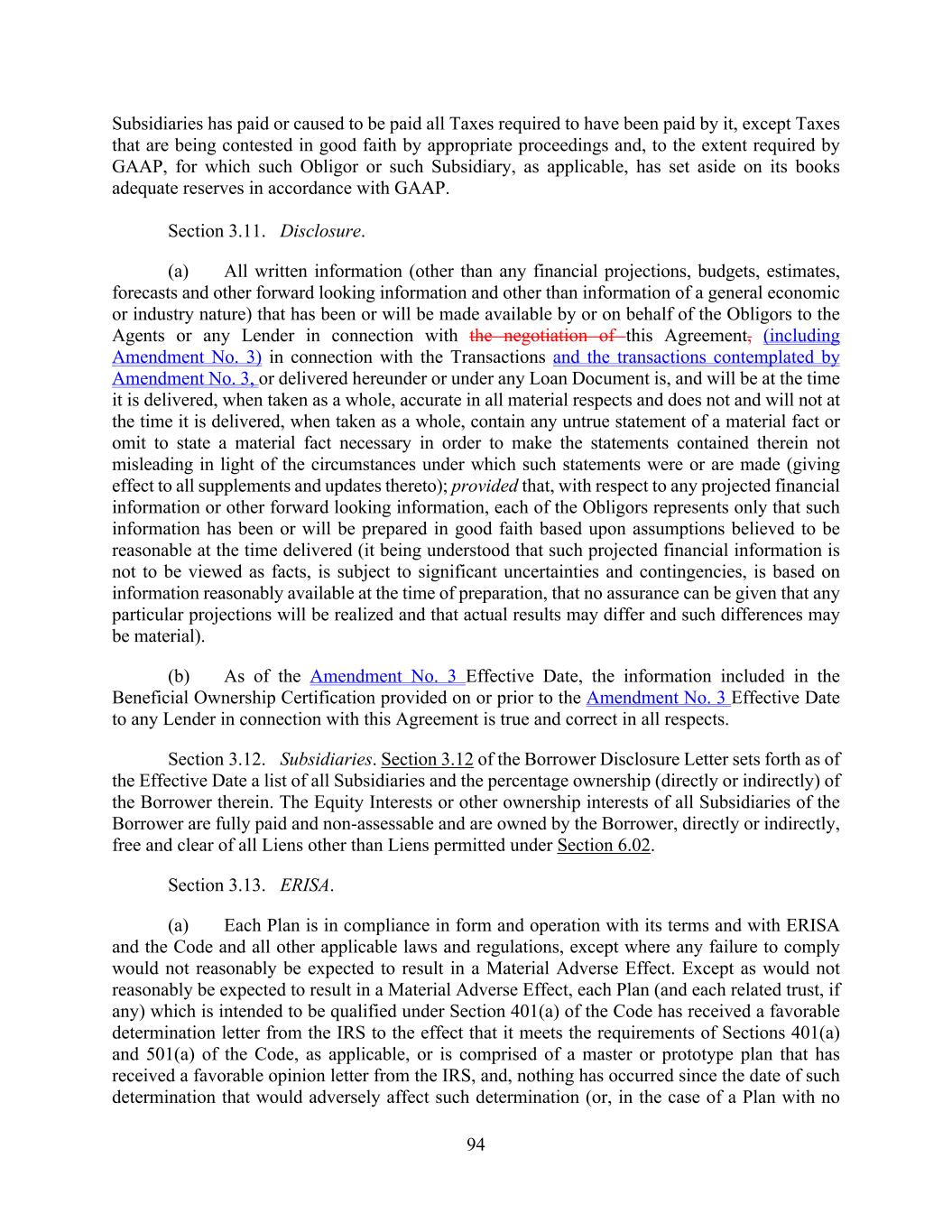 94 Subsidiaries has paid or caused to be paid all Taxes required to have been paid by it, except Taxes that are being contested in good faith by appropriate proceedings and, to the extent required by GAAP, for which such Obligor or such Subsidiary, as applicable, has set aside on its books adequate reserves in accordance with GAAP. Section 3.11. Disclosure. (a) All written information (other than any financial projections, budgets, estimates, forecasts and other forward looking information and other than information of a general economic or industry nature) that has been or will be made available by or on behalf of the Obligors to the Agents or any Lender in connection with the negotiation of this Agreement, (including Amendment No. 3) in connection with the Transactions and the transactions contemplated by Amendment No. 3, or delivered hereunder or under any Loan Document is, and will be at the time it is delivered, when taken as a whole, accurate in all material respects and does not and will not at the time it is delivered, when taken as a whole, contain any untrue statement of a material fact or omit to state a material fact necessary in order to make the statements contained therein not misleading in light of the circumstances under which such statements were or are made (giving effect to all supplements and updates thereto); provided that, with respect to any projected financial information or other forward looking information, each of the Obligors represents only that such information has been or will be prepared in good faith based upon assumptions believed to be reasonable at the time delivered (it being understood that such projected financial information is not to be viewed as facts, is subject to significant uncertainties and contingencies, is based on information reasonably available at the time of preparation, that no assurance can be given that any particular projections will be realized and that actual results may differ and such differences may be material). (b) As of the Amendment No. 3 Effective Date, the information included in the Beneficial Ownership Certification provided on or prior to the Amendment No. 3 Effective Date to any Lender in connection with this Agreement is true and correct in all respects. Section 3.12. Subsidiaries. Section 3.12 of the Borrower Disclosure Letter sets forth as of the Effective Date a list of all Subsidiaries and the percentage ownership (directly or indirectly) of the Borrower therein. The Equity Interests or other ownership interests of all Subsidiaries of the Borrower are fully paid and non-assessable and are owned by the Borrower, directly or indirectly, free and clear of all Liens other than Liens permitted under Section 6.02. Section 3.13. ERISA. (a) Each Plan is in compliance in form and operation with its terms and with ERISA and the Code and all other applicable laws and regulations, except where any failure to comply would not reasonably be expected to result in a Material Adverse Effect. Except as would not reasonably be expected to result in a Material Adverse Effect, each Plan (and each related trust, if any) which is intended to be qualified under Section 401(a) of the Code has received a favorable determination letter from the IRS to the effect that it meets the requirements of Sections 401(a) and 501(a) of the Code, as applicable, or is comprised of a master or prototype plan that has received a favorable opinion letter from the IRS, and, nothing has occurred since the date of such determination that would adversely affect such determination (or, in the case of a Plan with no