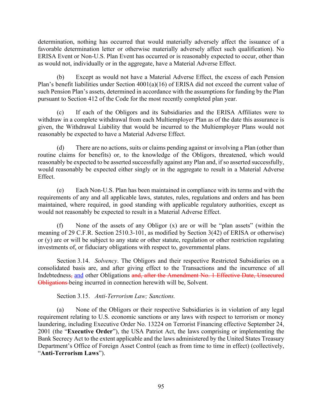 95 determination, nothing has occurred that would materially adversely affect the issuance of a favorable determination letter or otherwise materially adversely affect such qualification). No ERISA Event or Non-U.S. Plan Event has occurred or is reasonably expected to occur, other than as would not, individually or in the aggregate, have a Material Adverse Effect. (b) Except as would not have a Material Adverse Effect, the excess of each Pension Plan’s benefit liabilities under Section 4001(a)(16) of ERISA did not exceed the current value of such Pension Plan’s assets, determined in accordance with the assumptions for funding by the Plan pursuant to Section 412 of the Code for the most recently completed plan year. (c) If each of the Obligors and its Subsidiaries and the ERISA Affiliates were to withdraw in a complete withdrawal from each Multiemployer Plan as of the date this assurance is given, the Withdrawal Liability that would be incurred to the Multiemployer Plans would not reasonably be expected to have a Material Adverse Effect. (d) There are no actions, suits or claims pending against or involving a Plan (other than routine claims for benefits) or, to the knowledge of the Obligors, threatened, which would reasonably be expected to be asserted successfully against any Plan and, if so asserted successfully, would reasonably be expected either singly or in the aggregate to result in a Material Adverse Effect. (e) Each Non-U.S. Plan has been maintained in compliance with its terms and with the requirements of any and all applicable laws, statutes, rules, regulations and orders and has been maintained, where required, in good standing with applicable regulatory authorities, except as would not reasonably be expected to result in a Material Adverse Effect. (f) None of the assets of any Obligor (x) are or will be “plan assets” (within the meaning of 29 C.F.R. Section 2510.3-101, as modified by Section 3(42) of ERISA or otherwise) or (y) are or will be subject to any state or other statute, regulation or other restriction regulating investments of, or fiduciary obligations with respect to, governmental plans. Section 3.14. Solvency. The Obligors and their respective Restricted Subsidiaries on a consolidated basis are, and after giving effect to the Transactions and the incurrence of all Indebtedness, and other Obligations and, after the Amendment No. 1 Effective Date, Unsecured Obligations being incurred in connection herewith will be, Solvent. Section 3.15. Anti-Terrorism Law; Sanctions. (a) None of the Obligors or their respective Subsidiaries is in violation of any legal requirement relating to U.S. economic sanctions or any laws with respect to terrorism or money laundering, including Executive Order No. 13224 on Terrorist Financing effective September 24, 2001 (the “Executive Order”), the USA Patriot Act, the laws comprising or implementing the Bank Secrecy Act to the extent applicable and the laws administered by the United States Treasury Department’s Office of Foreign Asset Control (each as from time to time in effect) (collectively, “Anti-Terrorism Laws”).