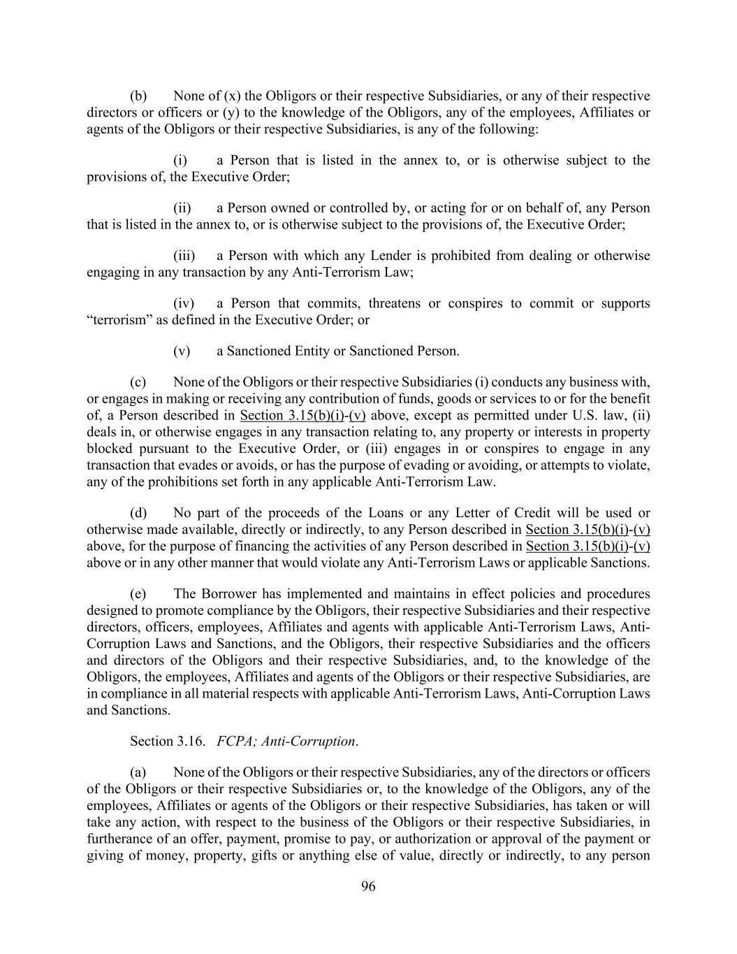 96 (b) None of (x) the Obligors or their respective Subsidiaries, or any of their respective directors or officers or (y) to the knowledge of the Obligors, any of the employees, Affiliates or agents of the Obligors or their respective Subsidiaries, is any of the following: (i) a Person that is listed in the annex to, or is otherwise subject to the provisions of, the Executive Order; (ii) a Person owned or controlled by, or acting for or on behalf of, any Person that is listed in the annex to, or is otherwise subject to the provisions of, the Executive Order; (iii) a Person with which any Lender is prohibited from dealing or otherwise engaging in any transaction by any Anti-Terrorism Law; (iv) a Person that commits, threatens or conspires to commit or supports “terrorism” as defined in the Executive Order; or (v) a Sanctioned Entity or Sanctioned Person. (c) None of the Obligors or their respective Subsidiaries (i) conducts any business with, or engages in making or receiving any contribution of funds, goods or services to or for the benefit of, a Person described in Section 3.15(b)(i)-(v) above, except as permitted under U.S. law, (ii) deals in, or otherwise engages in any transaction relating to, any property or interests in property blocked pursuant to the Executive Order, or (iii) engages in or conspires to engage in any transaction that evades or avoids, or has the purpose of evading or avoiding, or attempts to violate, any of the prohibitions set forth in any applicable Anti-Terrorism Law. (d) No part of the proceeds of the Loans or any Letter of Credit will be used or otherwise made available, directly or indirectly, to any Person described in Section 3.15(b)(i)-(v) above, for the purpose of financing the activities of any Person described in Section 3.15(b)(i)-(v) above or in any other manner that would violate any Anti-Terrorism Laws or applicable Sanctions. (e) The Borrower has implemented and maintains in effect policies and procedures designed to promote compliance by the Obligors, their respective Subsidiaries and their respective directors, officers, employees, Affiliates and agents with applicable Anti-Terrorism Laws, Anti- Corruption Laws and Sanctions, and the Obligors, their respective Subsidiaries and the officers and directors of the Obligors and their respective Subsidiaries, and, to the knowledge of the Obligors, the employees, Affiliates and agents of the Obligors or their respective Subsidiaries, are in compliance in all material respects with applicable Anti-Terrorism Laws, Anti-Corruption Laws and Sanctions. Section 3.16. FCPA; Anti-Corruption. (a) None of the Obligors or their respective Subsidiaries, any of the directors or officers of the Obligors or their respective Subsidiaries or, to the knowledge of the Obligors, any of the employees, Affiliates or agents of the Obligors or their respective Subsidiaries, has taken or will take any action, with respect to the business of the Obligors or their respective Subsidiaries, in furtherance of an offer, payment, promise to pay, or authorization or approval of the payment or giving of money, property, gifts or anything else of value, directly or indirectly, to any person