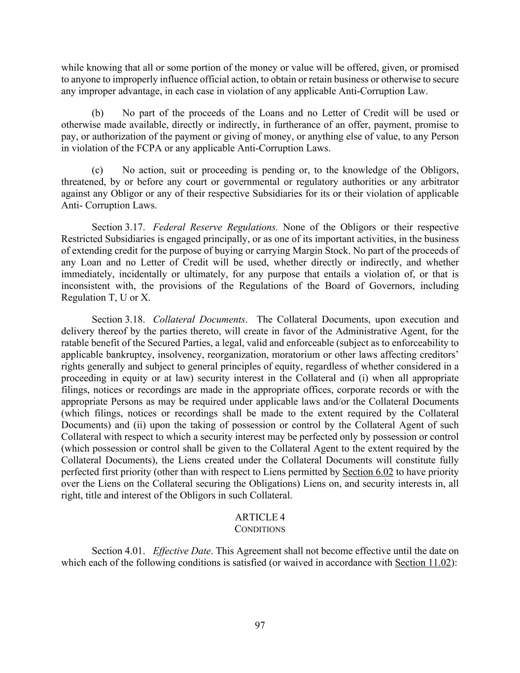 97 while knowing that all or some portion of the money or value will be offered, given, or promised to anyone to improperly influence official action, to obtain or retain business or otherwise to secure any improper advantage, in each case in violation of any applicable Anti-Corruption Law. (b) No part of the proceeds of the Loans and no Letter of Credit will be used or otherwise made available, directly or indirectly, in furtherance of an offer, payment, promise to pay, or authorization of the payment or giving of money, or anything else of value, to any Person in violation of the FCPA or any applicable Anti-Corruption Laws. (c) No action, suit or proceeding is pending or, to the knowledge of the Obligors, threatened, by or before any court or governmental or regulatory authorities or any arbitrator against any Obligor or any of their respective Subsidiaries for its or their violation of applicable Anti- Corruption Laws. Section 3.17. Federal Reserve Regulations. None of the Obligors or their respective Restricted Subsidiaries is engaged principally, or as one of its important activities, in the business of extending credit for the purpose of buying or carrying Margin Stock. No part of the proceeds of any Loan and no Letter of Credit will be used, whether directly or indirectly, and whether immediately, incidentally or ultimately, for any purpose that entails a violation of, or that is inconsistent with, the provisions of the Regulations of the Board of Governors, including Regulation T, U or X. Section 3.18. Collateral Documents. The Collateral Documents, upon execution and delivery thereof by the parties thereto, will create in favor of the Administrative Agent, for the ratable benefit of the Secured Parties, a legal, valid and enforceable (subject as to enforceability to applicable bankruptcy, insolvency, reorganization, moratorium or other laws affecting creditors’ rights generally and subject to general principles of equity, regardless of whether considered in a proceeding in equity or at law) security interest in the Collateral and (i) when all appropriate filings, notices or recordings are made in the appropriate offices, corporate records or with the appropriate Persons as may be required under applicable laws and/or the Collateral Documents (which filings, notices or recordings shall be made to the extent required by the Collateral Documents) and (ii) upon the taking of possession or control by the Collateral Agent of such Collateral with respect to which a security interest may be perfected only by possession or control (which possession or control shall be given to the Collateral Agent to the extent required by the Collateral Documents), the Liens created under the Collateral Documents will constitute fully perfected first priority (other than with respect to Liens permitted by Section 6.02 to have priority over the Liens on the Collateral securing the Obligations) Liens on, and security interests in, all right, title and interest of the Obligors in such Collateral. ARTICLE 4 CONDITIONS Section 4.01. Effective Date. This Agreement shall not become effective until the date on which each of the following conditions is satisfied (or waived in accordance with Section 11.02):