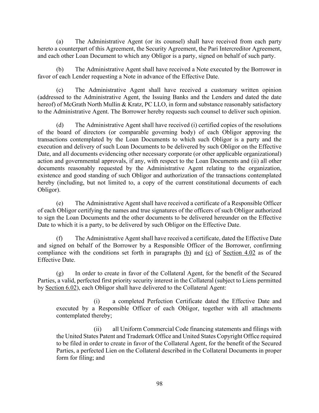 98 (a) The Administrative Agent (or its counsel) shall have received from each party hereto a counterpart of this Agreement, the Security Agreement, the Pari Intercreditor Agreement, and each other Loan Document to which any Obligor is a party, signed on behalf of such party. (b) The Administrative Agent shall have received a Note executed by the Borrower in favor of each Lender requesting a Note in advance of the Effective Date. (c) The Administrative Agent shall have received a customary written opinion (addressed to the Administrative Agent, the Issuing Banks and the Lenders and dated the date hereof) of McGrath North Mullin & Kratz, PC LLO, in form and substance reasonably satisfactory to the Administrative Agent. The Borrower hereby requests such counsel to deliver such opinion. (d) The Administrative Agent shall have received (i) certified copies of the resolutions of the board of directors (or comparable governing body) of each Obligor approving the transactions contemplated by the Loan Documents to which such Obligor is a party and the execution and delivery of such Loan Documents to be delivered by such Obligor on the Effective Date, and all documents evidencing other necessary corporate (or other applicable organizational) action and governmental approvals, if any, with respect to the Loan Documents and (ii) all other documents reasonably requested by the Administrative Agent relating to the organization, existence and good standing of such Obligor and authorization of the transactions contemplated hereby (including, but not limited to, a copy of the current constitutional documents of each Obligor). (e) The Administrative Agent shall have received a certificate of a Responsible Officer of each Obligor certifying the names and true signatures of the officers of such Obligor authorized to sign the Loan Documents and the other documents to be delivered hereunder on the Effective Date to which it is a party, to be delivered by such Obligor on the Effective Date. (f) The Administrative Agent shall have received a certificate, dated the Effective Date and signed on behalf of the Borrower by a Responsible Officer of the Borrower, confirming compliance with the conditions set forth in paragraphs (b) and (c) of Section 4.02 as of the Effective Date. (g) In order to create in favor of the Collateral Agent, for the benefit of the Secured Parties, a valid, perfected first priority security interest in the Collateral (subject to Liens permitted by Section 6.02), each Obligor shall have delivered to the Collateral Agent: (i) a completed Perfection Certificate dated the Effective Date and executed by a Responsible Officer of each Obligor, together with all attachments contemplated thereby; (ii) all Uniform Commercial Code financing statements and filings with the United States Patent and Trademark Office and United States Copyright Office required to be filed in order to create in favor of the Collateral Agent, for the benefit of the Secured Parties, a perfected Lien on the Collateral described in the Collateral Documents in proper form for filing; and