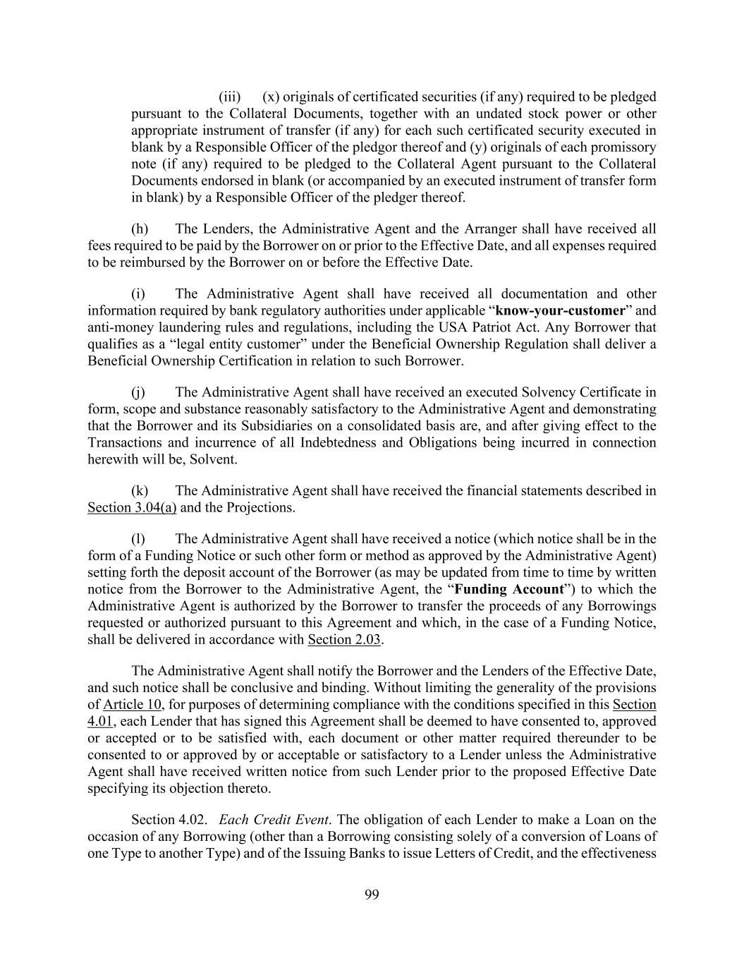 99 (iii) (x) originals of certificated securities (if any) required to be pledged pursuant to the Collateral Documents, together with an undated stock power or other appropriate instrument of transfer (if any) for each such certificated security executed in blank by a Responsible Officer of the pledgor thereof and (y) originals of each promissory note (if any) required to be pledged to the Collateral Agent pursuant to the Collateral Documents endorsed in blank (or accompanied by an executed instrument of transfer form in blank) by a Responsible Officer of the pledger thereof. (h) The Lenders, the Administrative Agent and the Arranger shall have received all fees required to be paid by the Borrower on or prior to the Effective Date, and all expenses required to be reimbursed by the Borrower on or before the Effective Date. (i) The Administrative Agent shall have received all documentation and other information required by bank regulatory authorities under applicable “know-your-customer” and anti-money laundering rules and regulations, including the USA Patriot Act. Any Borrower that qualifies as a “legal entity customer” under the Beneficial Ownership Regulation shall deliver a Beneficial Ownership Certification in relation to such Borrower. (j) The Administrative Agent shall have received an executed Solvency Certificate in form, scope and substance reasonably satisfactory to the Administrative Agent and demonstrating that the Borrower and its Subsidiaries on a consolidated basis are, and after giving effect to the Transactions and incurrence of all Indebtedness and Obligations being incurred in connection herewith will be, Solvent. (k) The Administrative Agent shall have received the financial statements described in Section 3.04(a) and the Projections. (l) The Administrative Agent shall have received a notice (which notice shall be in the form of a Funding Notice or such other form or method as approved by the Administrative Agent) setting forth the deposit account of the Borrower (as may be updated from time to time by written notice from the Borrower to the Administrative Agent, the “Funding Account”) to which the Administrative Agent is authorized by the Borrower to transfer the proceeds of any Borrowings requested or authorized pursuant to this Agreement and which, in the case of a Funding Notice, shall be delivered in accordance with Section 2.03. The Administrative Agent shall notify the Borrower and the Lenders of the Effective Date, and such notice shall be conclusive and binding. Without limiting the generality of the provisions of Article 10, for purposes of determining compliance with the conditions specified in this Section 4.01, each Lender that has signed this Agreement shall be deemed to have consented to, approved or accepted or to be satisfied with, each document or other matter required thereunder to be consented to or approved by or acceptable or satisfactory to a Lender unless the Administrative Agent shall have received written notice from such Lender prior to the proposed Effective Date specifying its objection thereto. Section 4.02. Each Credit Event. The obligation of each Lender to make a Loan on the occasion of any Borrowing (other than a Borrowing consisting solely of a conversion of Loans of one Type to another Type) and of the Issuing Banks to issue Letters of Credit, and the effectiveness