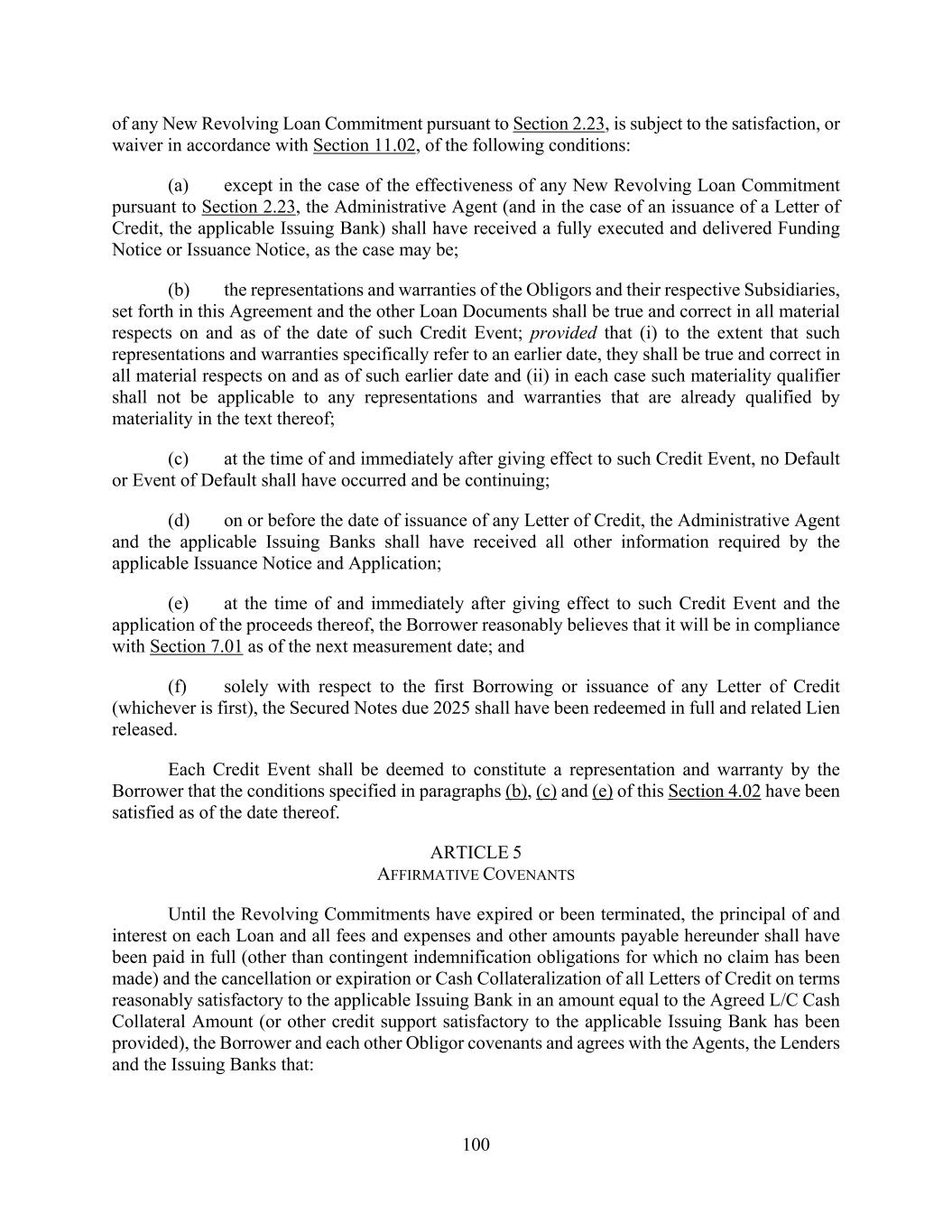 100 of any New Revolving Loan Commitment pursuant to Section 2.23, is subject to the satisfaction, or waiver in accordance with Section 11.02, of the following conditions: (a) except in the case of the effectiveness of any New Revolving Loan Commitment pursuant to Section 2.23, the Administrative Agent (and in the case of an issuance of a Letter of Credit, the applicable Issuing Bank) shall have received a fully executed and delivered Funding Notice or Issuance Notice, as the case may be; (b) the representations and warranties of the Obligors and their respective Subsidiaries, set forth in this Agreement and the other Loan Documents shall be true and correct in all material respects on and as of the date of such Credit Event; provided that (i) to the extent that such representations and warranties specifically refer to an earlier date, they shall be true and correct in all material respects on and as of such earlier date and (ii) in each case such materiality qualifier shall not be applicable to any representations and warranties that are already qualified by materiality in the text thereof; (c) at the time of and immediately after giving effect to such Credit Event, no Default or Event of Default shall have occurred and be continuing; (d) on or before the date of issuance of any Letter of Credit, the Administrative Agent and the applicable Issuing Banks shall have received all other information required by the applicable Issuance Notice and Application; (e) at the time of and immediately after giving effect to such Credit Event and the application of the proceeds thereof, the Borrower reasonably believes that it will be in compliance with Section 7.01 as of the next measurement date; and (f) solely with respect to the first Borrowing or issuance of any Letter of Credit (whichever is first), the Secured Notes due 2025 shall have been redeemed in full and related Lien released. Each Credit Event shall be deemed to constitute a representation and warranty by the Borrower that the conditions specified in paragraphs (b), (c) and (e) of this Section 4.02 have been satisfied as of the date thereof. ARTICLE 5 AFFIRMATIVE COVENANTS Until the Revolving Commitments have expired or been terminated, the principal of and interest on each Loan and all fees and expenses and other amounts payable hereunder shall have been paid in full (other than contingent indemnification obligations for which no claim has been made) and the cancellation or expiration or Cash Collateralization of all Letters of Credit on terms reasonably satisfactory to the applicable Issuing Bank in an amount equal to the Agreed L/C Cash Collateral Amount (or other credit support satisfactory to the applicable Issuing Bank has been provided), the Borrower and each other Obligor covenants and agrees with the Agents, the Lenders and the Issuing Banks that: