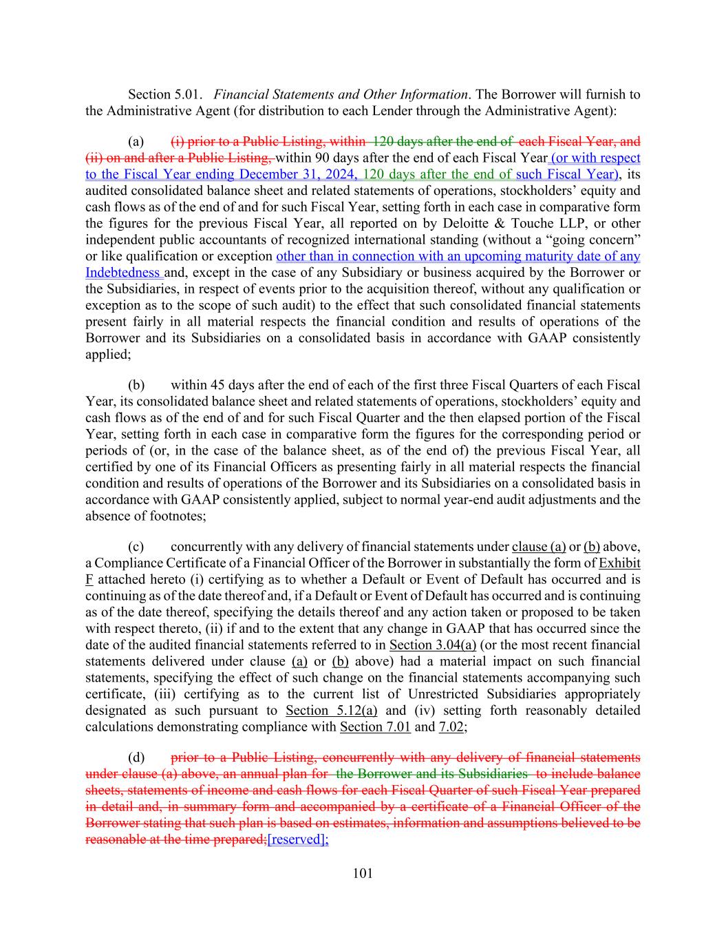 101 Section 5.01. Financial Statements and Other Information. The Borrower will furnish to the Administrative Agent (for distribution to each Lender through the Administrative Agent): (a) (i) prior to a Public Listing, within 120 days after the end of each Fiscal Year, and (ii) on and after a Public Listing, within 90 days after the end of each Fiscal Year (or with respect to the Fiscal Year ending December 31, 2024, 120 days after the end of such Fiscal Year), its audited consolidated balance sheet and related statements of operations, stockholders’ equity and cash flows as of the end of and for such Fiscal Year, setting forth in each case in comparative form the figures for the previous Fiscal Year, all reported on by Deloitte & Touche LLP, or other independent public accountants of recognized international standing (without a “going concern” or like qualification or exception other than in connection with an upcoming maturity date of any Indebtedness and, except in the case of any Subsidiary or business acquired by the Borrower or the Subsidiaries, in respect of events prior to the acquisition thereof, without any qualification or exception as to the scope of such audit) to the effect that such consolidated financial statements present fairly in all material respects the financial condition and results of operations of the Borrower and its Subsidiaries on a consolidated basis in accordance with GAAP consistently applied; (b) within 45 days after the end of each of the first three Fiscal Quarters of each Fiscal Year, its consolidated balance sheet and related statements of operations, stockholders’ equity and cash flows as of the end of and for such Fiscal Quarter and the then elapsed portion of the Fiscal Year, setting forth in each case in comparative form the figures for the corresponding period or periods of (or, in the case of the balance sheet, as of the end of) the previous Fiscal Year, all certified by one of its Financial Officers as presenting fairly in all material respects the financial condition and results of operations of the Borrower and its Subsidiaries on a consolidated basis in accordance with GAAP consistently applied, subject to normal year-end audit adjustments and the absence of footnotes; (c) concurrently with any delivery of financial statements under clause (a) or (b) above, a Compliance Certificate of a Financial Officer of the Borrower in substantially the form of Exhibit F attached hereto (i) certifying as to whether a Default or Event of Default has occurred and is continuing as of the date thereof and, if a Default or Event of Default has occurred and is continuing as of the date thereof, specifying the details thereof and any action taken or proposed to be taken with respect thereto, (ii) if and to the extent that any change in GAAP that has occurred since the date of the audited financial statements referred to in Section 3.04(a) (or the most recent financial statements delivered under clause (a) or (b) above) had a material impact on such financial statements, specifying the effect of such change on the financial statements accompanying such certificate, (iii) certifying as to the current list of Unrestricted Subsidiaries appropriately designated as such pursuant to Section 5.12(a) and (iv) setting forth reasonably detailed calculations demonstrating compliance with Section 7.01 and 7.02; (d) prior to a Public Listing, concurrently with any delivery of financial statements under clause (a) above, an annual plan for the Borrower and its Subsidiaries to include balance sheets, statements of income and cash flows for each Fiscal Quarter of such Fiscal Year prepared in detail and, in summary form and accompanied by a certificate of a Financial Officer of the Borrower stating that such plan is based on estimates, information and assumptions believed to be reasonable at the time prepared;[reserved];