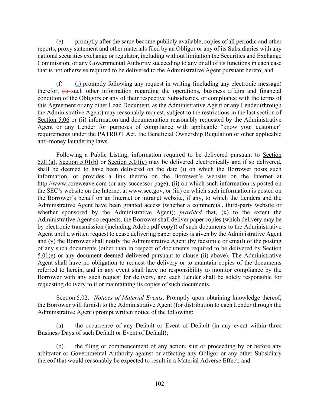102 (e) promptly after the same become publicly available, copies of all periodic and other reports, proxy statement and other materials filed by an Obligor or any of its Subsidiaries with any national securities exchange or regulator, including without limitation the Securities and Exchange Commission, or any Governmental Authority succeeding to any or all of its functions in each case that is not otherwise required to be delivered to the Administrative Agent pursuant hereto; and (f) (i) promptly following any request in writing (including any electronic message) therefor, (i) such other information regarding the operations, business affairs and financial condition of the Obligors or any of their respective Subsidiaries, or compliance with the terms of this Agreement or any other Loan Document, as the Administrative Agent or any Lender (through the Administrative Agent) may reasonably request, subject to the restrictions in the last section of Section 5.06 or (ii) information and documentation reasonably requested by the Administrative Agent or any Lender for purposes of compliance with applicable “know your customer” requirements under the PATRIOT Act, the Beneficial Ownership Regulation or other applicable anti-money laundering laws. Following a Public Listing, information required to be delivered pursuant to Section 5.01(a), Section 5.01(b) or Section 5.01(e) may be delivered electronically and if so delivered, shall be deemed to have been delivered on the date (i) on which the Borrower posts such information, or provides a link thereto on the Borrower’s website on the Internet at http://www.coreweave.com (or any successor page); (ii) on which such information is posted on the SEC’s website on the Internet at www.sec.gov; or (iii) on which such information is posted on the Borrower’s behalf on an Internet or intranet website, if any, to which the Lenders and the Administrative Agent have been granted access (whether a commercial, third-party website or whether sponsored by the Administrative Agent); provided that, (x) to the extent the Administrative Agent so requests, the Borrower shall deliver paper copies (which delivery may be by electronic transmission (including Adobe pdf copy)) of such documents to the Administrative Agent until a written request to cease delivering paper copies is given by the Administrative Agent and (y) the Borrower shall notify the Administrative Agent (by facsimile or email) of the posting of any such documents (other than in respect of documents required to be delivered by Section 5.01(e) or any document deemed delivered pursuant to clause (ii) above). The Administrative Agent shall have no obligation to request the delivery or to maintain copies of the documents referred to herein, and in any event shall have no responsibility to monitor compliance by the Borrower with any such request for delivery, and each Lender shall be solely responsible for requesting delivery to it or maintaining its copies of such documents. Section 5.02. Notices of Material Events. Promptly upon obtaining knowledge thereof, the Borrower will furnish to the Administrative Agent (for distribution to each Lender through the Administrative Agent) prompt written notice of the following: (a) the occurrence of any Default or Event of Default (in any event within three Business Days of such Default or Event of Default); (b) the filing or commencement of any action, suit or proceeding by or before any arbitrator or Governmental Authority against or affecting any Obligor or any other Subsidiary thereof that would reasonably be expected to result in a Material Adverse Effect; and
