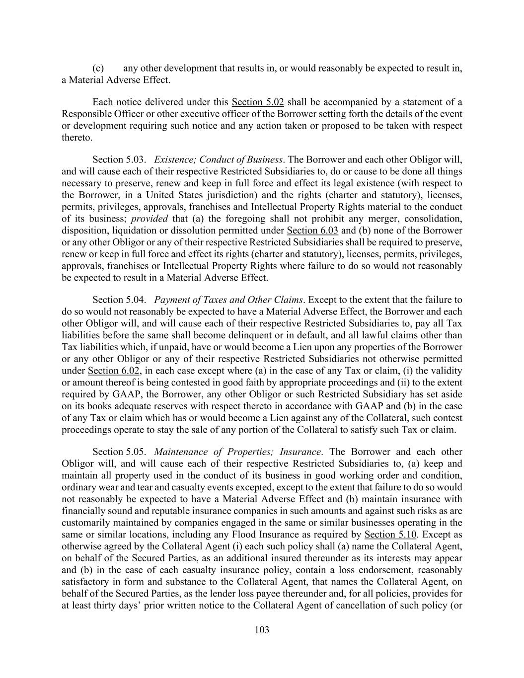 103 (c) any other development that results in, or would reasonably be expected to result in, a Material Adverse Effect. Each notice delivered under this Section 5.02 shall be accompanied by a statement of a Responsible Officer or other executive officer of the Borrower setting forth the details of the event or development requiring such notice and any action taken or proposed to be taken with respect thereto. Section 5.03. Existence; Conduct of Business. The Borrower and each other Obligor will, and will cause each of their respective Restricted Subsidiaries to, do or cause to be done all things necessary to preserve, renew and keep in full force and effect its legal existence (with respect to the Borrower, in a United States jurisdiction) and the rights (charter and statutory), licenses, permits, privileges, approvals, franchises and Intellectual Property Rights material to the conduct of its business; provided that (a) the foregoing shall not prohibit any merger, consolidation, disposition, liquidation or dissolution permitted under Section 6.03 and (b) none of the Borrower or any other Obligor or any of their respective Restricted Subsidiaries shall be required to preserve, renew or keep in full force and effect its rights (charter and statutory), licenses, permits, privileges, approvals, franchises or Intellectual Property Rights where failure to do so would not reasonably be expected to result in a Material Adverse Effect. Section 5.04. Payment of Taxes and Other Claims. Except to the extent that the failure to do so would not reasonably be expected to have a Material Adverse Effect, the Borrower and each other Obligor will, and will cause each of their respective Restricted Subsidiaries to, pay all Tax liabilities before the same shall become delinquent or in default, and all lawful claims other than Tax liabilities which, if unpaid, have or would become a Lien upon any properties of the Borrower or any other Obligor or any of their respective Restricted Subsidiaries not otherwise permitted under Section 6.02, in each case except where (a) in the case of any Tax or claim, (i) the validity or amount thereof is being contested in good faith by appropriate proceedings and (ii) to the extent required by GAAP, the Borrower, any other Obligor or such Restricted Subsidiary has set aside on its books adequate reserves with respect thereto in accordance with GAAP and (b) in the case of any Tax or claim which has or would become a Lien against any of the Collateral, such contest proceedings operate to stay the sale of any portion of the Collateral to satisfy such Tax or claim. Section 5.05. Maintenance of Properties; Insurance. The Borrower and each other Obligor will, and will cause each of their respective Restricted Subsidiaries to, (a) keep and maintain all property used in the conduct of its business in good working order and condition, ordinary wear and tear and casualty events excepted, except to the extent that failure to do so would not reasonably be expected to have a Material Adverse Effect and (b) maintain insurance with financially sound and reputable insurance companies in such amounts and against such risks as are customarily maintained by companies engaged in the same or similar businesses operating in the same or similar locations, including any Flood Insurance as required by Section 5.10. Except as otherwise agreed by the Collateral Agent (i) each such policy shall (a) name the Collateral Agent, on behalf of the Secured Parties, as an additional insured thereunder as its interests may appear and (b) in the case of each casualty insurance policy, contain a loss endorsement, reasonably satisfactory in form and substance to the Collateral Agent, that names the Collateral Agent, on behalf of the Secured Parties, as the lender loss payee thereunder and, for all policies, provides for at least thirty days’ prior written notice to the Collateral Agent of cancellation of such policy (or