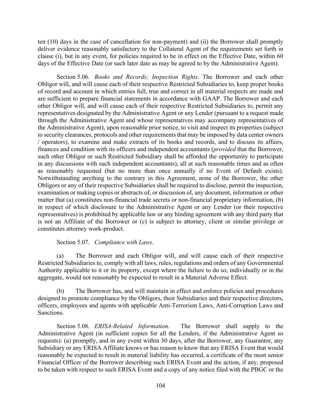 104 ten (10) days in the case of cancellation for non-payment) and (ii) the Borrower shall promptly deliver evidence reasonably satisfactory to the Collateral Agent of the requirements set forth in clause (i), but in any event, for policies required to be in effect on the Effective Date, within 60 days of the Effective Date (or such later date as may be agreed to by the Administrative Agent). Section 5.06. Books and Records; Inspection Rights. The Borrower and each other Obligor will, and will cause each of their respective Restricted Subsidiaries to, keep proper books of record and account in which entries full, true and correct in all material respects are made and are sufficient to prepare financial statements in accordance with GAAP. The Borrower and each other Obligor will, and will cause each of their respective Restricted Subsidiaries to, permit any representatives designated by the Administrative Agent or any Lender (pursuant to a request made through the Administrative Agent and whose representatives may accompany representatives of the Administrative Agent), upon reasonable prior notice, to visit and inspect its properties (subject to security clearances, protocols and other requirements that may be imposed by data center owners / operators), to examine and make extracts of its books and records, and to discuss its affairs, finances and condition with its officers and independent accountants (provided that the Borrower, such other Obligor or such Restricted Subsidiary shall be afforded the opportunity to participate in any discussions with such independent accountants), all at such reasonable times and as often as reasonably requested (but no more than once annually if no Event of Default exists). Notwithstanding anything to the contrary in this Agreement, none of the Borrower, the other Obligors or any of their respective Subsidiaries shall be required to disclose, permit the inspection, examination or making copies or abstracts of, or discussion of, any document, information or other matter that (a) constitutes non-financial trade secrets or non-financial proprietary information, (b) in respect of which disclosure to the Administrative Agent or any Lender (or their respective representatives) is prohibited by applicable law or any binding agreement with any third party that is not an Affiliate of the Borrower or (c) is subject to attorney, client or similar privilege or constitutes attorney work-product. Section 5.07. Compliance with Laws. (a) The Borrower and each Obligor will, and will cause each of their respective Restricted Subsidiaries to, comply with all laws, rules, regulations and orders of any Governmental Authority applicable to it or its property, except where the failure to do so, individually or in the aggregate, would not reasonably be expected to result in a Material Adverse Effect. (b) The Borrower has, and will maintain in effect and enforce policies and procedures designed to promote compliance by the Obligors, their Subsidiaries and their respective directors, officers, employees and agents with applicable Anti-Terrorism Laws, Anti-Corruption Laws and Sanctions. Section 5.08. ERISA-Related Information. The Borrower shall supply to the Administrative Agent (in sufficient copies for all the Lenders, if the Administrative Agent so requests): (a) promptly, and in any event within 30 days, after the Borrower, any Guarantor, any Subsidiary or any ERISA Affiliate knows or has reason to know that any ERISA Event that would reasonably be expected to result in material liability has occurred, a certificate of the most senior Financial Officer of the Borrower describing such ERISA Event and the action, if any, proposed to be taken with respect to such ERISA Event and a copy of any notice filed with the PBGC or the