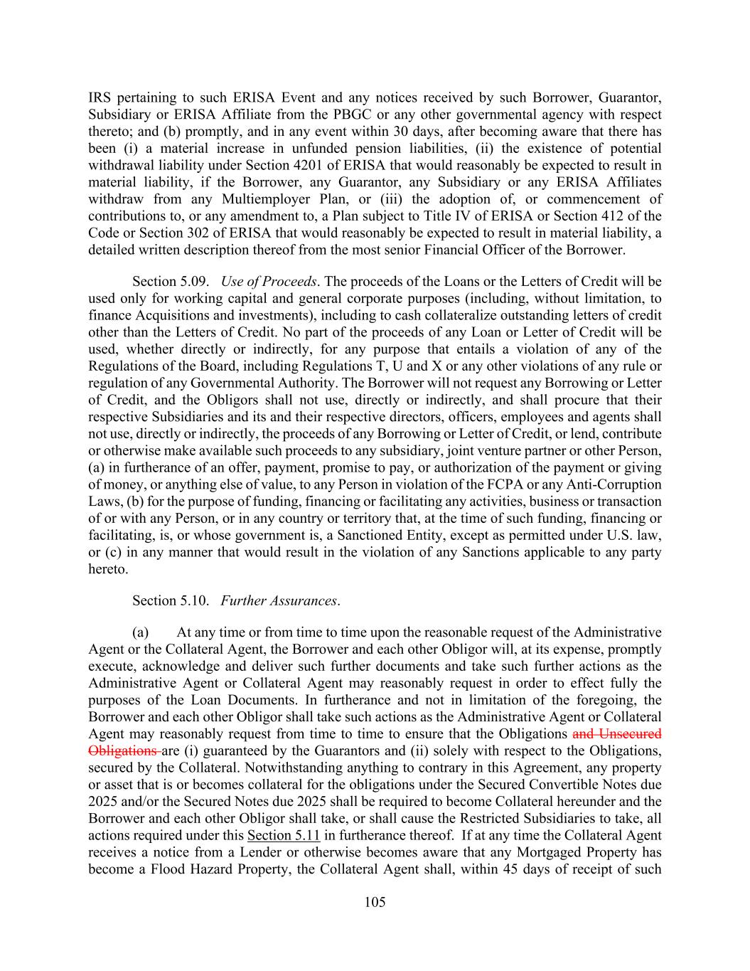 105 IRS pertaining to such ERISA Event and any notices received by such Borrower, Guarantor, Subsidiary or ERISA Affiliate from the PBGC or any other governmental agency with respect thereto; and (b) promptly, and in any event within 30 days, after becoming aware that there has been (i) a material increase in unfunded pension liabilities, (ii) the existence of potential withdrawal liability under Section 4201 of ERISA that would reasonably be expected to result in material liability, if the Borrower, any Guarantor, any Subsidiary or any ERISA Affiliates withdraw from any Multiemployer Plan, or (iii) the adoption of, or commencement of contributions to, or any amendment to, a Plan subject to Title IV of ERISA or Section 412 of the Code or Section 302 of ERISA that would reasonably be expected to result in material liability, a detailed written description thereof from the most senior Financial Officer of the Borrower. Section 5.09. Use of Proceeds. The proceeds of the Loans or the Letters of Credit will be used only for working capital and general corporate purposes (including, without limitation, to finance Acquisitions and investments), including to cash collateralize outstanding letters of credit other than the Letters of Credit. No part of the proceeds of any Loan or Letter of Credit will be used, whether directly or indirectly, for any purpose that entails a violation of any of the Regulations of the Board, including Regulations T, U and X or any other violations of any rule or regulation of any Governmental Authority. The Borrower will not request any Borrowing or Letter of Credit, and the Obligors shall not use, directly or indirectly, and shall procure that their respective Subsidiaries and its and their respective directors, officers, employees and agents shall not use, directly or indirectly, the proceeds of any Borrowing or Letter of Credit, or lend, contribute or otherwise make available such proceeds to any subsidiary, joint venture partner or other Person, (a) in furtherance of an offer, payment, promise to pay, or authorization of the payment or giving of money, or anything else of value, to any Person in violation of the FCPA or any Anti-Corruption Laws, (b) for the purpose of funding, financing or facilitating any activities, business or transaction of or with any Person, or in any country or territory that, at the time of such funding, financing or facilitating, is, or whose government is, a Sanctioned Entity, except as permitted under U.S. law, or (c) in any manner that would result in the violation of any Sanctions applicable to any party hereto. Section 5.10. Further Assurances. (a) At any time or from time to time upon the reasonable request of the Administrative Agent or the Collateral Agent, the Borrower and each other Obligor will, at its expense, promptly execute, acknowledge and deliver such further documents and take such further actions as the Administrative Agent or Collateral Agent may reasonably request in order to effect fully the purposes of the Loan Documents. In furtherance and not in limitation of the foregoing, the Borrower and each other Obligor shall take such actions as the Administrative Agent or Collateral Agent may reasonably request from time to time to ensure that the Obligations and Unsecured Obligations are (i) guaranteed by the Guarantors and (ii) solely with respect to the Obligations, secured by the Collateral. Notwithstanding anything to contrary in this Agreement, any property or asset that is or becomes collateral for the obligations under the Secured Convertible Notes due 2025 and/or the Secured Notes due 2025 shall be required to become Collateral hereunder and the Borrower and each other Obligor shall take, or shall cause the Restricted Subsidiaries to take, all actions required under this Section 5.11 in furtherance thereof. If at any time the Collateral Agent receives a notice from a Lender or otherwise becomes aware that any Mortgaged Property has become a Flood Hazard Property, the Collateral Agent shall, within 45 days of receipt of such