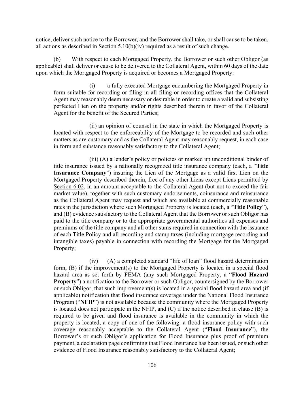 106 notice, deliver such notice to the Borrower, and the Borrower shall take, or shall cause to be taken, all actions as described in Section 5.10(b)(iv) required as a result of such change. (b) With respect to each Mortgaged Property, the Borrower or such other Obligor (as applicable) shall deliver or cause to be delivered to the Collateral Agent, within 60 days of the date upon which the Mortgaged Property is acquired or becomes a Mortgaged Property: (i) a fully executed Mortgage encumbering the Mortgaged Property in form suitable for recording or filing in all filing or recording offices that the Collateral Agent may reasonably deem necessary or desirable in order to create a valid and subsisting perfected Lien on the property and/or rights described therein in favor of the Collateral Agent for the benefit of the Secured Parties; (ii) an opinion of counsel in the state in which the Mortgaged Property is located with respect to the enforceability of the Mortgage to be recorded and such other matters as are customary and as the Collateral Agent may reasonably request, in each case in form and substance reasonably satisfactory to the Collateral Agent; (iii) (A) a lender’s policy or policies or marked up unconditional binder of title insurance issued by a nationally recognized title insurance company (each, a “Title Insurance Company”) insuring the Lien of the Mortgage as a valid first Lien on the Mortgaged Property described therein, free of any other Liens except Liens permitted by Section 6.02, in an amount acceptable to the Collateral Agent (but not to exceed the fair market value), together with such customary endorsements, coinsurance and reinsurance as the Collateral Agent may request and which are available at commercially reasonable rates in the jurisdiction where such Mortgaged Property is located (each, a “Title Policy”), and (B) evidence satisfactory to the Collateral Agent that the Borrower or such Obligor has paid to the title company or to the appropriate governmental authorities all expenses and premiums of the title company and all other sums required in connection with the issuance of each Title Policy and all recording and stamp taxes (including mortgage recording and intangible taxes) payable in connection with recording the Mortgage for the Mortgaged Property; (iv) (A) a completed standard “life of loan” flood hazard determination form, (B) if the improvement(s) to the Mortgaged Property is located in a special flood hazard area as set forth by FEMA (any such Mortgaged Property, a “Flood Hazard Property”) a notification to the Borrower or such Obligor, countersigned by the Borrower or such Obligor, that such improvement(s) is located in a special flood hazard area and (if applicable) notification that flood insurance coverage under the National Flood Insurance Program (“NFIP”) is not available because the community where the Mortgaged Property is located does not participate in the NFIP, and (C) if the notice described in clause (B) is required to be given and flood insurance is available in the community in which the property is located, a copy of one of the following: a flood insurance policy with such coverage reasonably acceptable to the Collateral Agent (“Flood Insurance”), the Borrower’s or such Obligor’s application for Flood Insurance plus proof of premium payment, a declaration page confirming that Flood Insurance has been issued, or such other evidence of Flood Insurance reasonably satisfactory to the Collateral Agent;