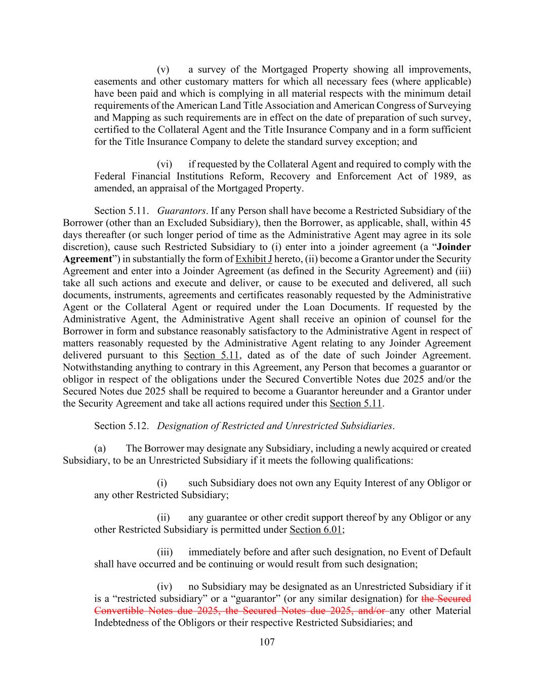 107 (v) a survey of the Mortgaged Property showing all improvements, easements and other customary matters for which all necessary fees (where applicable) have been paid and which is complying in all material respects with the minimum detail requirements of the American Land Title Association and American Congress of Surveying and Mapping as such requirements are in effect on the date of preparation of such survey, certified to the Collateral Agent and the Title Insurance Company and in a form sufficient for the Title Insurance Company to delete the standard survey exception; and (vi) if requested by the Collateral Agent and required to comply with the Federal Financial Institutions Reform, Recovery and Enforcement Act of 1989, as amended, an appraisal of the Mortgaged Property. Section 5.11. Guarantors. If any Person shall have become a Restricted Subsidiary of the Borrower (other than an Excluded Subsidiary), then the Borrower, as applicable, shall, within 45 days thereafter (or such longer period of time as the Administrative Agent may agree in its sole discretion), cause such Restricted Subsidiary to (i) enter into a joinder agreement (a “Joinder Agreement”) in substantially the form of Exhibit J hereto, (ii) become a Grantor under the Security Agreement and enter into a Joinder Agreement (as defined in the Security Agreement) and (iii) take all such actions and execute and deliver, or cause to be executed and delivered, all such documents, instruments, agreements and certificates reasonably requested by the Administrative Agent or the Collateral Agent or required under the Loan Documents. If requested by the Administrative Agent, the Administrative Agent shall receive an opinion of counsel for the Borrower in form and substance reasonably satisfactory to the Administrative Agent in respect of matters reasonably requested by the Administrative Agent relating to any Joinder Agreement delivered pursuant to this Section 5.11, dated as of the date of such Joinder Agreement. Notwithstanding anything to contrary in this Agreement, any Person that becomes a guarantor or obligor in respect of the obligations under the Secured Convertible Notes due 2025 and/or the Secured Notes due 2025 shall be required to become a Guarantor hereunder and a Grantor under the Security Agreement and take all actions required under this Section 5.11. Section 5.12. Designation of Restricted and Unrestricted Subsidiaries. (a) The Borrower may designate any Subsidiary, including a newly acquired or created Subsidiary, to be an Unrestricted Subsidiary if it meets the following qualifications: (i) such Subsidiary does not own any Equity Interest of any Obligor or any other Restricted Subsidiary; (ii) any guarantee or other credit support thereof by any Obligor or any other Restricted Subsidiary is permitted under Section 6.01; (iii) immediately before and after such designation, no Event of Default shall have occurred and be continuing or would result from such designation; (iv) no Subsidiary may be designated as an Unrestricted Subsidiary if it is a “restricted subsidiary” or a “guarantor” (or any similar designation) for the Secured Convertible Notes due 2025, the Secured Notes due 2025, and/or any other Material Indebtedness of the Obligors or their respective Restricted Subsidiaries; and