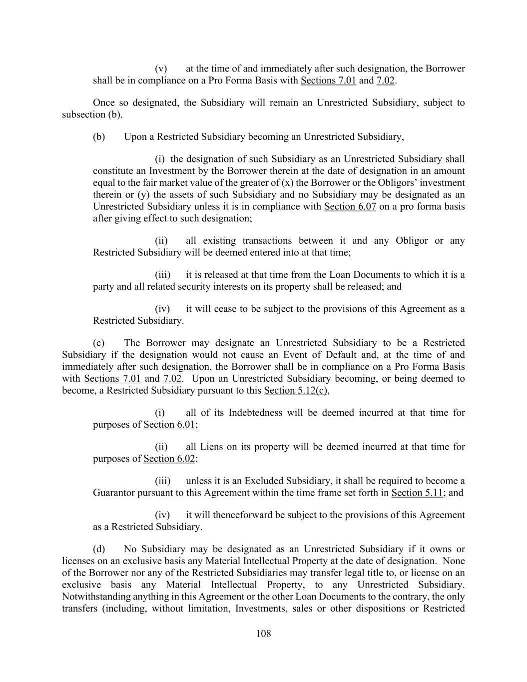 108 (v) at the time of and immediately after such designation, the Borrower shall be in compliance on a Pro Forma Basis with Sections 7.01 and 7.02. Once so designated, the Subsidiary will remain an Unrestricted Subsidiary, subject to subsection (b). (b) Upon a Restricted Subsidiary becoming an Unrestricted Subsidiary, (i) the designation of such Subsidiary as an Unrestricted Subsidiary shall constitute an Investment by the Borrower therein at the date of designation in an amount equal to the fair market value of the greater of (x) the Borrower or the Obligors’ investment therein or (y) the assets of such Subsidiary and no Subsidiary may be designated as an Unrestricted Subsidiary unless it is in compliance with Section 6.07 on a pro forma basis after giving effect to such designation; (ii) all existing transactions between it and any Obligor or any Restricted Subsidiary will be deemed entered into at that time; (iii) it is released at that time from the Loan Documents to which it is a party and all related security interests on its property shall be released; and (iv) it will cease to be subject to the provisions of this Agreement as a Restricted Subsidiary. (c) The Borrower may designate an Unrestricted Subsidiary to be a Restricted Subsidiary if the designation would not cause an Event of Default and, at the time of and immediately after such designation, the Borrower shall be in compliance on a Pro Forma Basis with Sections 7.01 and 7.02. Upon an Unrestricted Subsidiary becoming, or being deemed to become, a Restricted Subsidiary pursuant to this Section 5.12(c), (i) all of its Indebtedness will be deemed incurred at that time for purposes of Section 6.01; (ii) all Liens on its property will be deemed incurred at that time for purposes of Section 6.02; (iii) unless it is an Excluded Subsidiary, it shall be required to become a Guarantor pursuant to this Agreement within the time frame set forth in Section 5.11; and (iv) it will thenceforward be subject to the provisions of this Agreement as a Restricted Subsidiary. (d) No Subsidiary may be designated as an Unrestricted Subsidiary if it owns or licenses on an exclusive basis any Material Intellectual Property at the date of designation. None of the Borrower nor any of the Restricted Subsidiaries may transfer legal title to, or license on an exclusive basis any Material Intellectual Property, to any Unrestricted Subsidiary. Notwithstanding anything in this Agreement or the other Loan Documents to the contrary, the only transfers (including, without limitation, Investments, sales or other dispositions or Restricted