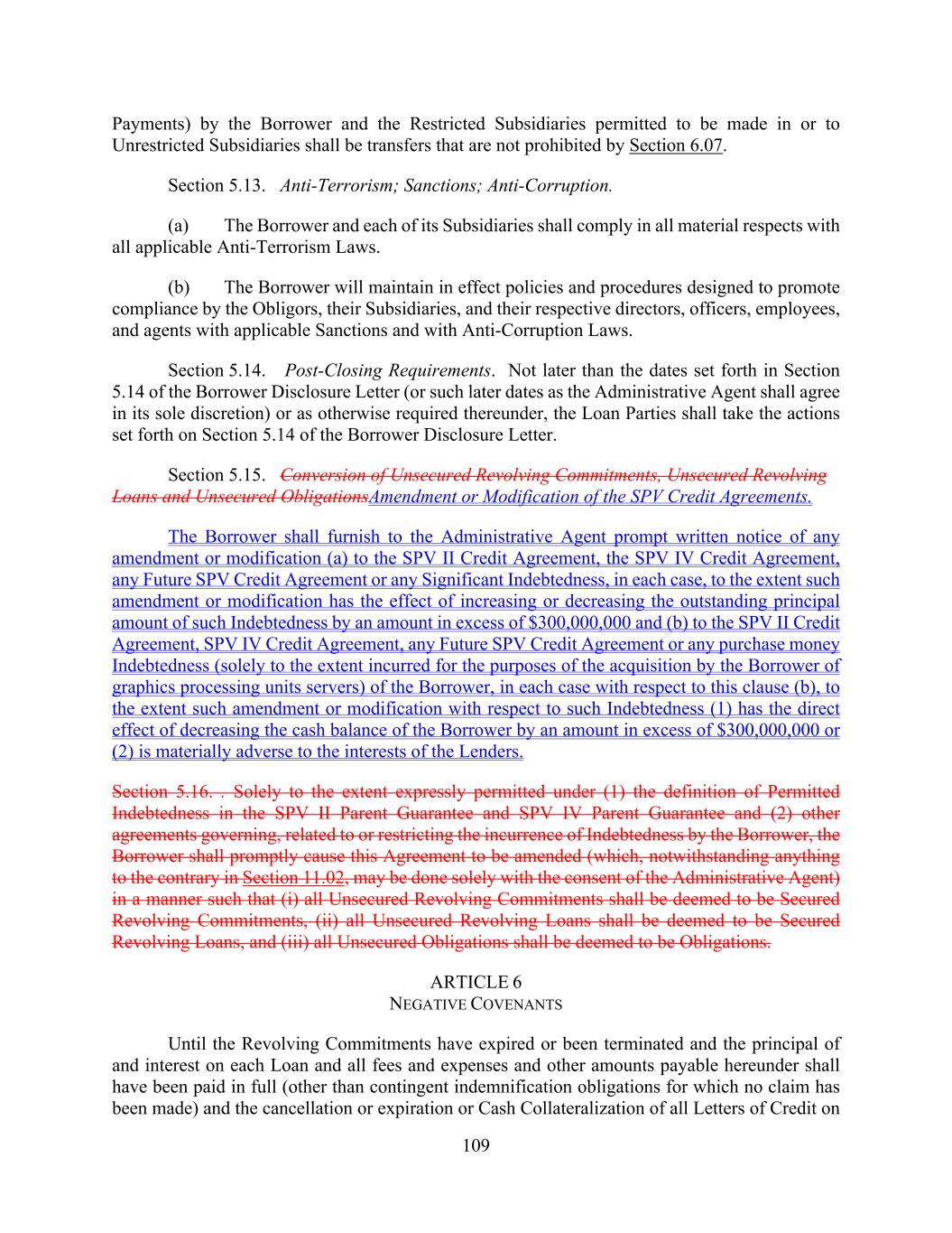 109 Payments) by the Borrower and the Restricted Subsidiaries permitted to be made in or to Unrestricted Subsidiaries shall be transfers that are not prohibited by Section 6.07. Section 5.13. Anti-Terrorism; Sanctions; Anti-Corruption. (a) The Borrower and each of its Subsidiaries shall comply in all material respects with all applicable Anti-Terrorism Laws. (b) The Borrower will maintain in effect policies and procedures designed to promote compliance by the Obligors, their Subsidiaries, and their respective directors, officers, employees, and agents with applicable Sanctions and with Anti-Corruption Laws. Section 5.14. Post-Closing Requirements. Not later than the dates set forth in Section 5.14 of the Borrower Disclosure Letter (or such later dates as the Administrative Agent shall agree in its sole discretion) or as otherwise required thereunder, the Loan Parties shall take the actions set forth on Section 5.14 of the Borrower Disclosure Letter. Section 5.15. Conversion of Unsecured Revolving Commitments, Unsecured Revolving Loans and Unsecured ObligationsAmendment or Modification of the SPV Credit Agreements. The Borrower shall furnish to the Administrative Agent prompt written notice of any amendment or modification (a) to the SPV II Credit Agreement, the SPV IV Credit Agreement, any Future SPV Credit Agreement or any Significant Indebtedness, in each case, to the extent such amendment or modification has the effect of increasing or decreasing the outstanding principal amount of such Indebtedness by an amount in excess of $300,000,000 and (b) to the SPV II Credit Agreement, SPV IV Credit Agreement, any Future SPV Credit Agreement or any purchase money Indebtedness (solely to the extent incurred for the purposes of the acquisition by the Borrower of graphics processing units servers) of the Borrower, in each case with respect to this clause (b), to the extent such amendment or modification with respect to such Indebtedness (1) has the direct effect of decreasing the cash balance of the Borrower by an amount in excess of $300,000,000 or (2) is materially adverse to the interests of the Lenders. Section 5.16. . Solely to the extent expressly permitted under (1) the definition of Permitted Indebtedness in the SPV II Parent Guarantee and SPV IV Parent Guarantee and (2) other agreements governing, related to or restricting the incurrence of Indebtedness by the Borrower, the Borrower shall promptly cause this Agreement to be amended (which, notwithstanding anything to the contrary in Section 11.02, may be done solely with the consent of the Administrative Agent) in a manner such that (i) all Unsecured Revolving Commitments shall be deemed to be Secured Revolving Commitments, (ii) all Unsecured Revolving Loans shall be deemed to be Secured Revolving Loans, and (iii) all Unsecured Obligations shall be deemed to be Obligations. ARTICLE 6 NEGATIVE COVENANTS Until the Revolving Commitments have expired or been terminated and the principal of and interest on each Loan and all fees and expenses and other amounts payable hereunder shall have been paid in full (other than contingent indemnification obligations for which no claim has been made) and the cancellation or expiration or Cash Collateralization of all Letters of Credit on