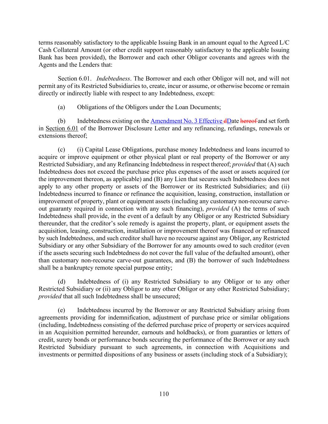 110 terms reasonably satisfactory to the applicable Issuing Bank in an amount equal to the Agreed L/C Cash Collateral Amount (or other credit support reasonably satisfactory to the applicable Issuing Bank has been provided), the Borrower and each other Obligor covenants and agrees with the Agents and the Lenders that: Section 6.01. Indebtedness. The Borrower and each other Obligor will not, and will not permit any of its Restricted Subsidiaries to, create, incur or assume, or otherwise become or remain directly or indirectly liable with respect to any Indebtedness, except: (a) Obligations of the Obligors under the Loan Documents; (b) Indebtedness existing on the Amendment No. 3 Effective dDate hereof and set forth in Section 6.01 of the Borrower Disclosure Letter and any refinancing, refundings, renewals or extensions thereof; (c) (i) Capital Lease Obligations, purchase money Indebtedness and loans incurred to acquire or improve equipment or other physical plant or real property of the Borrower or any Restricted Subsidiary, and any Refinancing Indebtedness in respect thereof; provided that (A) such Indebtedness does not exceed the purchase price plus expenses of the asset or assets acquired (or the improvement thereon, as applicable) and (B) any Lien that secures such Indebtedness does not apply to any other property or assets of the Borrower or its Restricted Subsidiaries; and (ii) Indebtedness incurred to finance or refinance the acquisition, leasing, construction, installation or improvement of property, plant or equipment assets (including any customary non-recourse carve- out guaranty required in connection with any such financing), provided (A) the terms of such Indebtedness shall provide, in the event of a default by any Obligor or any Restricted Subsidiary thereunder, that the creditor’s sole remedy is against the property, plant, or equipment assets the acquisition, leasing, construction, installation or improvement thereof was financed or refinanced by such Indebtedness, and such creditor shall have no recourse against any Obligor, any Restricted Subsidiary or any other Subsidiary of the Borrower for any amounts owed to such creditor (even if the assets securing such Indebtedness do not cover the full value of the defaulted amount), other than customary non-recourse carve-out guarantees, and (B) the borrower of such Indebtedness shall be a bankruptcy remote special purpose entity; (d) Indebtedness of (i) any Restricted Subsidiary to any Obligor or to any other Restricted Subsidiary or (ii) any Obligor to any other Obligor or any other Restricted Subsidiary; provided that all such Indebtedness shall be unsecured; (e) Indebtedness incurred by the Borrower or any Restricted Subsidiary arising from agreements providing for indemnification, adjustment of purchase price or similar obligations (including, Indebtedness consisting of the deferred purchase price of property or services acquired in an Acquisition permitted hereunder, earnouts and holdbacks), or from guaranties or letters of credit, surety bonds or performance bonds securing the performance of the Borrower or any such Restricted Subsidiary pursuant to such agreements, in connection with Acquisitions and investments or permitted dispositions of any business or assets (including stock of a Subsidiary);