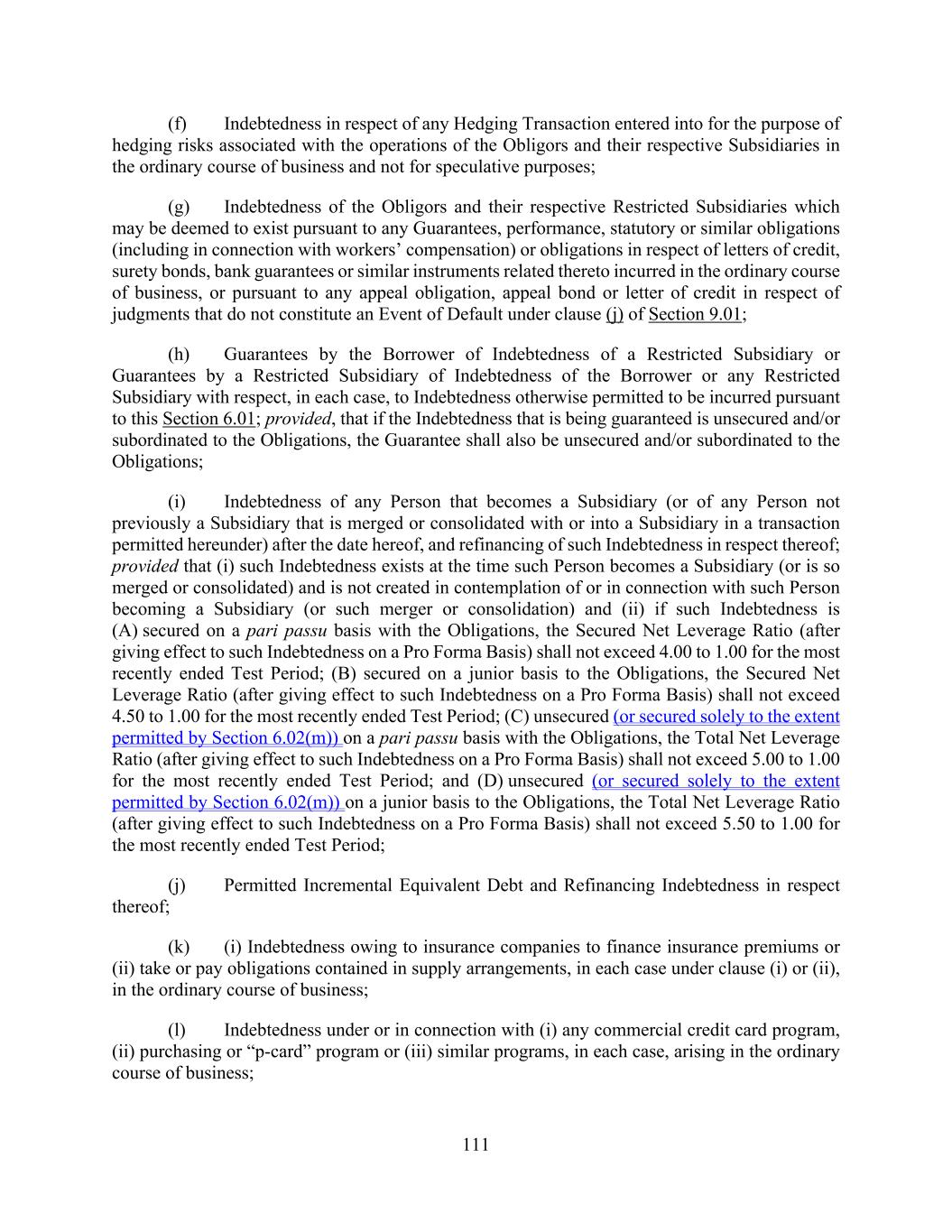 111 (f) Indebtedness in respect of any Hedging Transaction entered into for the purpose of hedging risks associated with the operations of the Obligors and their respective Subsidiaries in the ordinary course of business and not for speculative purposes; (g) Indebtedness of the Obligors and their respective Restricted Subsidiaries which may be deemed to exist pursuant to any Guarantees, performance, statutory or similar obligations (including in connection with workers’ compensation) or obligations in respect of letters of credit, surety bonds, bank guarantees or similar instruments related thereto incurred in the ordinary course of business, or pursuant to any appeal obligation, appeal bond or letter of credit in respect of judgments that do not constitute an Event of Default under clause (j) of Section 9.01; (h) Guarantees by the Borrower of Indebtedness of a Restricted Subsidiary or Guarantees by a Restricted Subsidiary of Indebtedness of the Borrower or any Restricted Subsidiary with respect, in each case, to Indebtedness otherwise permitted to be incurred pursuant to this Section 6.01; provided, that if the Indebtedness that is being guaranteed is unsecured and/or subordinated to the Obligations, the Guarantee shall also be unsecured and/or subordinated to the Obligations; (i) Indebtedness of any Person that becomes a Subsidiary (or of any Person not previously a Subsidiary that is merged or consolidated with or into a Subsidiary in a transaction permitted hereunder) after the date hereof, and refinancing of such Indebtedness in respect thereof; provided that (i) such Indebtedness exists at the time such Person becomes a Subsidiary (or is so merged or consolidated) and is not created in contemplation of or in connection with such Person becoming a Subsidiary (or such merger or consolidation) and (ii) if such Indebtedness is (A) secured on a pari passu basis with the Obligations, the Secured Net Leverage Ratio (after giving effect to such Indebtedness on a Pro Forma Basis) shall not exceed 4.00 to 1.00 for the most recently ended Test Period; (B) secured on a junior basis to the Obligations, the Secured Net Leverage Ratio (after giving effect to such Indebtedness on a Pro Forma Basis) shall not exceed 4.50 to 1.00 for the most recently ended Test Period; (C) unsecured (or secured solely to the extent permitted by Section 6.02(m)) on a pari passu basis with the Obligations, the Total Net Leverage Ratio (after giving effect to such Indebtedness on a Pro Forma Basis) shall not exceed 5.00 to 1.00 for the most recently ended Test Period; and (D) unsecured (or secured solely to the extent permitted by Section 6.02(m)) on a junior basis to the Obligations, the Total Net Leverage Ratio (after giving effect to such Indebtedness on a Pro Forma Basis) shall not exceed 5.50 to 1.00 for the most recently ended Test Period; (j) Permitted Incremental Equivalent Debt and Refinancing Indebtedness in respect thereof; (k) (i) Indebtedness owing to insurance companies to finance insurance premiums or (ii) take or pay obligations contained in supply arrangements, in each case under clause (i) or (ii), in the ordinary course of business; (l) Indebtedness under or in connection with (i) any commercial credit card program, (ii) purchasing or “p-card” program or (iii) similar programs, in each case, arising in the ordinary course of business;