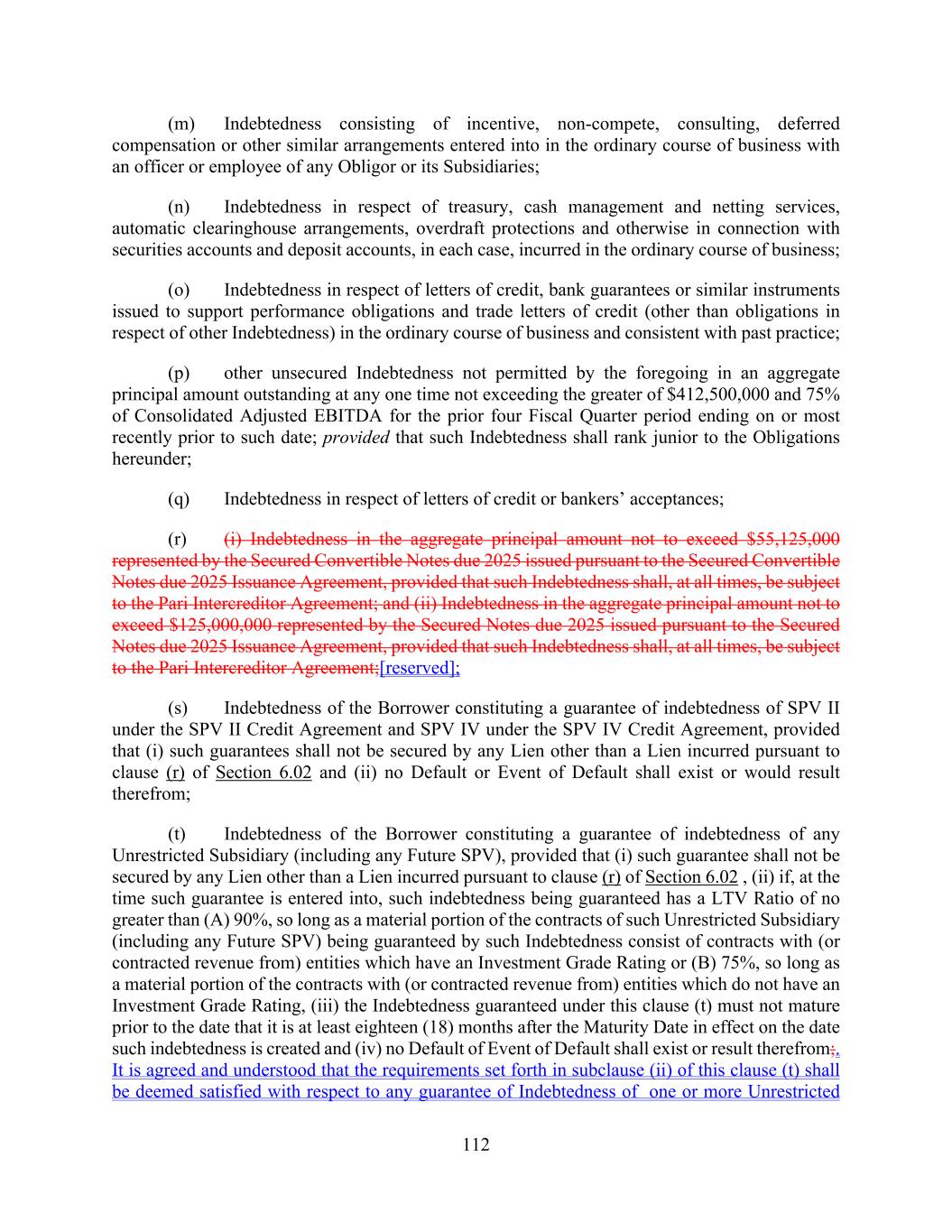 112 (m) Indebtedness consisting of incentive, non-compete, consulting, deferred compensation or other similar arrangements entered into in the ordinary course of business with an officer or employee of any Obligor or its Subsidiaries; (n) Indebtedness in respect of treasury, cash management and netting services, automatic clearinghouse arrangements, overdraft protections and otherwise in connection with securities accounts and deposit accounts, in each case, incurred in the ordinary course of business; (o) Indebtedness in respect of letters of credit, bank guarantees or similar instruments issued to support performance obligations and trade letters of credit (other than obligations in respect of other Indebtedness) in the ordinary course of business and consistent with past practice; (p) other unsecured Indebtedness not permitted by the foregoing in an aggregate principal amount outstanding at any one time not exceeding the greater of $412,500,000 and 75% of Consolidated Adjusted EBITDA for the prior four Fiscal Quarter period ending on or most recently prior to such date; provided that such Indebtedness shall rank junior to the Obligations hereunder; (q) Indebtedness in respect of letters of credit or bankers’ acceptances; (r) (i) Indebtedness in the aggregate principal amount not to exceed $55,125,000 represented by the Secured Convertible Notes due 2025 issued pursuant to the Secured Convertible Notes due 2025 Issuance Agreement, provided that such Indebtedness shall, at all times, be subject to the Pari Intercreditor Agreement; and (ii) Indebtedness in the aggregate principal amount not to exceed $125,000,000 represented by the Secured Notes due 2025 issued pursuant to the Secured Notes due 2025 Issuance Agreement, provided that such Indebtedness shall, at all times, be subject to the Pari Intercreditor Agreement;[reserved]; (s) Indebtedness of the Borrower constituting a guarantee of indebtedness of SPV II under the SPV II Credit Agreement and SPV IV under the SPV IV Credit Agreement, provided that (i) such guarantees shall not be secured by any Lien other than a Lien incurred pursuant to clause (r) of Section 6.02 and (ii) no Default or Event of Default shall exist or would result therefrom; (t) Indebtedness of the Borrower constituting a guarantee of indebtedness of any Unrestricted Subsidiary (including any Future SPV), provided that (i) such guarantee shall not be secured by any Lien other than a Lien incurred pursuant to clause (r) of Section 6.02 , (ii) if, at the time such guarantee is entered into, such indebtedness being guaranteed has a LTV Ratio of no greater than (A) 90%, so long as a material portion of the contracts of such Unrestricted Subsidiary (including any Future SPV) being guaranteed by such Indebtedness consist of contracts with (or contracted revenue from) entities which have an Investment Grade Rating or (B) 75%, so long as a material portion of the contracts with (or contracted revenue from) entities which do not have an Investment Grade Rating, (iii) the Indebtedness guaranteed under this clause (t) must not mature prior to the date that it is at least eighteen (18) months after the Maturity Date in effect on the date such indebtedness is created and (iv) no Default of Event of Default shall exist or result therefrom;. It is agreed and understood that the requirements set forth in subclause (ii) of this clause (t) shall be deemed satisfied with respect to any guarantee of Indebtedness of one or more Unrestricted