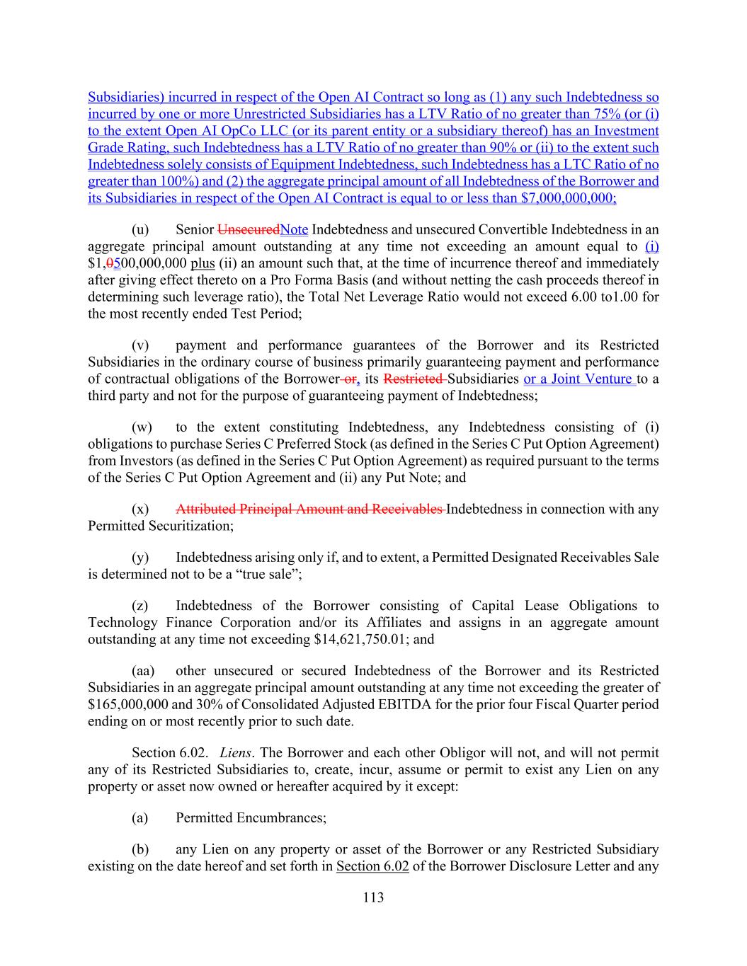 113 Subsidiaries) incurred in respect of the Open AI Contract so long as (1) any such Indebtedness so incurred by one or more Unrestricted Subsidiaries has a LTV Ratio of no greater than 75% (or (i) to the extent Open AI OpCo LLC (or its parent entity or a subsidiary thereof) has an Investment Grade Rating, such Indebtedness has a LTV Ratio of no greater than 90% or (ii) to the extent such Indebtedness solely consists of Equipment Indebtedness, such Indebtedness has a LTC Ratio of no greater than 100%) and (2) the aggregate principal amount of all Indebtedness of the Borrower and its Subsidiaries in respect of the Open AI Contract is equal to or less than $7,000,000,000; (u) Senior UnsecuredNote Indebtedness and unsecured Convertible Indebtedness in an aggregate principal amount outstanding at any time not exceeding an amount equal to (i) $1,0500,000,000 plus (ii) an amount such that, at the time of incurrence thereof and immediately after giving effect thereto on a Pro Forma Basis (and without netting the cash proceeds thereof in determining such leverage ratio), the Total Net Leverage Ratio would not exceed 6.00 to1.00 for the most recently ended Test Period; (v) payment and performance guarantees of the Borrower and its Restricted Subsidiaries in the ordinary course of business primarily guaranteeing payment and performance of contractual obligations of the Borrower or, its Restricted Subsidiaries or a Joint Venture to a third party and not for the purpose of guaranteeing payment of Indebtedness; (w) to the extent constituting Indebtedness, any Indebtedness consisting of (i) obligations to purchase Series C Preferred Stock (as defined in the Series C Put Option Agreement) from Investors (as defined in the Series C Put Option Agreement) as required pursuant to the terms of the Series C Put Option Agreement and (ii) any Put Note; and (x) Attributed Principal Amount and Receivables Indebtedness in connection with any Permitted Securitization; (y) Indebtedness arising only if, and to extent, a Permitted Designated Receivables Sale is determined not to be a “true sale”; (z) Indebtedness of the Borrower consisting of Capital Lease Obligations to Technology Finance Corporation and/or its Affiliates and assigns in an aggregate amount outstanding at any time not exceeding $14,621,750.01; and (aa) other unsecured or secured Indebtedness of the Borrower and its Restricted Subsidiaries in an aggregate principal amount outstanding at any time not exceeding the greater of $165,000,000 and 30% of Consolidated Adjusted EBITDA for the prior four Fiscal Quarter period ending on or most recently prior to such date. Section 6.02. Liens. The Borrower and each other Obligor will not, and will not permit any of its Restricted Subsidiaries to, create, incur, assume or permit to exist any Lien on any property or asset now owned or hereafter acquired by it except: (a) Permitted Encumbrances; (b) any Lien on any property or asset of the Borrower or any Restricted Subsidiary existing on the date hereof and set forth in Section 6.02 of the Borrower Disclosure Letter and any