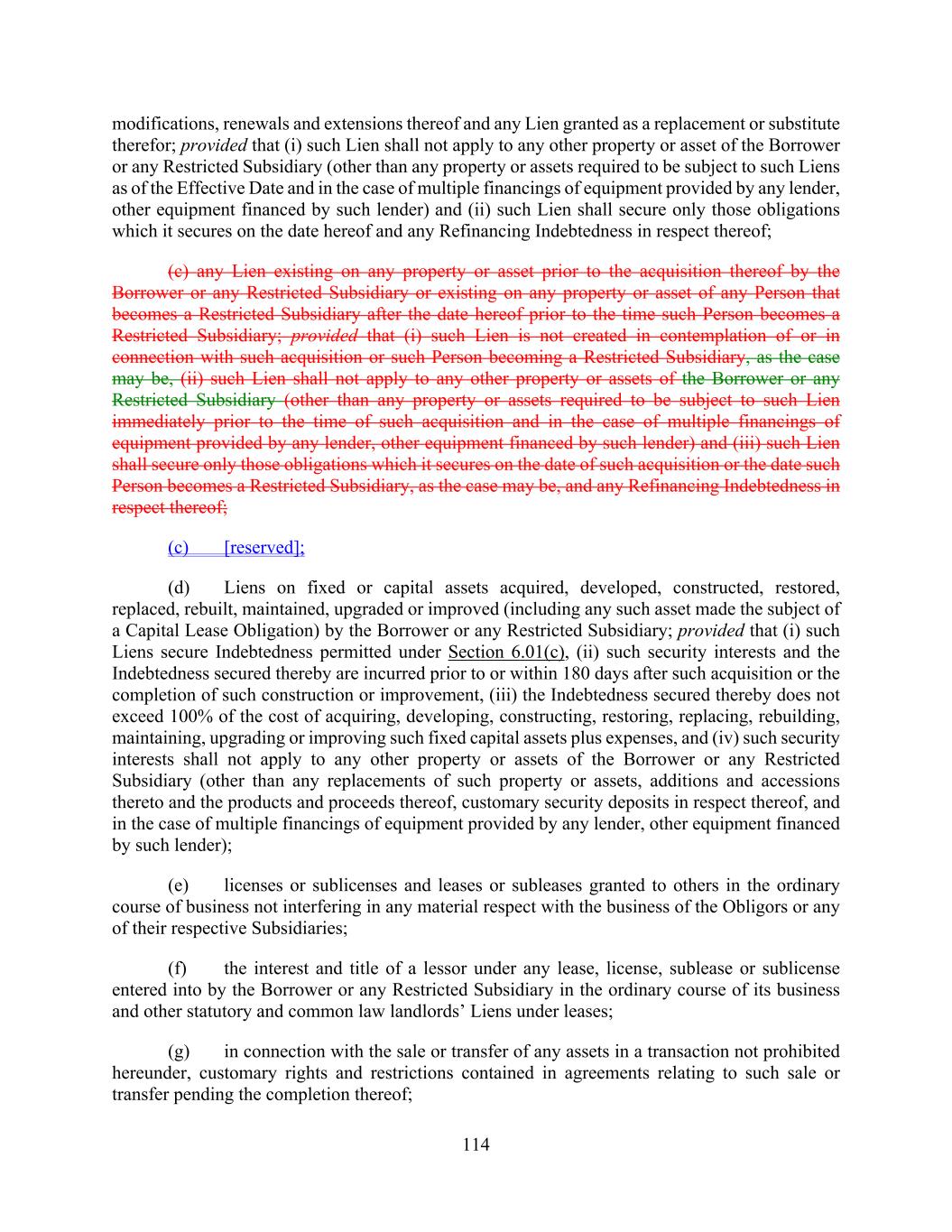 114 modifications, renewals and extensions thereof and any Lien granted as a replacement or substitute therefor; provided that (i) such Lien shall not apply to any other property or asset of the Borrower or any Restricted Subsidiary (other than any property or assets required to be subject to such Liens as of the Effective Date and in the case of multiple financings of equipment provided by any lender, other equipment financed by such lender) and (ii) such Lien shall secure only those obligations which it secures on the date hereof and any Refinancing Indebtedness in respect thereof; (c) any Lien existing on any property or asset prior to the acquisition thereof by the Borrower or any Restricted Subsidiary or existing on any property or asset of any Person that becomes a Restricted Subsidiary after the date hereof prior to the time such Person becomes a Restricted Subsidiary; provided that (i) such Lien is not created in contemplation of or in connection with such acquisition or such Person becoming a Restricted Subsidiary, as the case may be, (ii) such Lien shall not apply to any other property or assets of the Borrower or any Restricted Subsidiary (other than any property or assets required to be subject to such Lien immediately prior to the time of such acquisition and in the case of multiple financings of equipment provided by any lender, other equipment financed by such lender) and (iii) such Lien shall secure only those obligations which it secures on the date of such acquisition or the date such Person becomes a Restricted Subsidiary, as the case may be, and any Refinancing Indebtedness in respect thereof; (c) [reserved]; (d) Liens on fixed or capital assets acquired, developed, constructed, restored, replaced, rebuilt, maintained, upgraded or improved (including any such asset made the subject of a Capital Lease Obligation) by the Borrower or any Restricted Subsidiary; provided that (i) such Liens secure Indebtedness permitted under Section 6.01(c), (ii) such security interests and the Indebtedness secured thereby are incurred prior to or within 180 days after such acquisition or the completion of such construction or improvement, (iii) the Indebtedness secured thereby does not exceed 100% of the cost of acquiring, developing, constructing, restoring, replacing, rebuilding, maintaining, upgrading or improving such fixed capital assets plus expenses, and (iv) such security interests shall not apply to any other property or assets of the Borrower or any Restricted Subsidiary (other than any replacements of such property or assets, additions and accessions thereto and the products and proceeds thereof, customary security deposits in respect thereof, and in the case of multiple financings of equipment provided by any lender, other equipment financed by such lender); (e) licenses or sublicenses and leases or subleases granted to others in the ordinary course of business not interfering in any material respect with the business of the Obligors or any of their respective Subsidiaries; (f) the interest and title of a lessor under any lease, license, sublease or sublicense entered into by the Borrower or any Restricted Subsidiary in the ordinary course of its business and other statutory and common law landlords’ Liens under leases; (g) in connection with the sale or transfer of any assets in a transaction not prohibited hereunder, customary rights and restrictions contained in agreements relating to such sale or transfer pending the completion thereof;