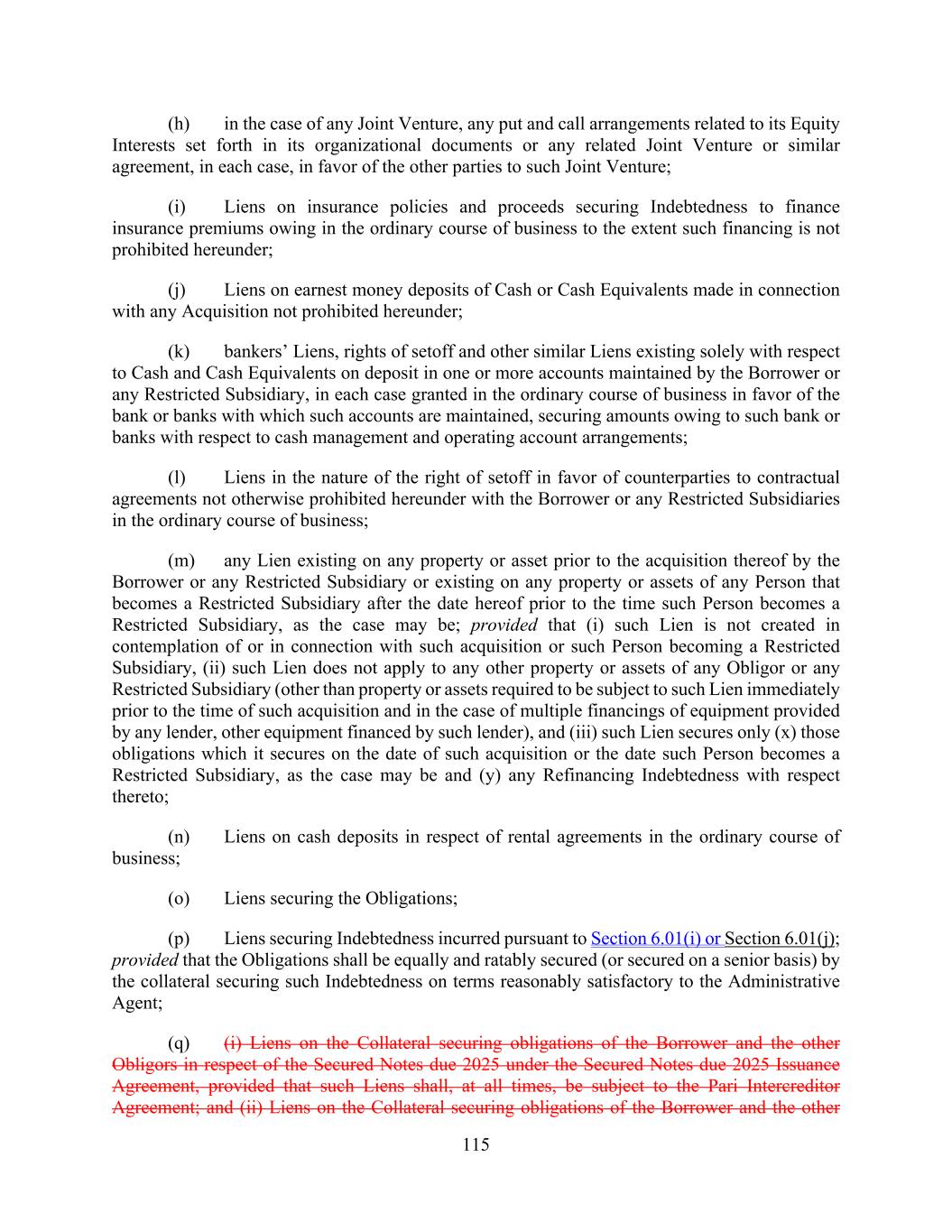 115 (h) in the case of any Joint Venture, any put and call arrangements related to its Equity Interests set forth in its organizational documents or any related Joint Venture or similar agreement, in each case, in favor of the other parties to such Joint Venture; (i) Liens on insurance policies and proceeds securing Indebtedness to finance insurance premiums owing in the ordinary course of business to the extent such financing is not prohibited hereunder; (j) Liens on earnest money deposits of Cash or Cash Equivalents made in connection with any Acquisition not prohibited hereunder; (k) bankers’ Liens, rights of setoff and other similar Liens existing solely with respect to Cash and Cash Equivalents on deposit in one or more accounts maintained by the Borrower or any Restricted Subsidiary, in each case granted in the ordinary course of business in favor of the bank or banks with which such accounts are maintained, securing amounts owing to such bank or banks with respect to cash management and operating account arrangements; (l) Liens in the nature of the right of setoff in favor of counterparties to contractual agreements not otherwise prohibited hereunder with the Borrower or any Restricted Subsidiaries in the ordinary course of business; (m) any Lien existing on any property or asset prior to the acquisition thereof by the Borrower or any Restricted Subsidiary or existing on any property or assets of any Person that becomes a Restricted Subsidiary after the date hereof prior to the time such Person becomes a Restricted Subsidiary, as the case may be; provided that (i) such Lien is not created in contemplation of or in connection with such acquisition or such Person becoming a Restricted Subsidiary, (ii) such Lien does not apply to any other property or assets of any Obligor or any Restricted Subsidiary (other than property or assets required to be subject to such Lien immediately prior to the time of such acquisition and in the case of multiple financings of equipment provided by any lender, other equipment financed by such lender), and (iii) such Lien secures only (x) those obligations which it secures on the date of such acquisition or the date such Person becomes a Restricted Subsidiary, as the case may be and (y) any Refinancing Indebtedness with respect thereto; (n) Liens on cash deposits in respect of rental agreements in the ordinary course of business; (o) Liens securing the Obligations; (p) Liens securing Indebtedness incurred pursuant to Section 6.01(i) or Section 6.01(j); provided that the Obligations shall be equally and ratably secured (or secured on a senior basis) by the collateral securing such Indebtedness on terms reasonably satisfactory to the Administrative Agent; (q) (i) Liens on the Collateral securing obligations of the Borrower and the other Obligors in respect of the Secured Notes due 2025 under the Secured Notes due 2025 Issuance Agreement, provided that such Liens shall, at all times, be subject to the Pari Intercreditor Agreement; and (ii) Liens on the Collateral securing obligations of the Borrower and the other