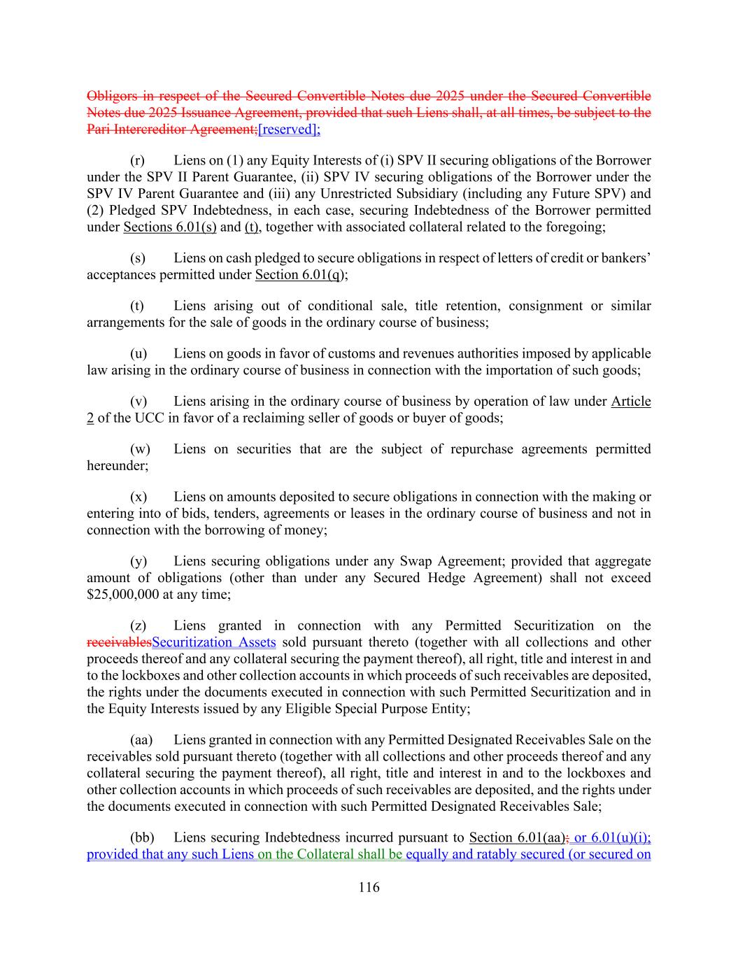 116 Obligors in respect of the Secured Convertible Notes due 2025 under the Secured Convertible Notes due 2025 Issuance Agreement, provided that such Liens shall, at all times, be subject to the Pari Intercreditor Agreement;[reserved]; (r) Liens on (1) any Equity Interests of (i) SPV II securing obligations of the Borrower under the SPV II Parent Guarantee, (ii) SPV IV securing obligations of the Borrower under the SPV IV Parent Guarantee and (iii) any Unrestricted Subsidiary (including any Future SPV) and (2) Pledged SPV Indebtedness, in each case, securing Indebtedness of the Borrower permitted under Sections 6.01(s) and (t), together with associated collateral related to the foregoing; (s) Liens on cash pledged to secure obligations in respect of letters of credit or bankers’ acceptances permitted under Section 6.01(q); (t) Liens arising out of conditional sale, title retention, consignment or similar arrangements for the sale of goods in the ordinary course of business; (u) Liens on goods in favor of customs and revenues authorities imposed by applicable law arising in the ordinary course of business in connection with the importation of such goods; (v) Liens arising in the ordinary course of business by operation of law under Article 2 of the UCC in favor of a reclaiming seller of goods or buyer of goods; (w) Liens on securities that are the subject of repurchase agreements permitted hereunder; (x) Liens on amounts deposited to secure obligations in connection with the making or entering into of bids, tenders, agreements or leases in the ordinary course of business and not in connection with the borrowing of money; (y) Liens securing obligations under any Swap Agreement; provided that aggregate amount of obligations (other than under any Secured Hedge Agreement) shall not exceed $25,000,000 at any time; (z) Liens granted in connection with any Permitted Securitization on the receivablesSecuritization Assets sold pursuant thereto (together with all collections and other proceeds thereof and any collateral securing the payment thereof), all right, title and interest in and to the lockboxes and other collection accounts in which proceeds of such receivables are deposited, the rights under the documents executed in connection with such Permitted Securitization and in the Equity Interests issued by any Eligible Special Purpose Entity; (aa) Liens granted in connection with any Permitted Designated Receivables Sale on the receivables sold pursuant thereto (together with all collections and other proceeds thereof and any collateral securing the payment thereof), all right, title and interest in and to the lockboxes and other collection accounts in which proceeds of such receivables are deposited, and the rights under the documents executed in connection with such Permitted Designated Receivables Sale; (bb) Liens securing Indebtedness incurred pursuant to Section 6.01(aa); or 6.01(u)(i); provided that any such Liens on the Collateral shall be equally and ratably secured (or secured on