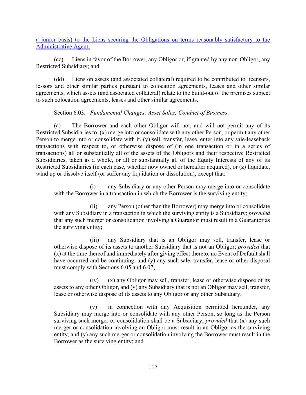 117 a junior basis) to the Liens securing the Obligations on terms reasonably satisfactory to the Administrative Agent; (cc) Liens in favor of the Borrower, any Obligor or, if granted by any non-Obligor, any Restricted Subsidiary; and (dd) Liens on assets (and associated collateral) required to be contributed to licensors, lessors and other similar parties pursuant to colocation agreements, leases and other similar agreements, which assets (and associated collateral) relate to the build-out of the premises subject to such colocation agreements, leases and other similar agreements. Section 6.03. Fundamental Changes; Asset Sales; Conduct of Business. (a) The Borrower and each other Obligor will not, and will not permit any of its Restricted Subsidiaries to, (x) merge into or consolidate with any other Person, or permit any other Person to merge into or consolidate with it, (y) sell, transfer, lease, enter into any sale-leaseback transactions with respect to, or otherwise dispose of (in one transaction or in a series of transactions) all or substantially all of the assets of the Obligors and their respective Restricted Subsidiaries, taken as a whole, or all or substantially all of the Equity Interests of any of its Restricted Subsidiaries (in each case, whether now owned or hereafter acquired), or (z) liquidate, wind up or dissolve itself (or suffer any liquidation or dissolution), except that: (i) any Subsidiary or any other Person may merge into or consolidate with the Borrower in a transaction in which the Borrower is the surviving entity; (ii) any Person (other than the Borrower) may merge into or consolidate with any Subsidiary in a transaction in which the surviving entity is a Subsidiary; provided that any such merger or consolidation involving a Guarantor must result in a Guarantor as the surviving entity; (iii) any Subsidiary that is an Obligor may sell, transfer, lease or otherwise dispose of its assets to another Subsidiary that is not an Obligor; provided that (x) at the time thereof and immediately after giving effect thereto, no Event of Default shall have occurred and be continuing, and (y) any such sale, transfer, lease or other disposal must comply with Sections 6.05 and 6.07; (iv) (x) any Obligor may sell, transfer, lease or otherwise dispose of its assets to any other Obligor, and (y) any Subsidiary that is not an Obligor may sell, transfer, lease or otherwise dispose of its assets to any Obligor or any other Subsidiary; (v) in connection with any Acquisition permitted hereunder, any Subsidiary may merge into or consolidate with any other Person, so long as the Person surviving such merger or consolidation shall be a Subsidiary; provided that (x) any such merger or consolidation involving an Obligor must result in an Obligor as the surviving entity, and (y) any such merger or consolidation involving the Borrower must result in the Borrower as the surviving entity; and